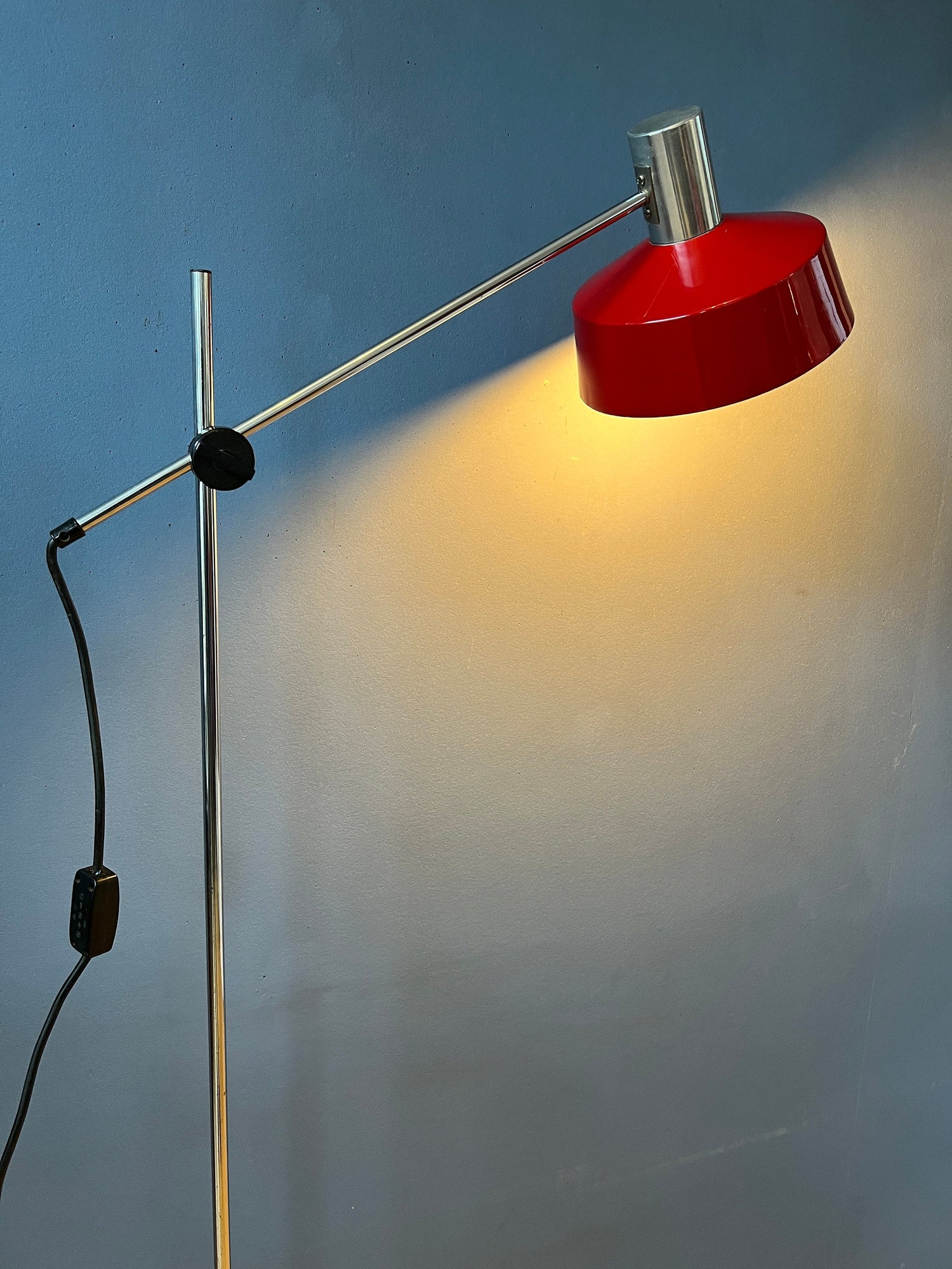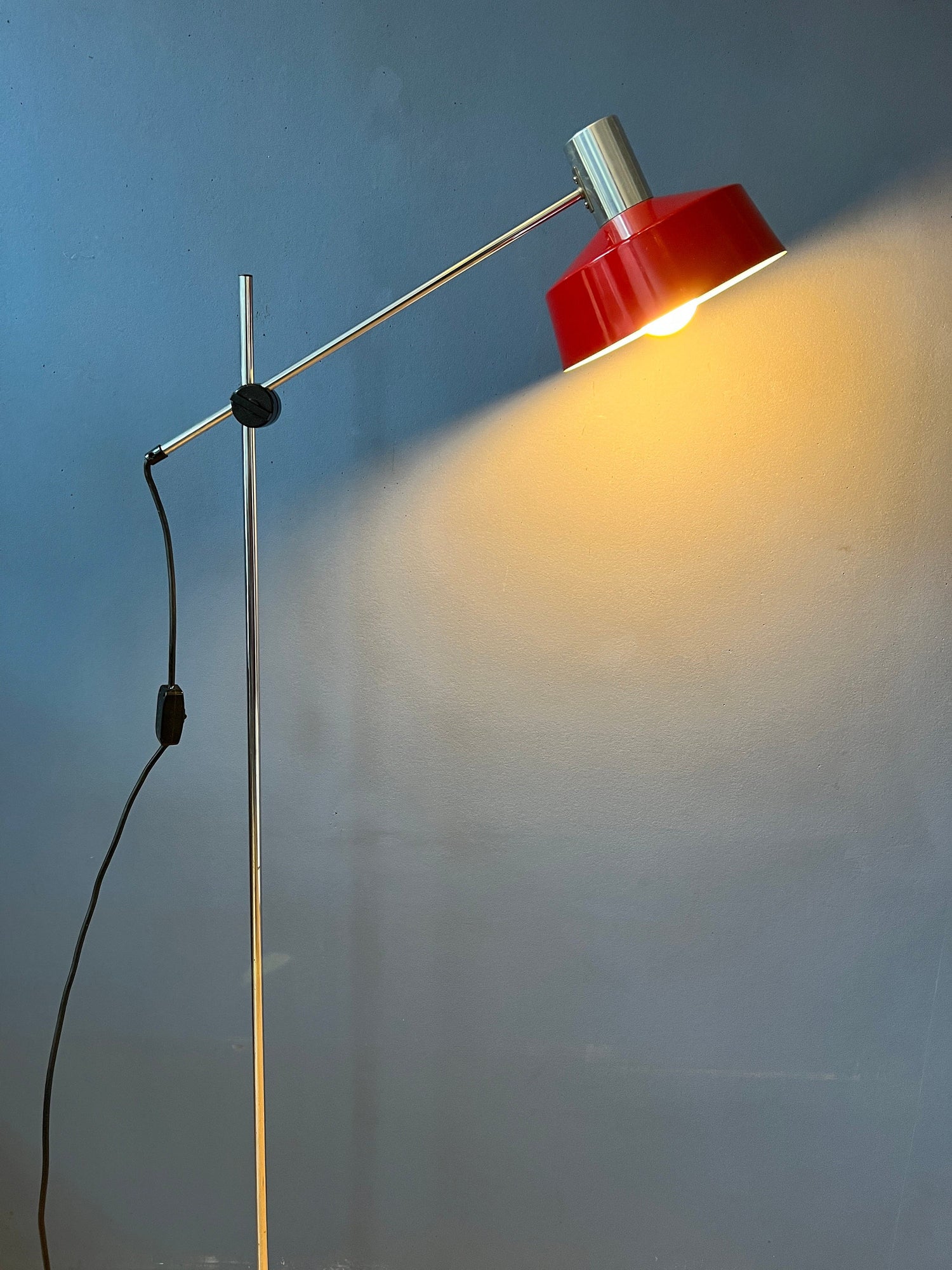 Flexible Anvia 'rod' floor lamp in red colour. The position of both the shade and the arm can easily be adjusted. The lamp has an aluminium shade. The lamp requires one E27 lightbulb and currently has an EU-plug (easily used outside EU with plug-converter).
