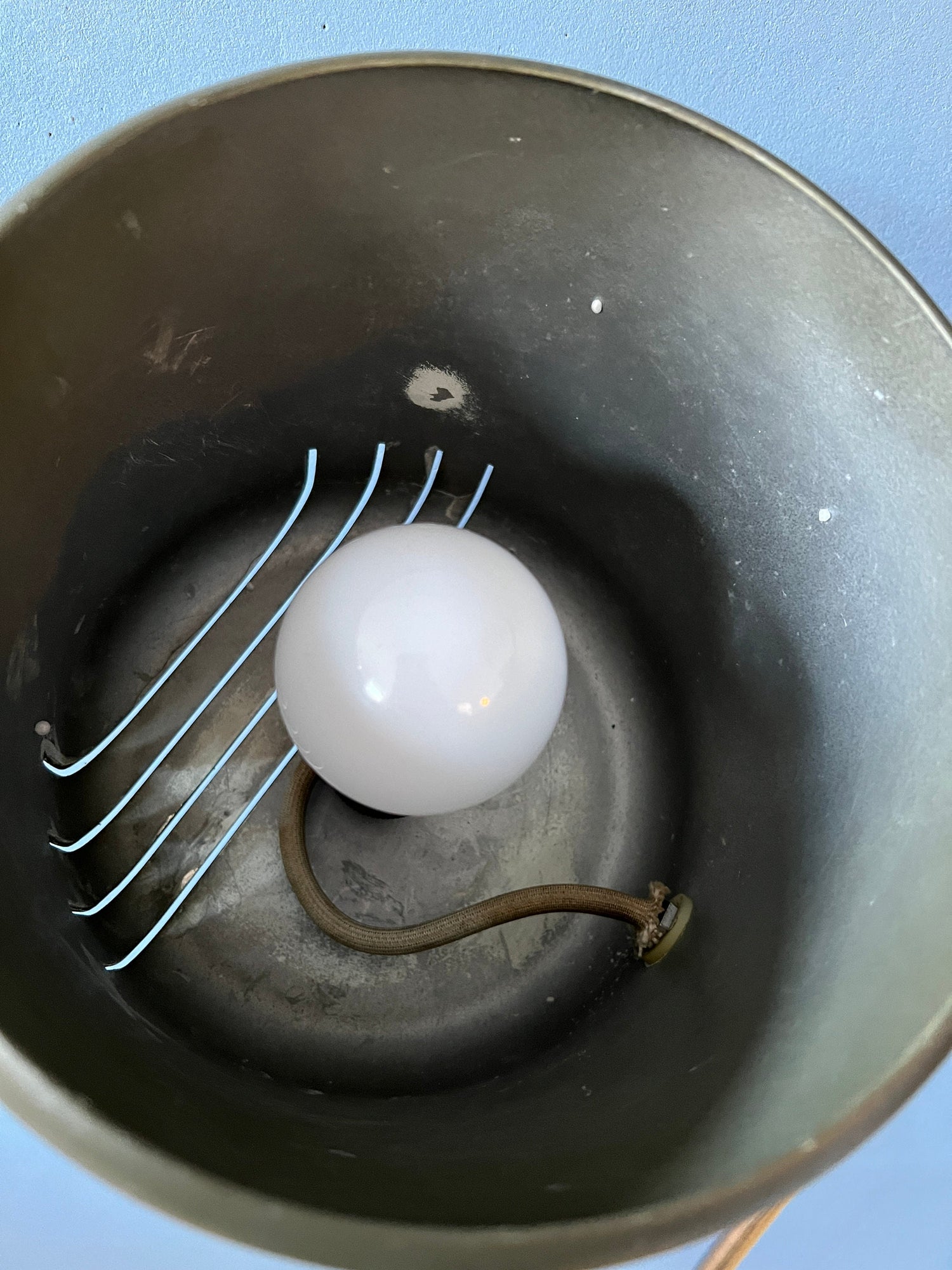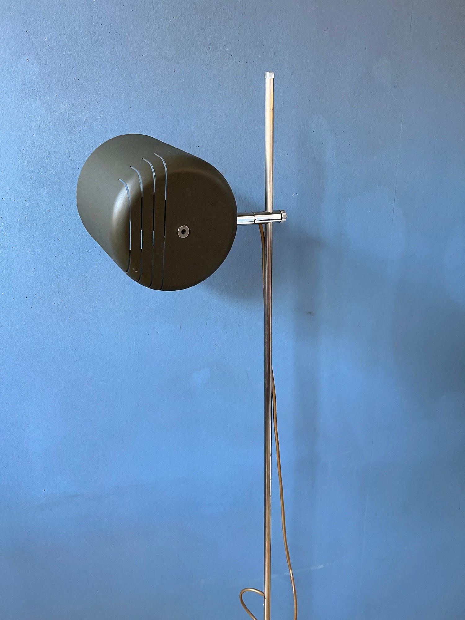 A very special and rare space age floorlamp by Anvia in dark green/gray colour. The light escapes beautifully through the rostered metal shade. The lamp requires one E27 lightbulb and currently has a EU-plug.