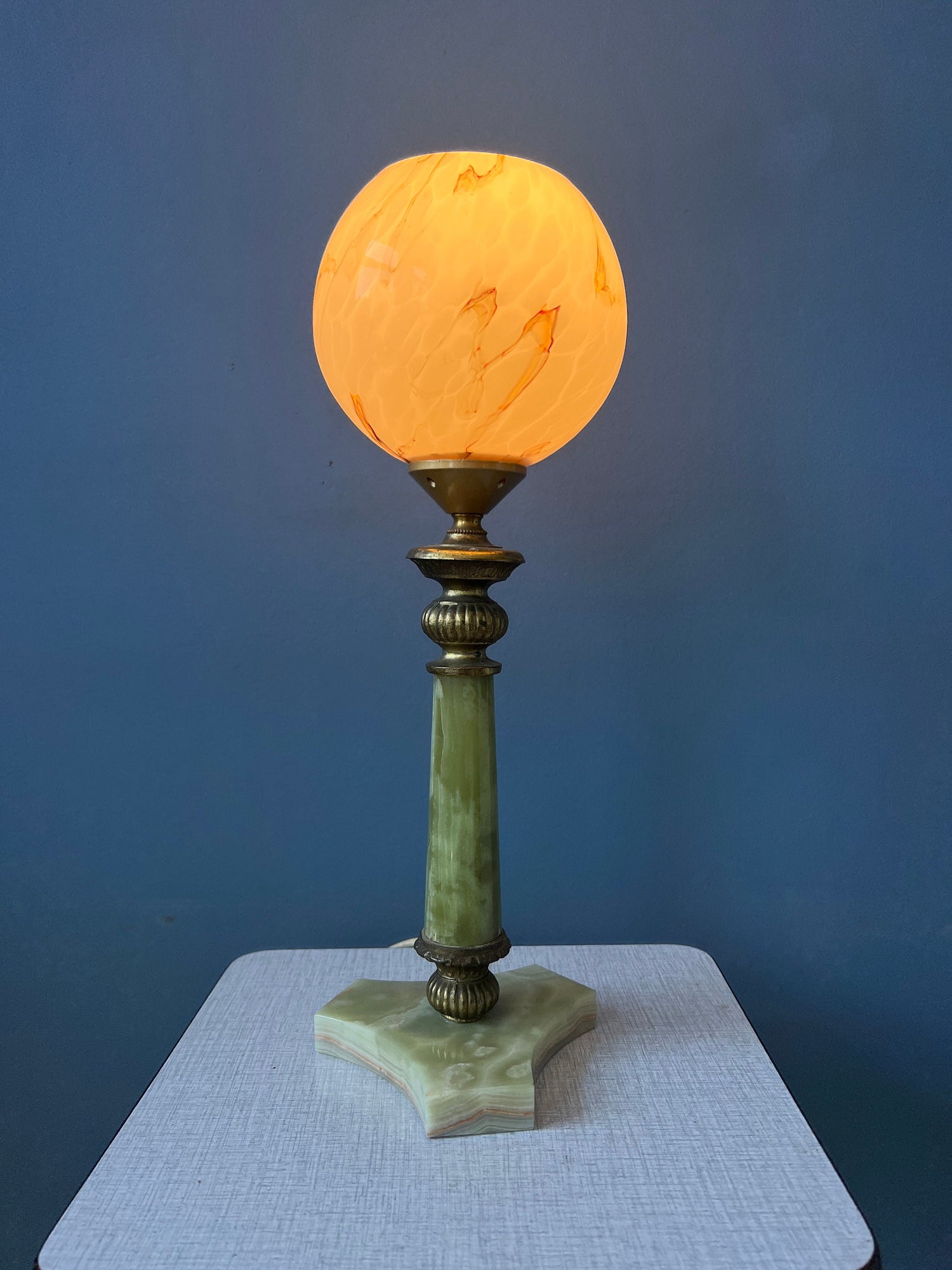Art deco table lamp with pink glass shade and green marble base. The lamp requires one E14 lightbulb and currently has an EU-plug.
