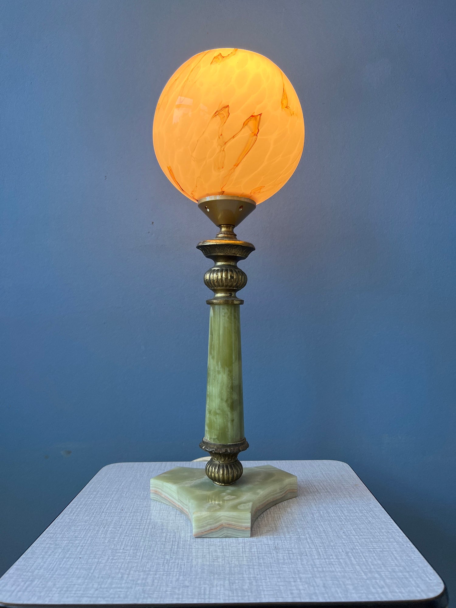 Art Deco Table Lamp - Pink Glass Desk Light - Green Marble Base - Decorative Gold