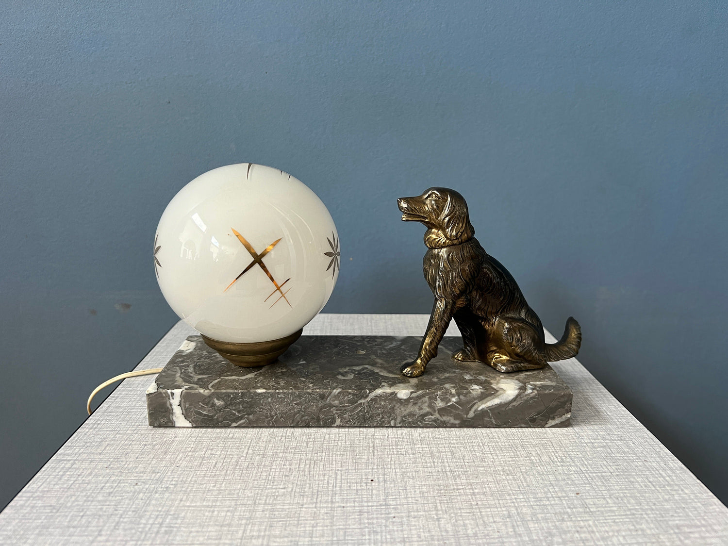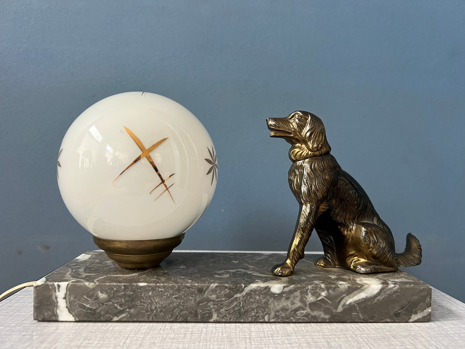 Art deco style table lamp with opaline glass moon-like shade and dog figure. The lamp has a marble base and opaline glass shade. The lamp requires one E14 lightbulb and currently has an EU-plug.