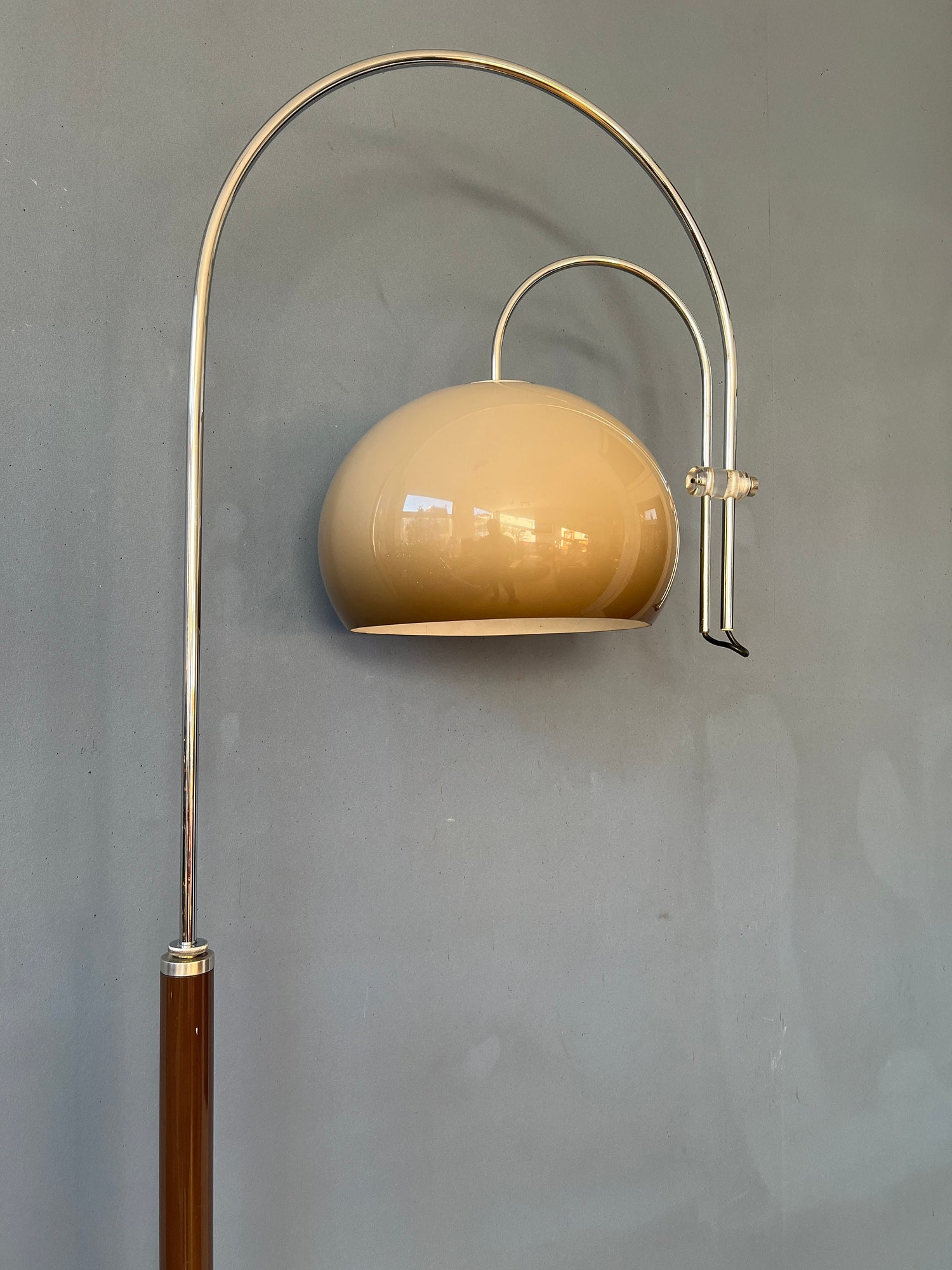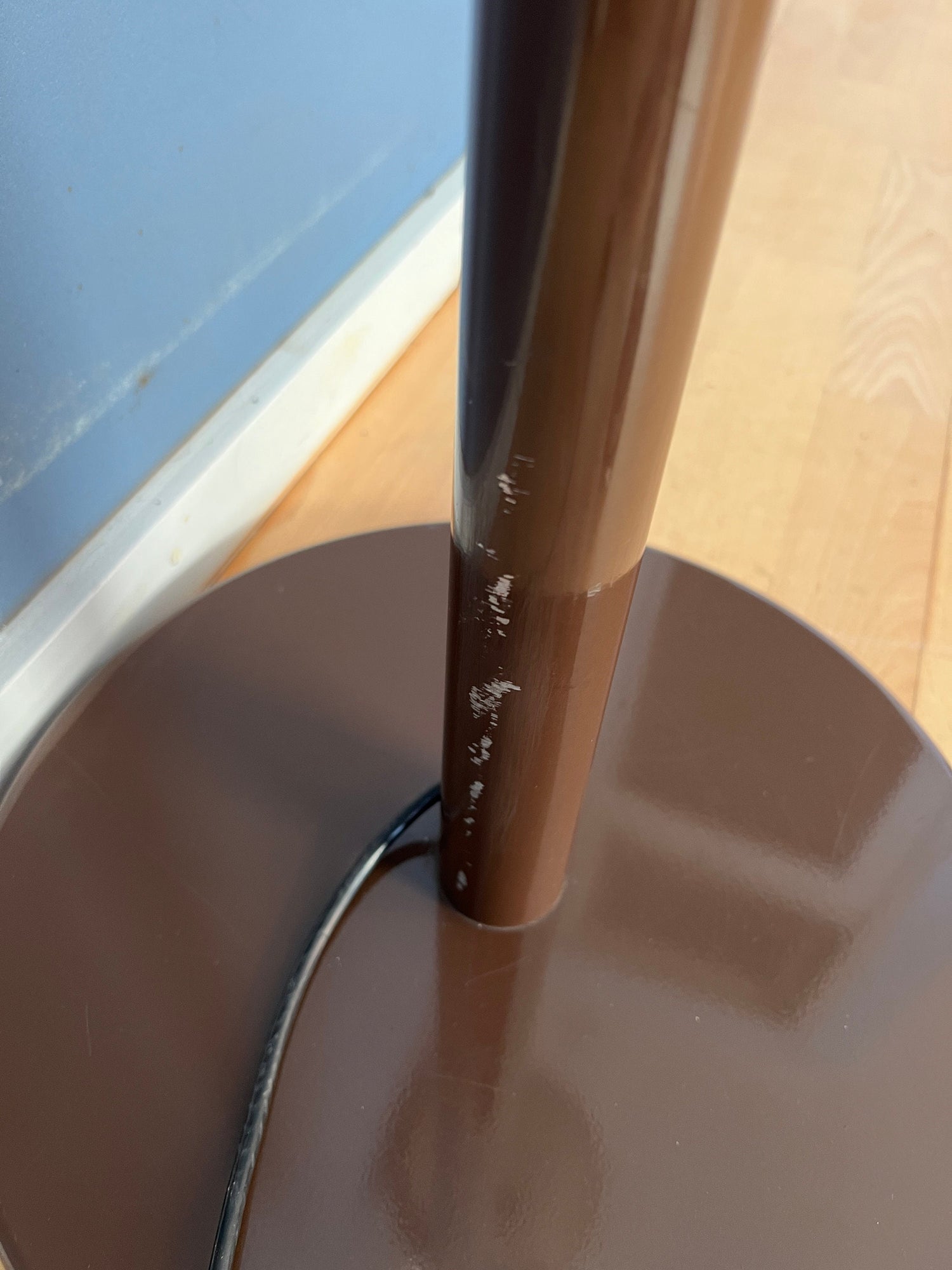 Good. The base and shade are still in very good condition. At one spot there are a few scratches on the brown pole, see last picture. When the height of the lamp is fully extended the, the arc seems to be bend slightly to one side, see pictures.