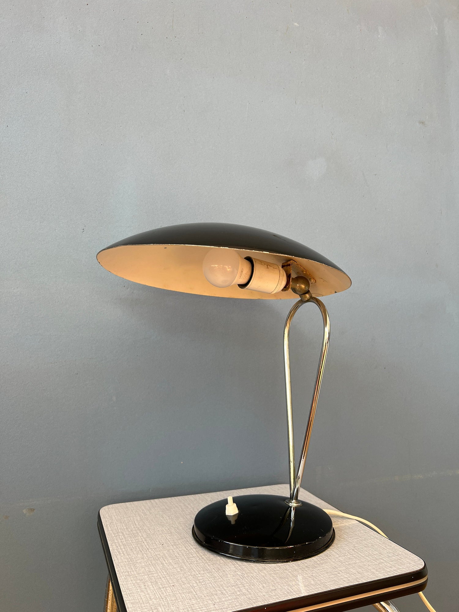 Stylish black bauhaus table lamp. The lamp is made of metal. The shade can be turned upward and downward. The lamps has a switch on the base. It requires a E27/26 bulb.