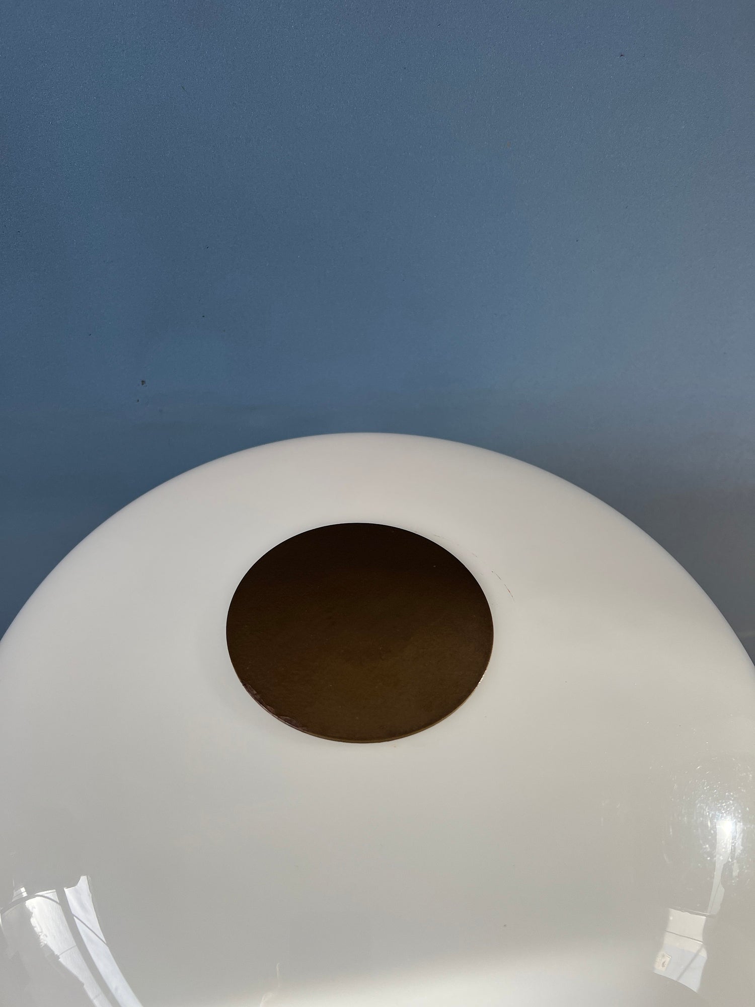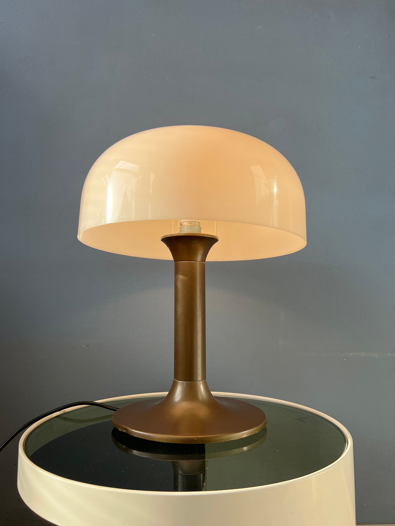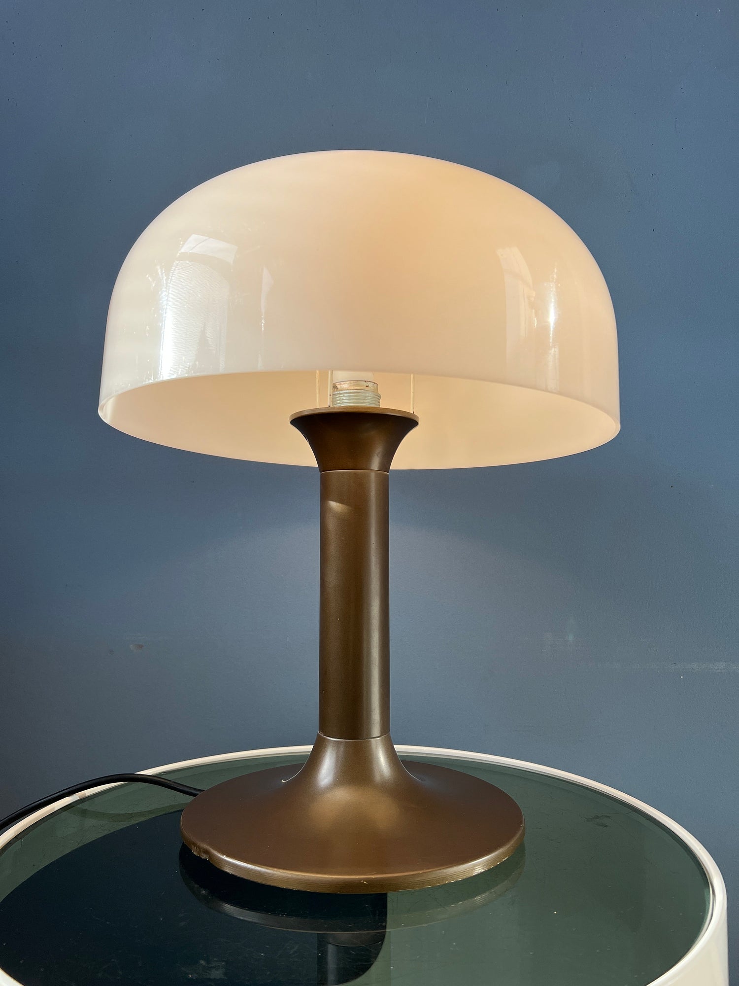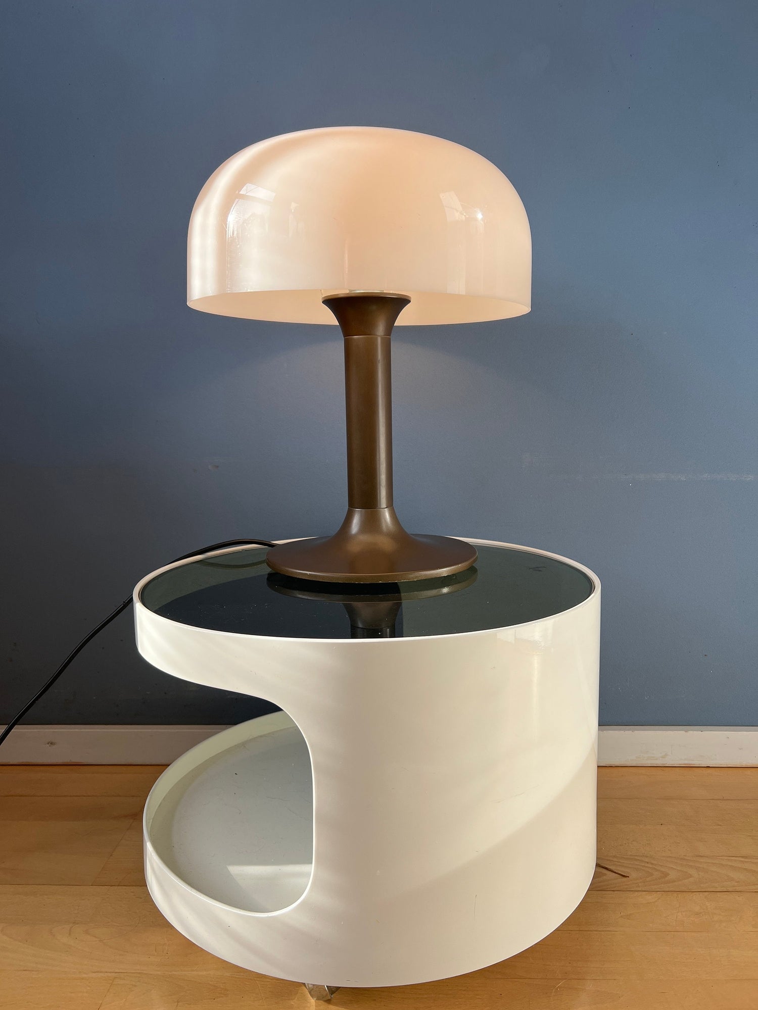 Big space age mushroom table lamp with large white shade and metal base. The acrylic glass mushroom shade produces a nice and warm light. The lamp requires one E27/26 (standard) lightbulb and currently has an EU-plug (can easily be used outside EU with plug-converter).