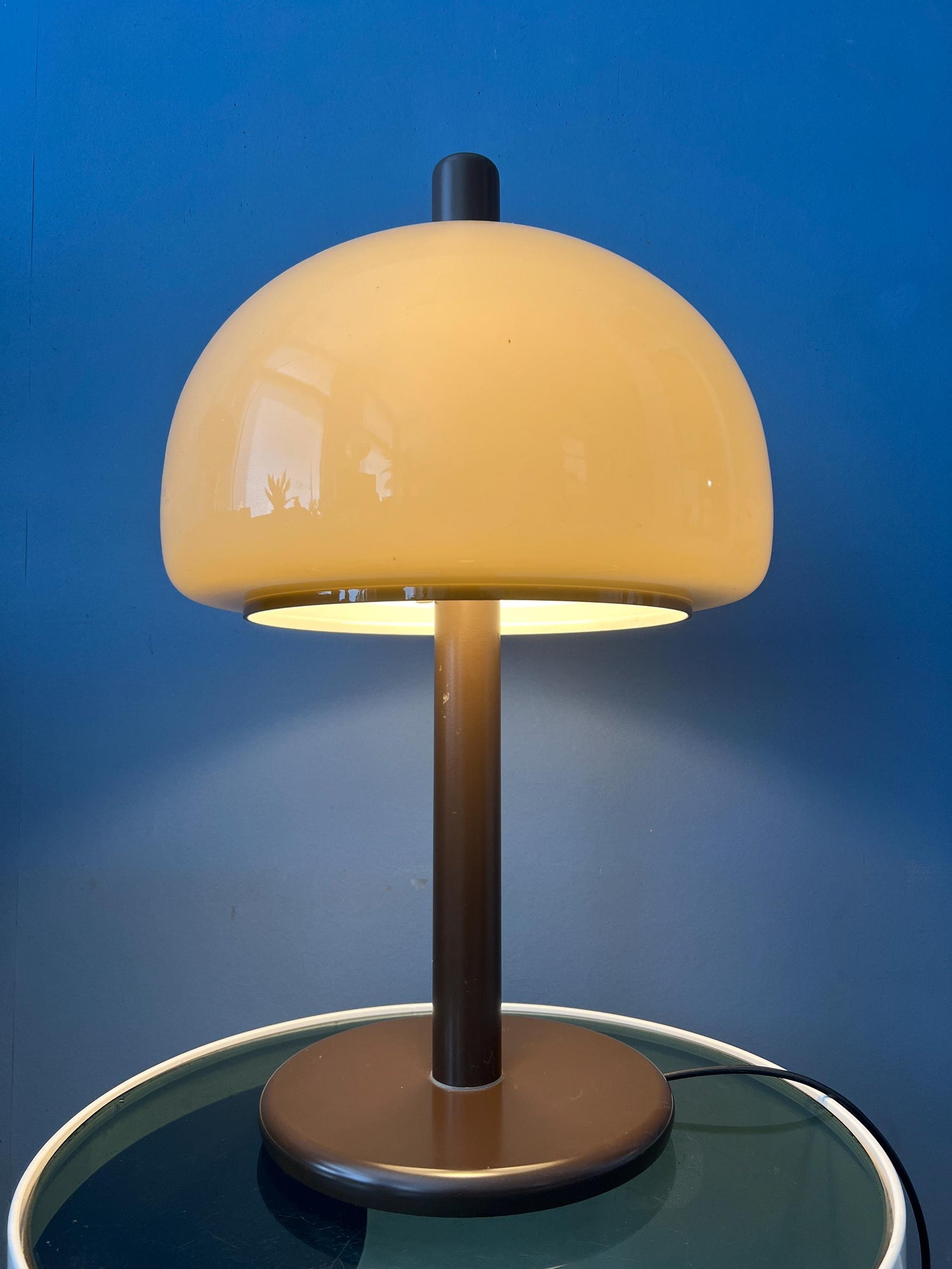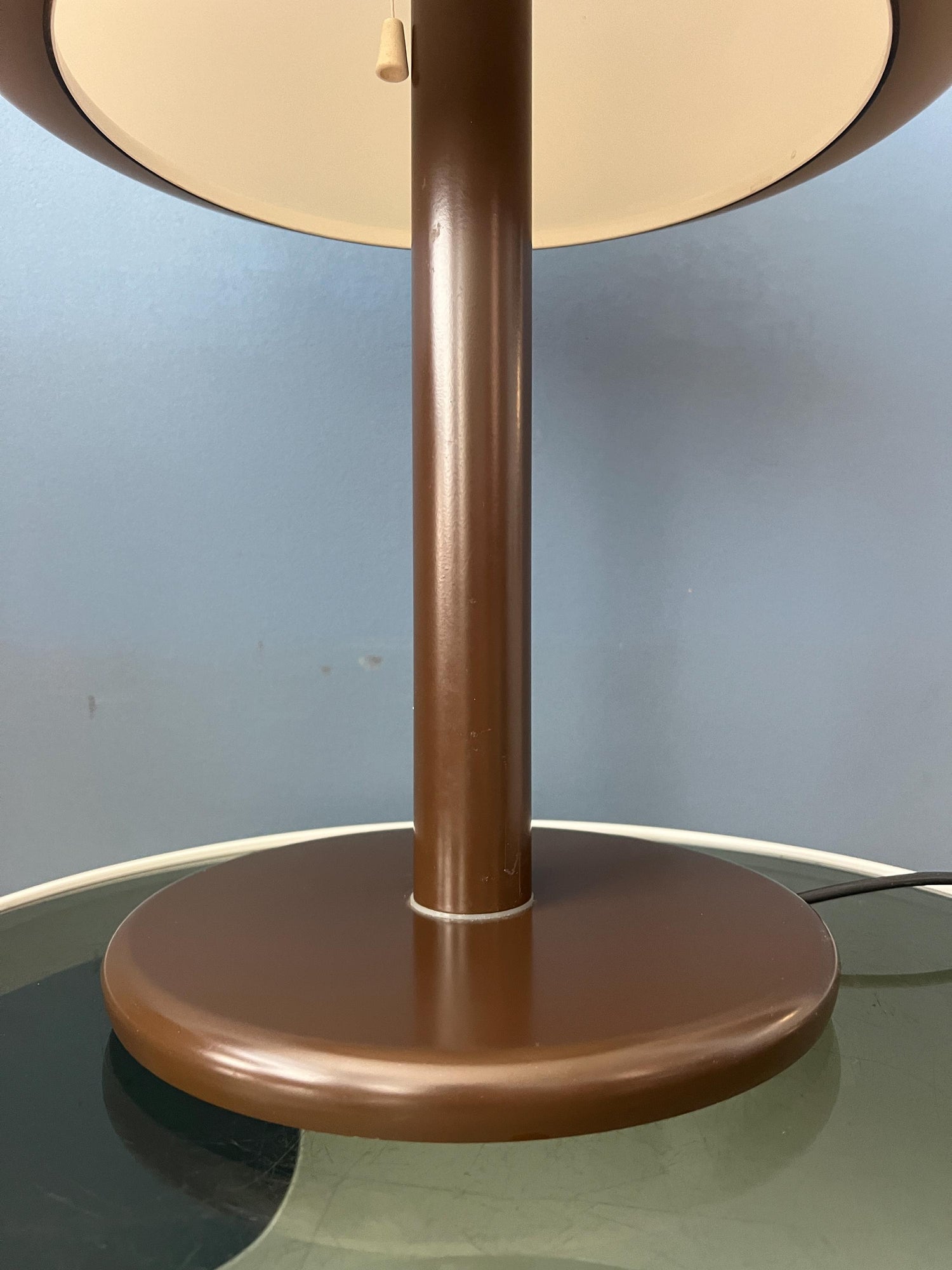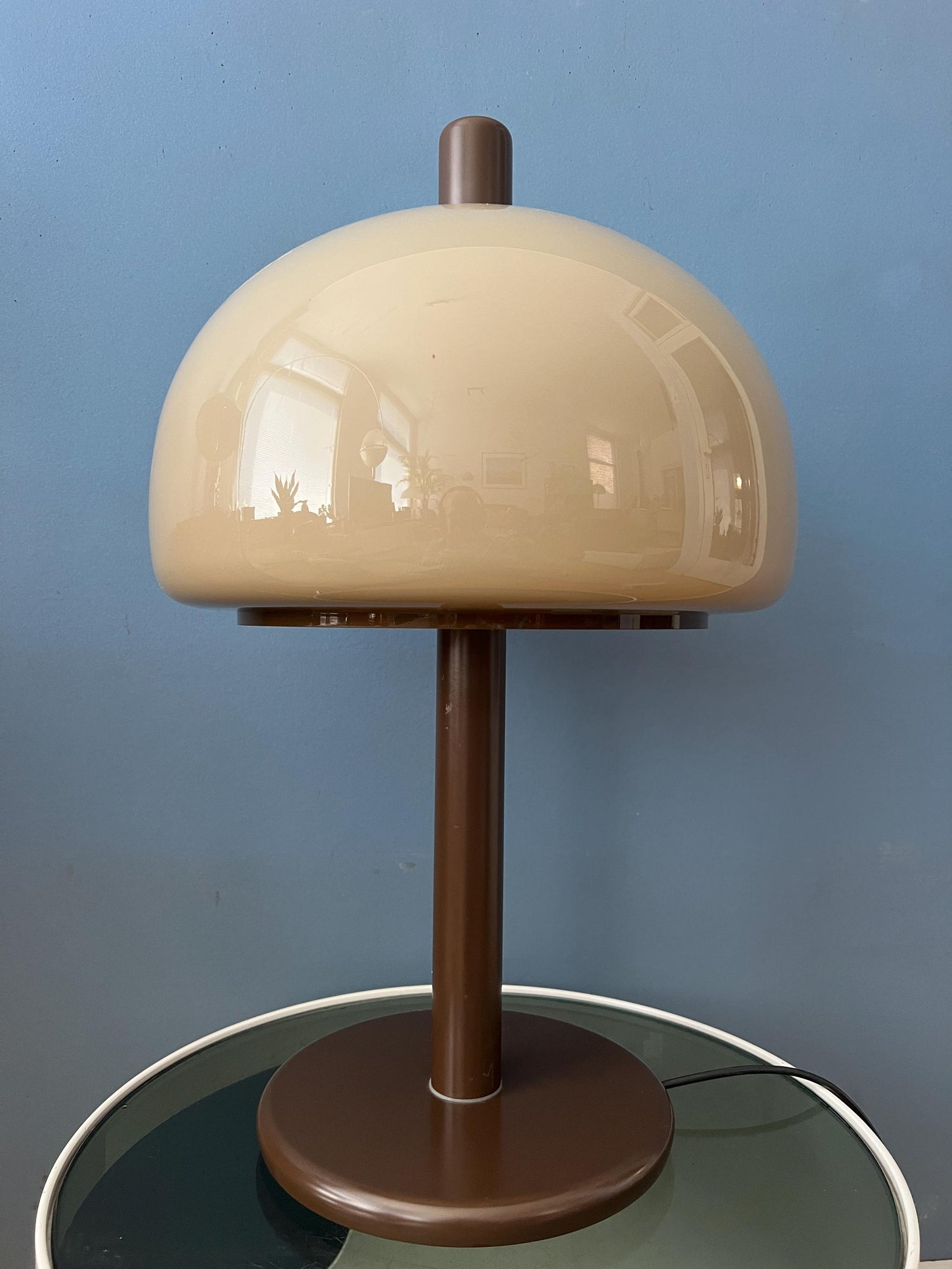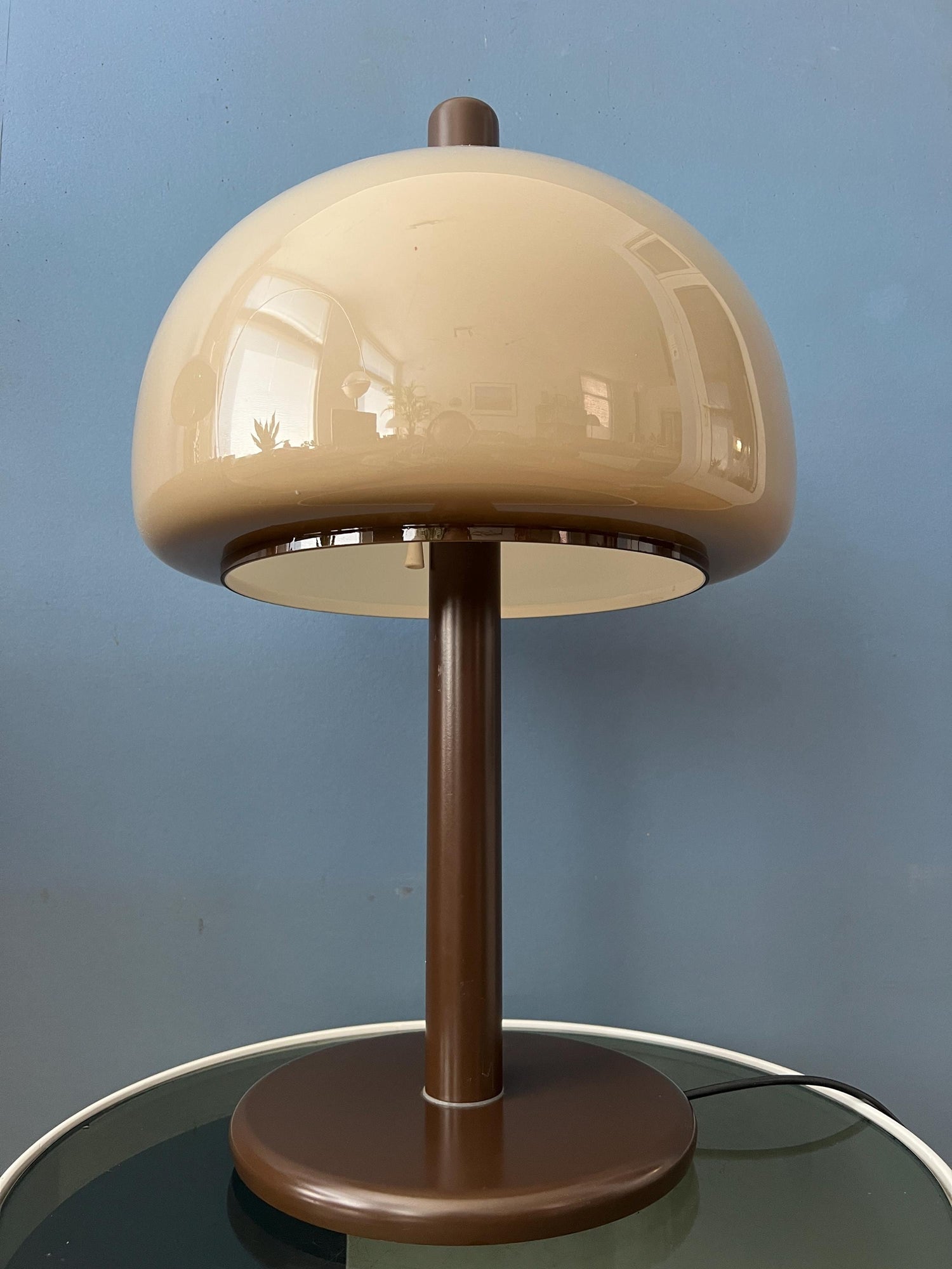 Beautiful big mushroom space age table lamp by Dijkstra with plexiglass shade and brown frame. The acrylic glass mushroom shade produces a nice and warm light. The base is made out of metal and has a brown lacquer. The lamp can be switched on and off by pulling a cord underneath the shade. The lamp requires one E27/26 (standard) lightbulb and currently has an EU-plug (can easily be used outside EU with plug-converter).