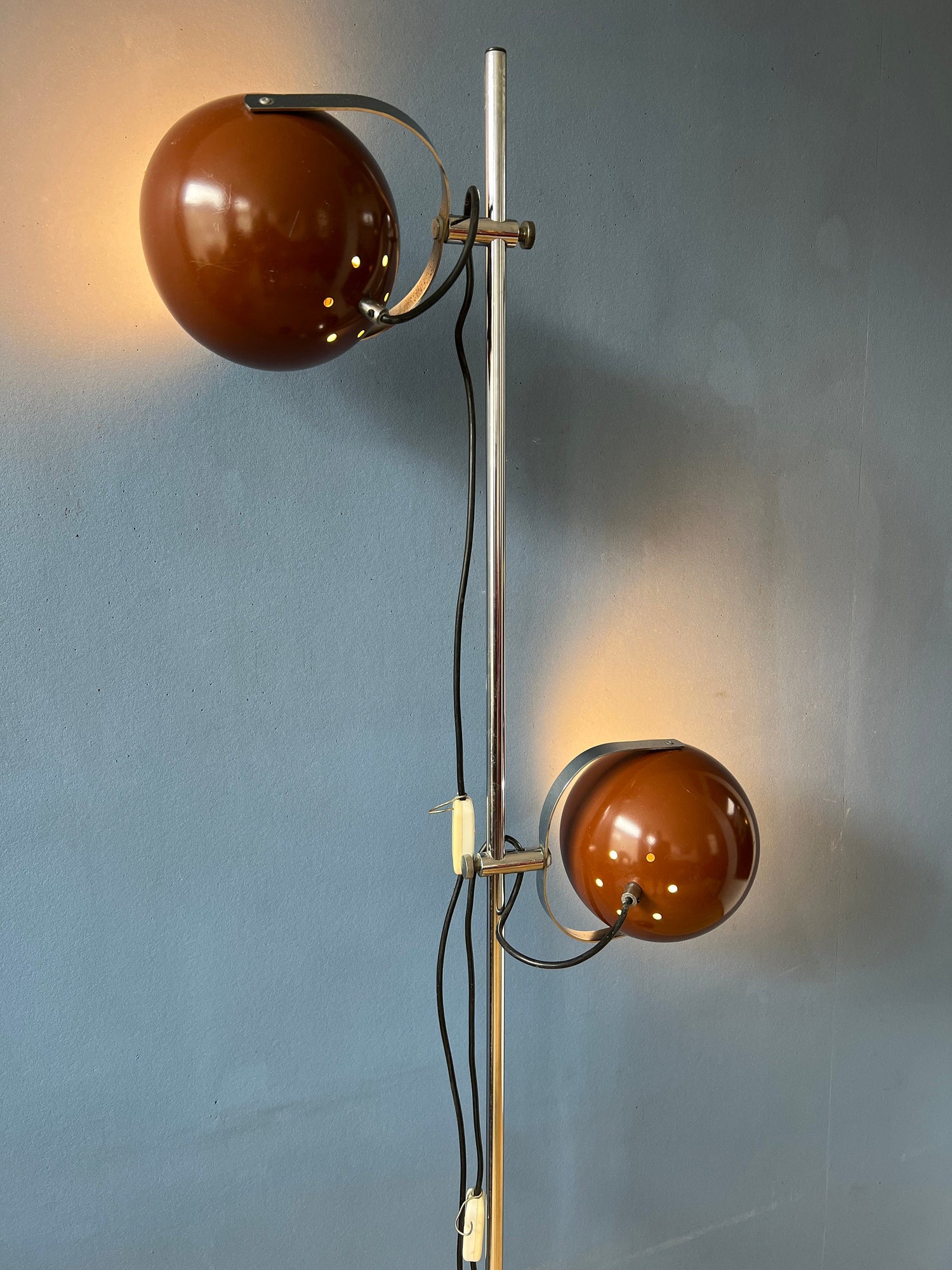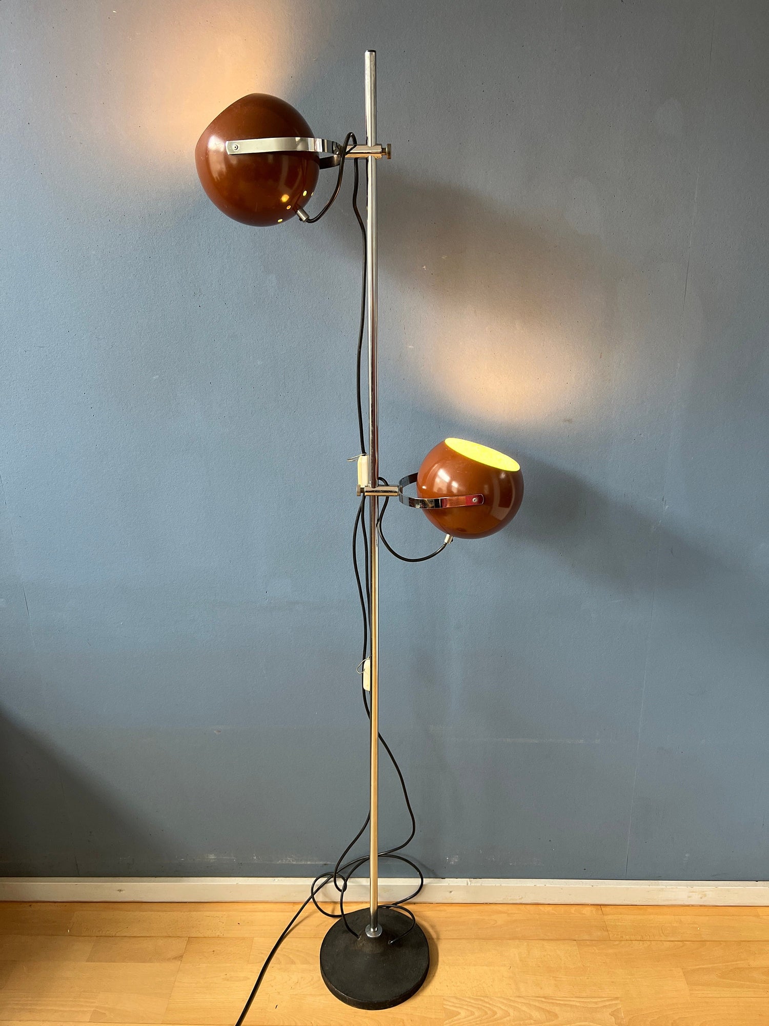 Vintage Herda space age eyeball floor lamp in brown colour. The metal shades can be turned in any way desirable and moved up and down the base. The lights can switched on separately or simultaneously. The lamp requires two E27/26 lightbulbs and currently has a EU-plug.