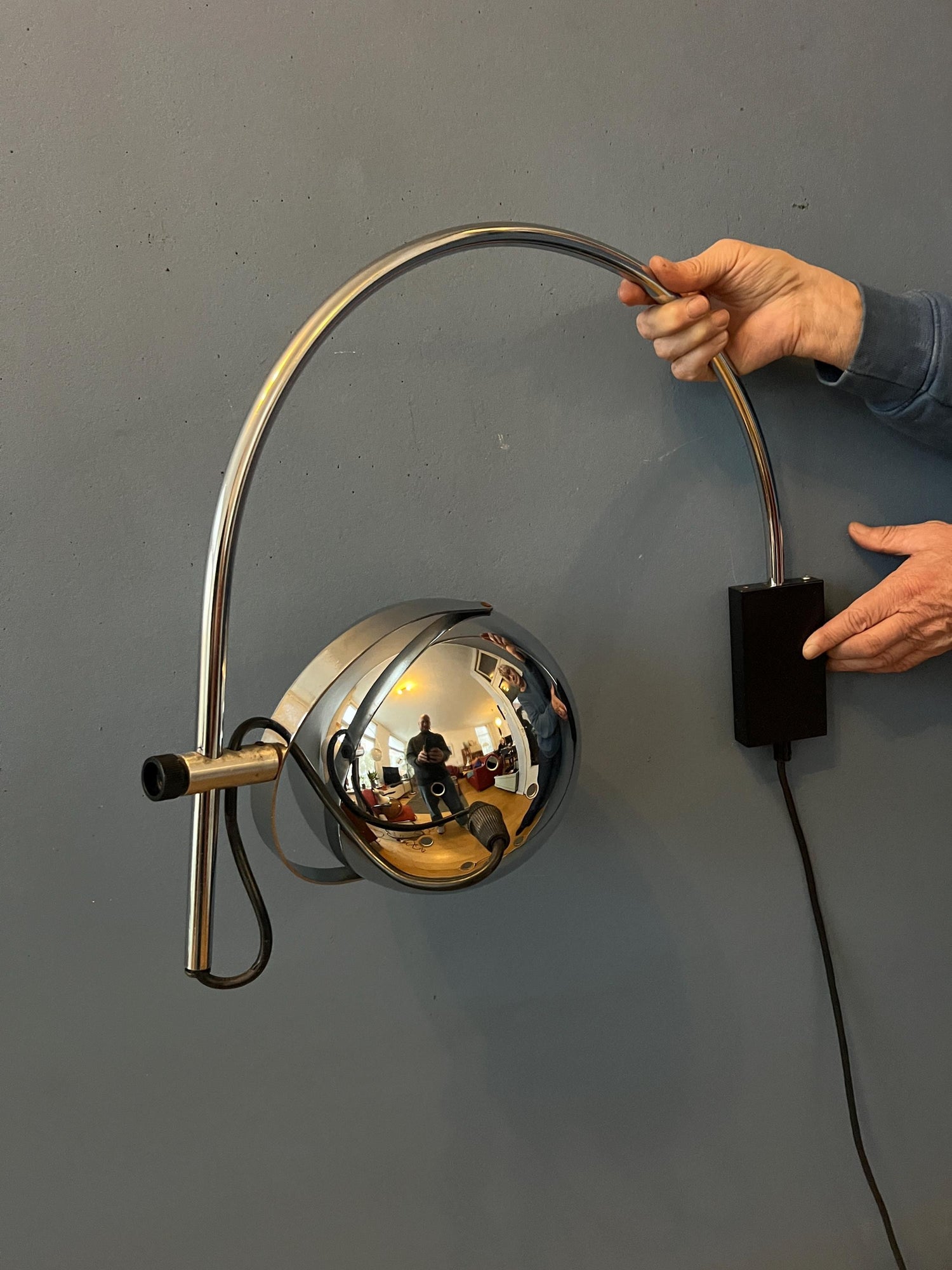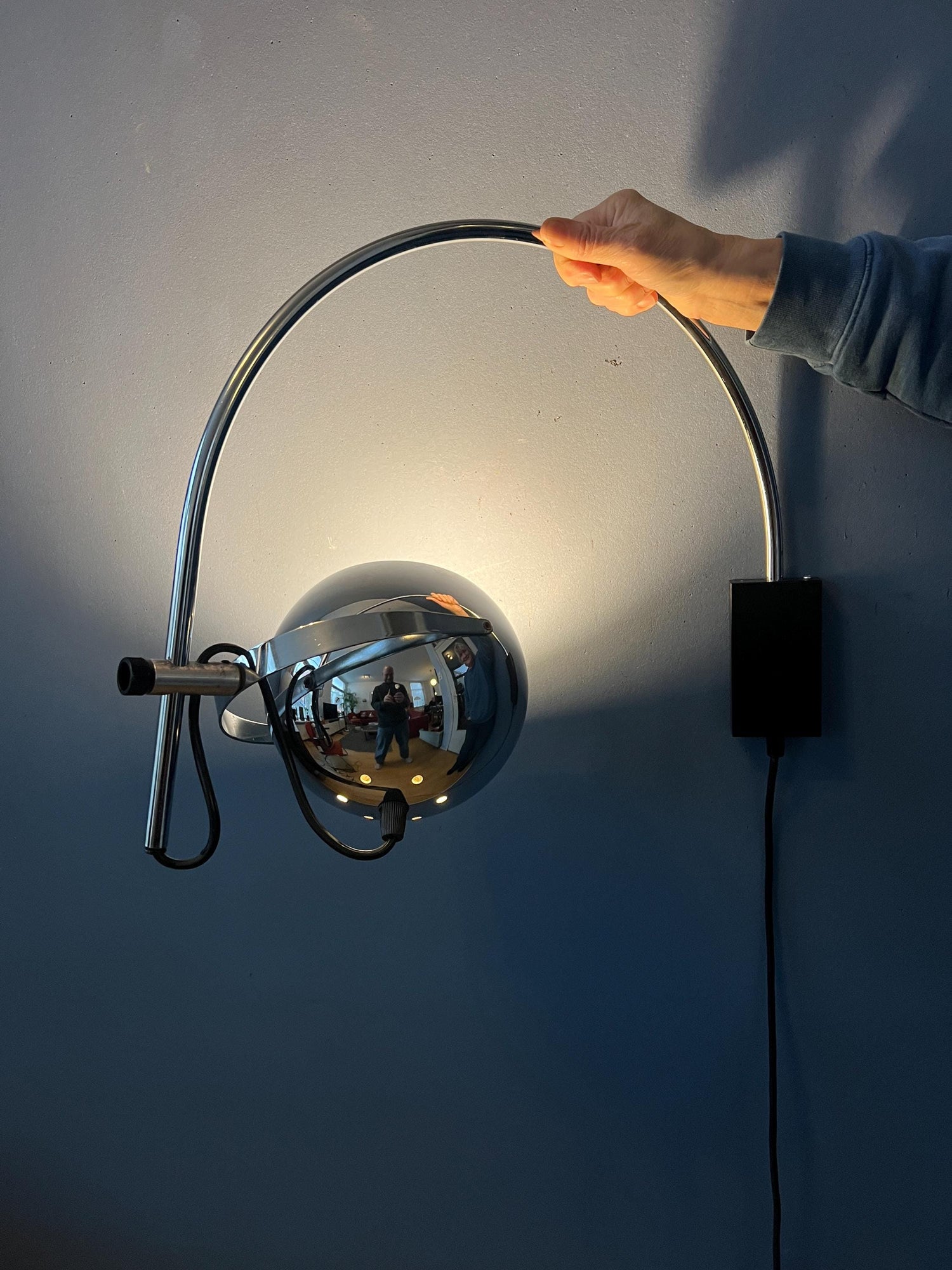 Space age eyeball arc wall lamp by Herda. The chrome shades can be positioned inside or outside the arc and be turned in any direction. The lamp has a switch build into the cable. The lamp requires an E27/26 (standard) lightbulb and currently has an EU-plug.