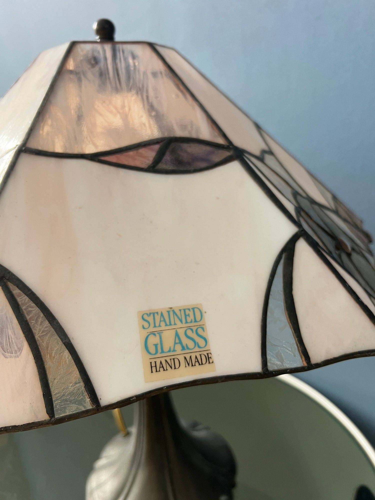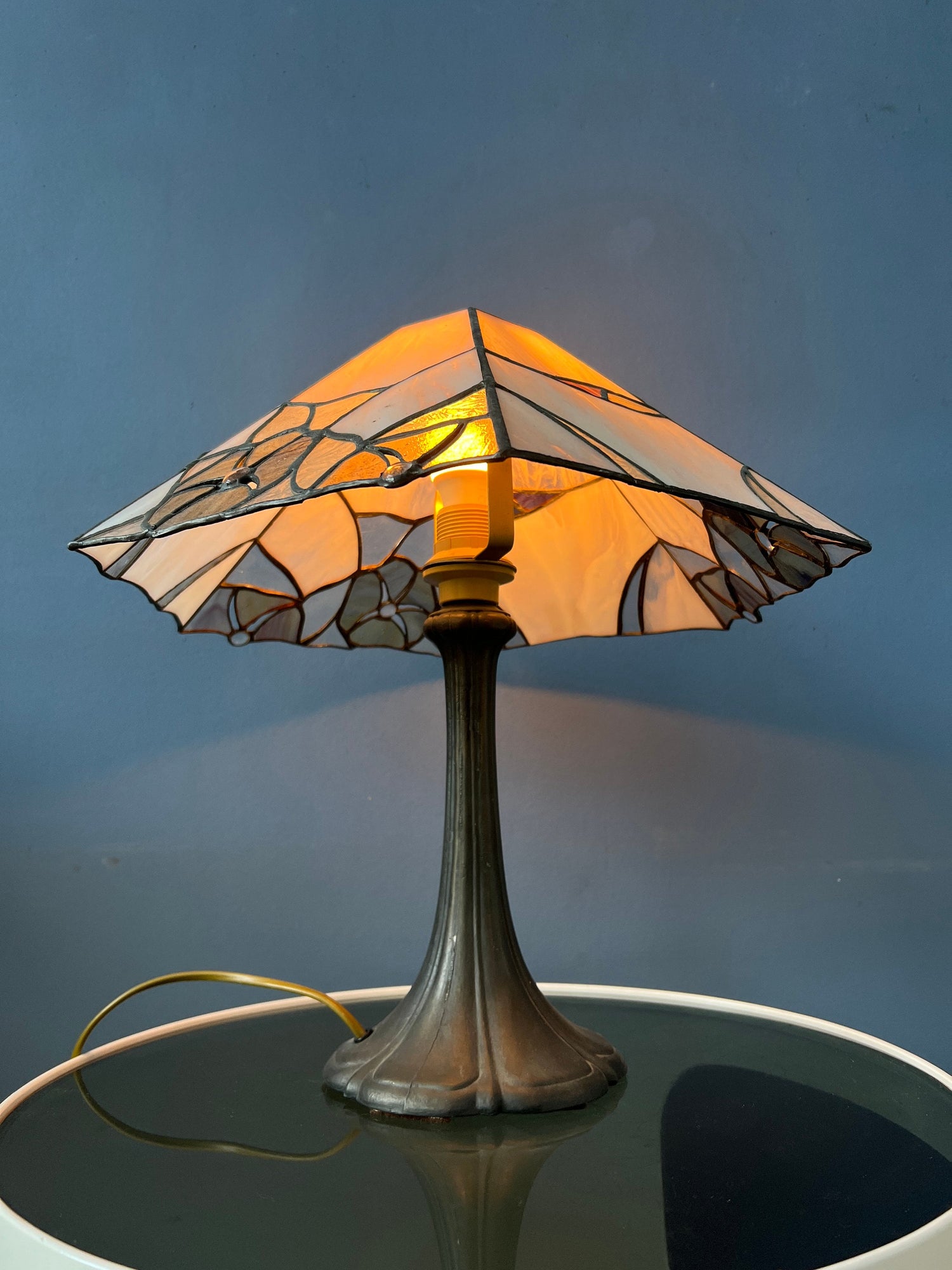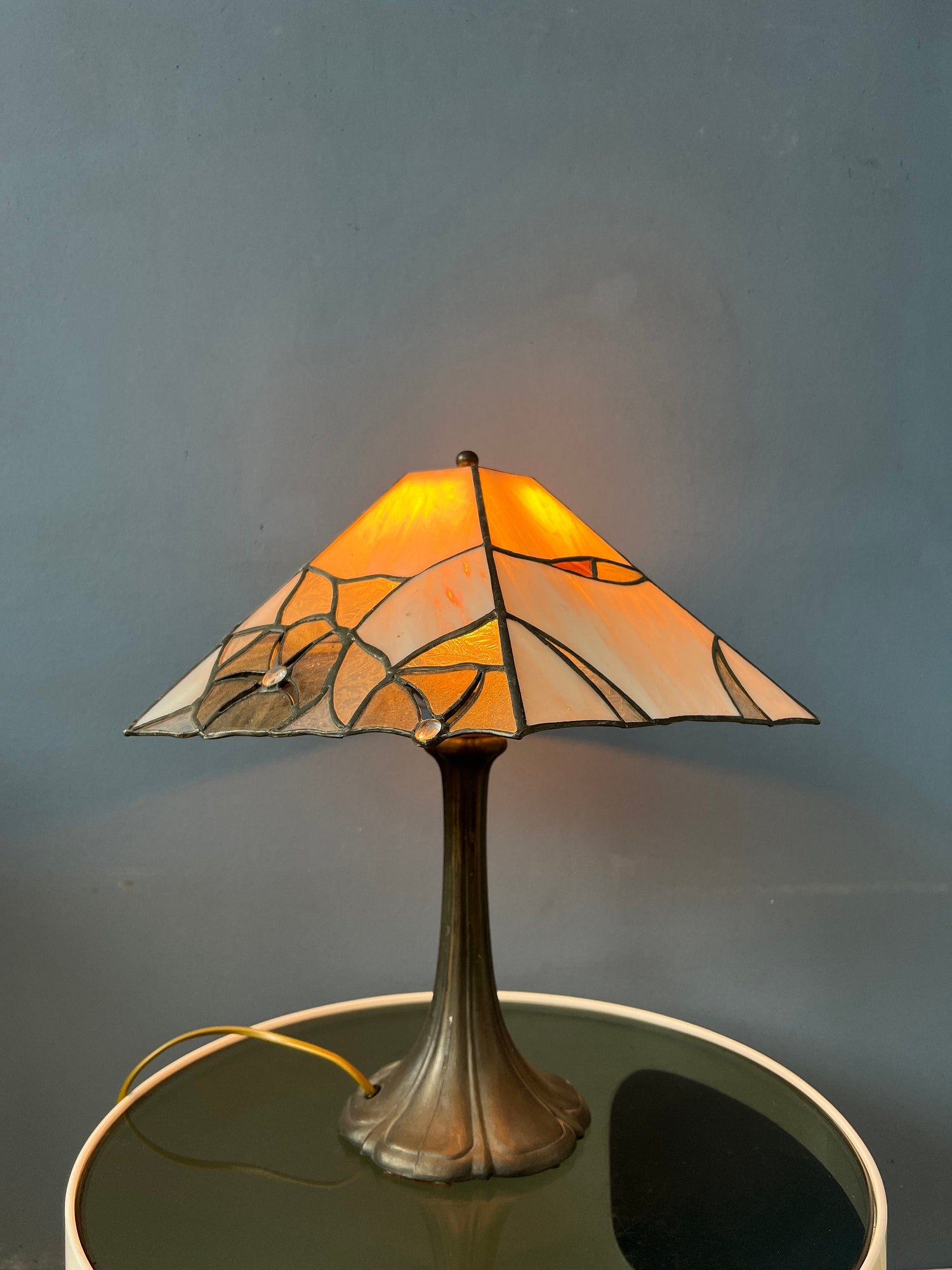 Vintage art deco style table lamp. The base is made out of metal and the shade is made from acrylic glass. The stained glass creates a beautiful light effect. The shade can be taken off the base and positioned in any way desirable. The lamp requires one E27 (standard) lightbulb and currently has an EU-plug (easily used outside EU with plug converter).
