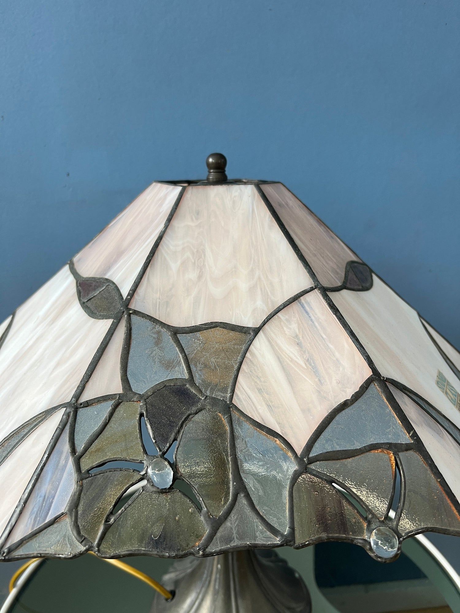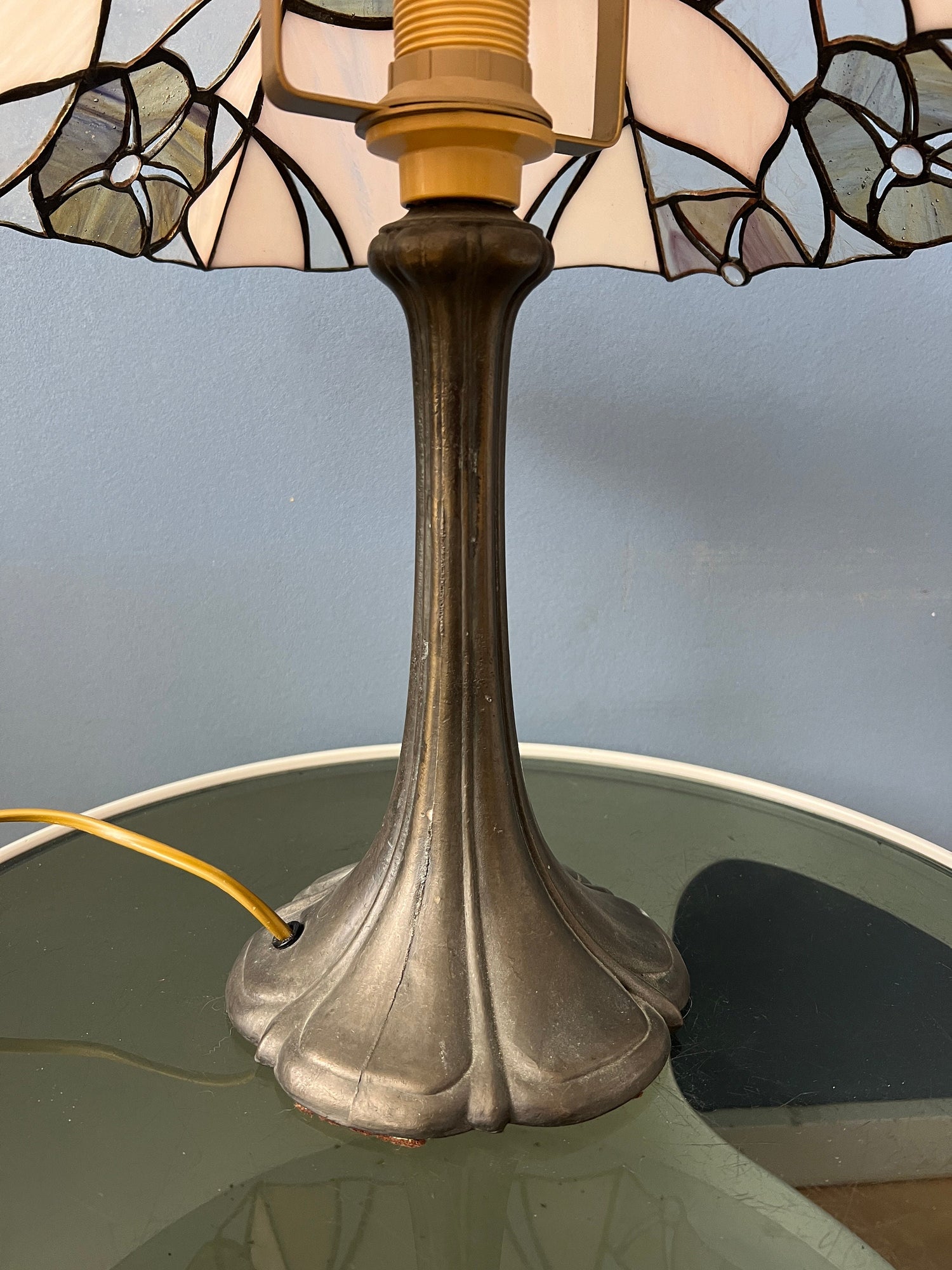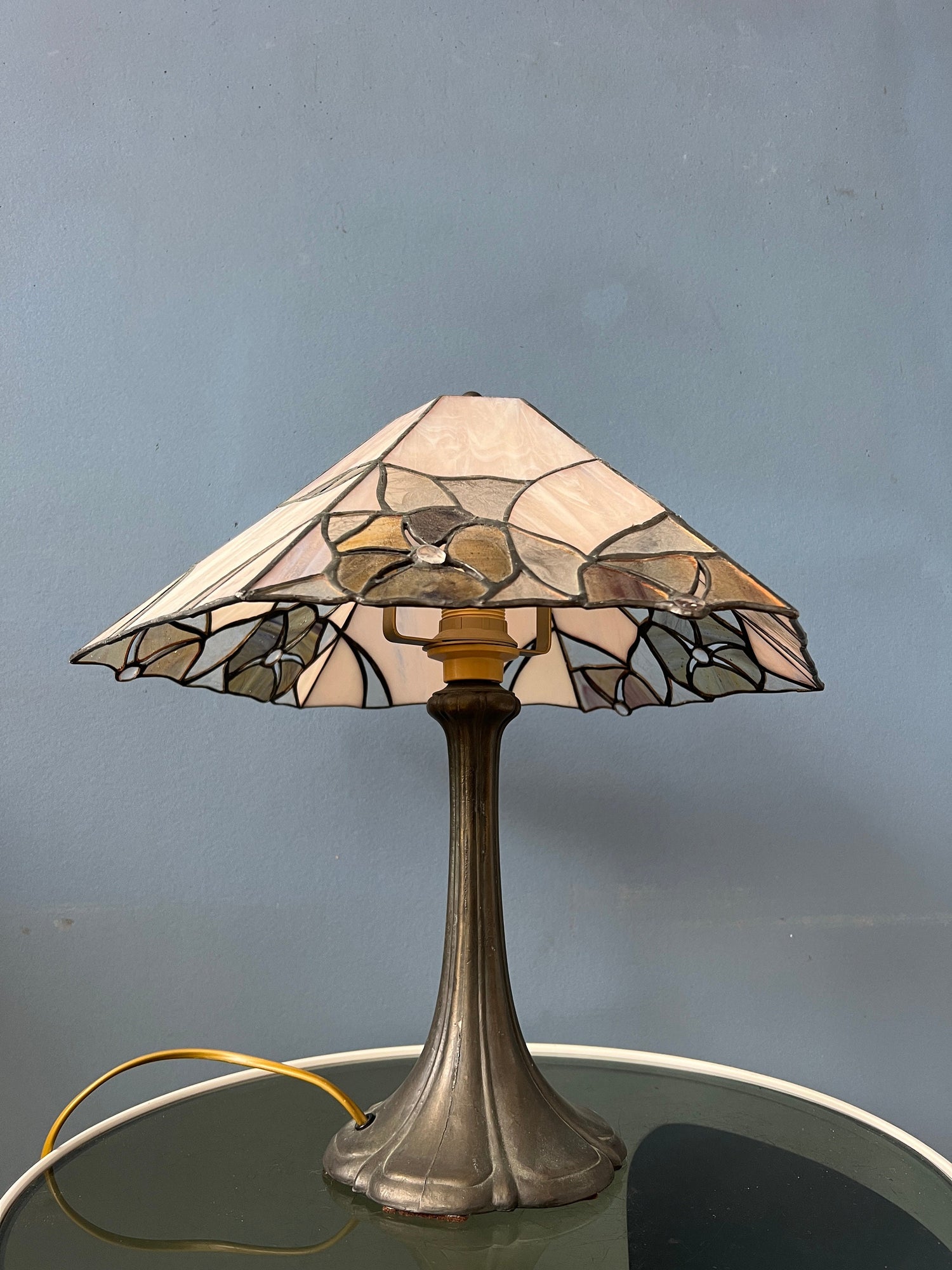 Vintage art deco style table lamp. The base is made out of metal and the shade is made from acrylic glass. The stained glass creates a beautiful light effect. The shade can be taken off the base and positioned in any way desirable. The lamp requires one E27 (standard) lightbulb and currently has an EU-plug (easily used outside EU with plug converter).
