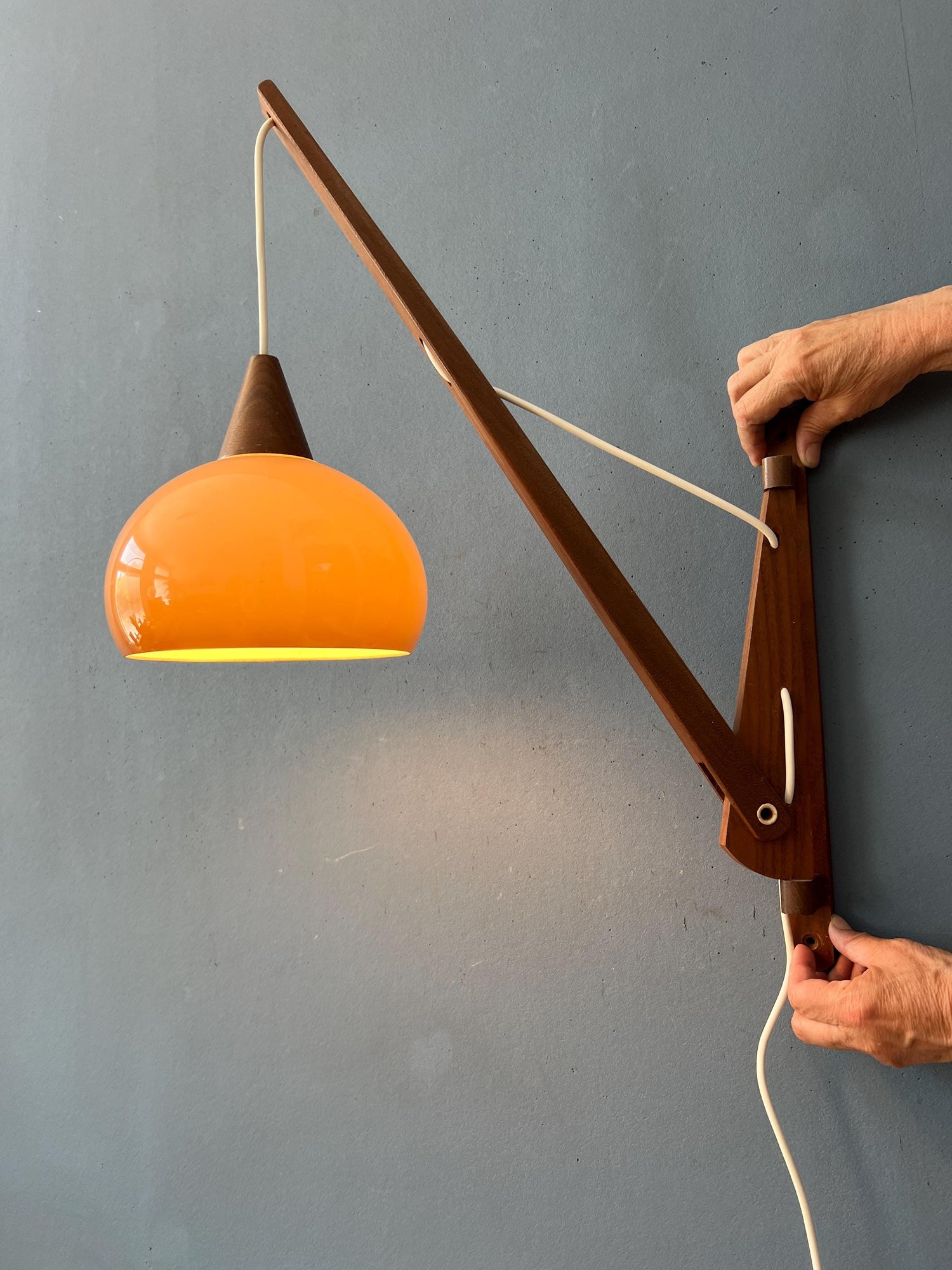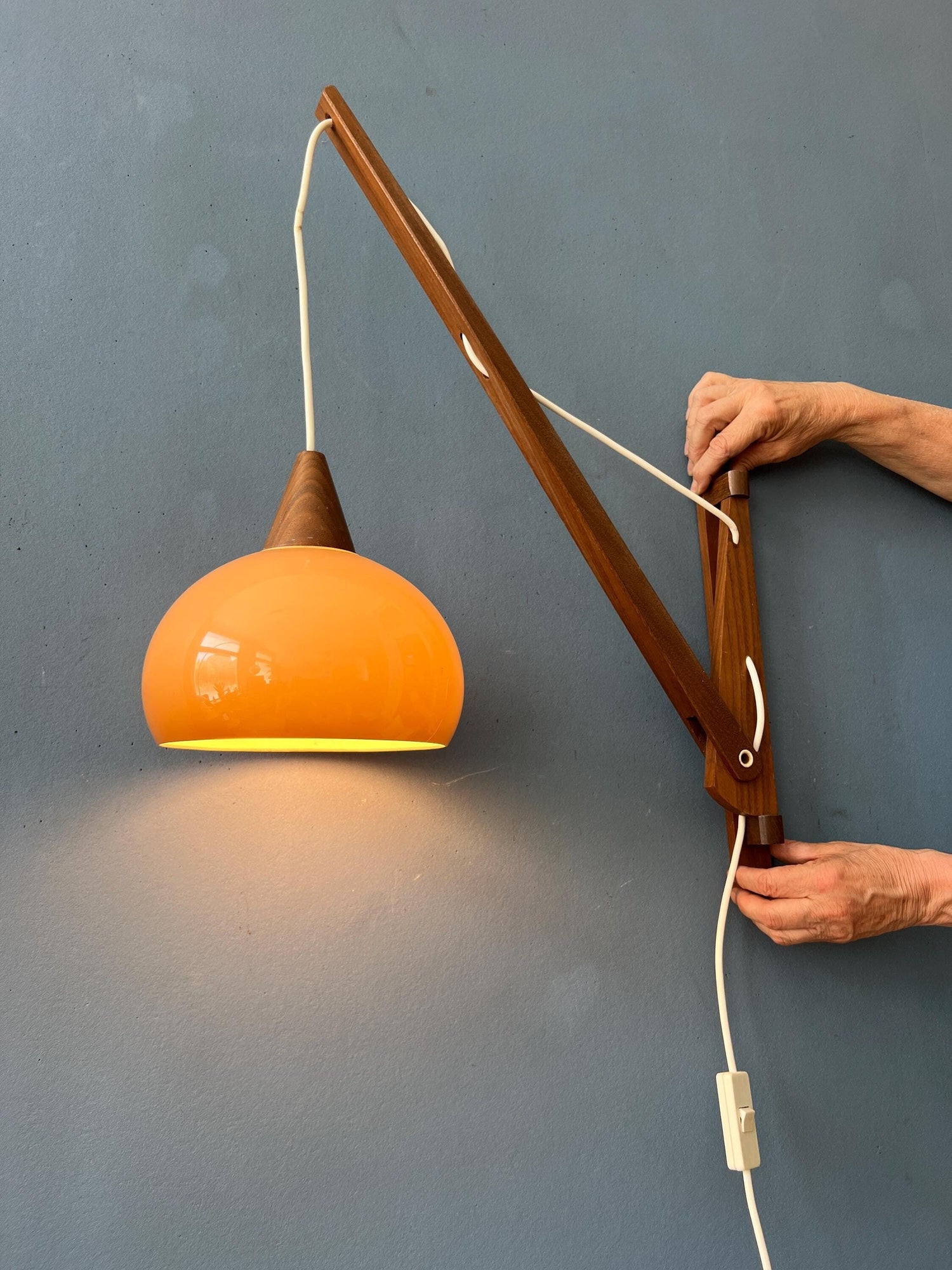 Large Danish fishing rod wall lamp made out of teak wood. The piece has a delicate and extraordinary look. The height of the acrylic glass mushroom shade can be adjusted. Also the angle of the rod can be adjusted (moving downward op upward). The lamp requires one E26/27 (standard) lightbulb and currently has an EU-plug.