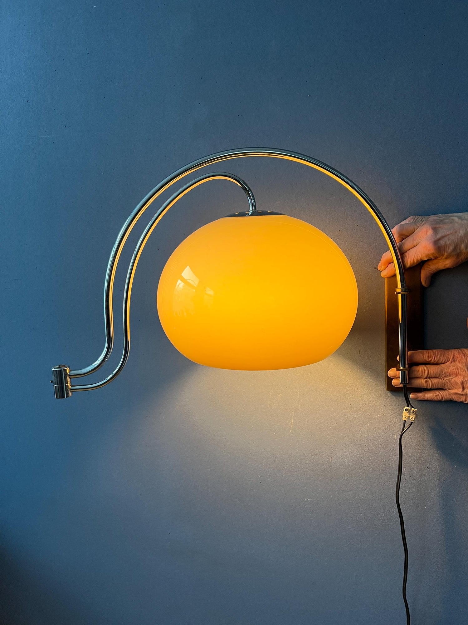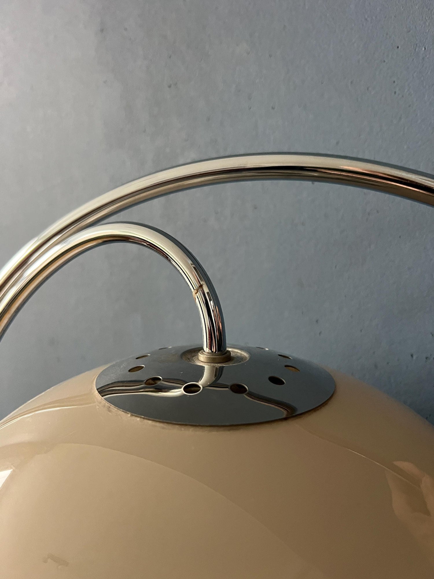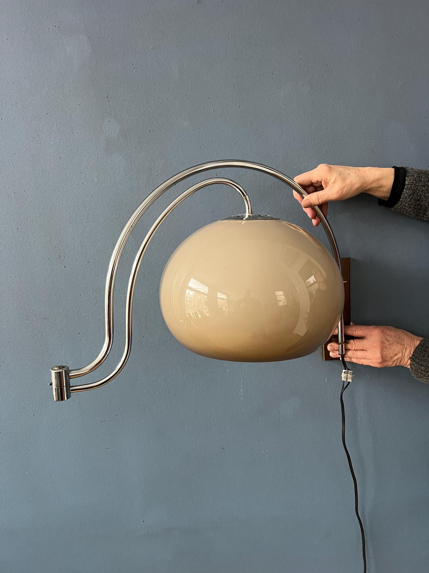 Oft-sought after double arc mushroom wall lamp by Dijkstra. The mocca coloured mushroom shade produces a warm but also classy light. The light reflects nicely on the delicate chrome frame. The inner arc can be positioned aligned with or in opposite direction of the main arc. The lamp requires an E27/26 (standard) lightbulb and is currently hardwired (a plug and switched can be attached).