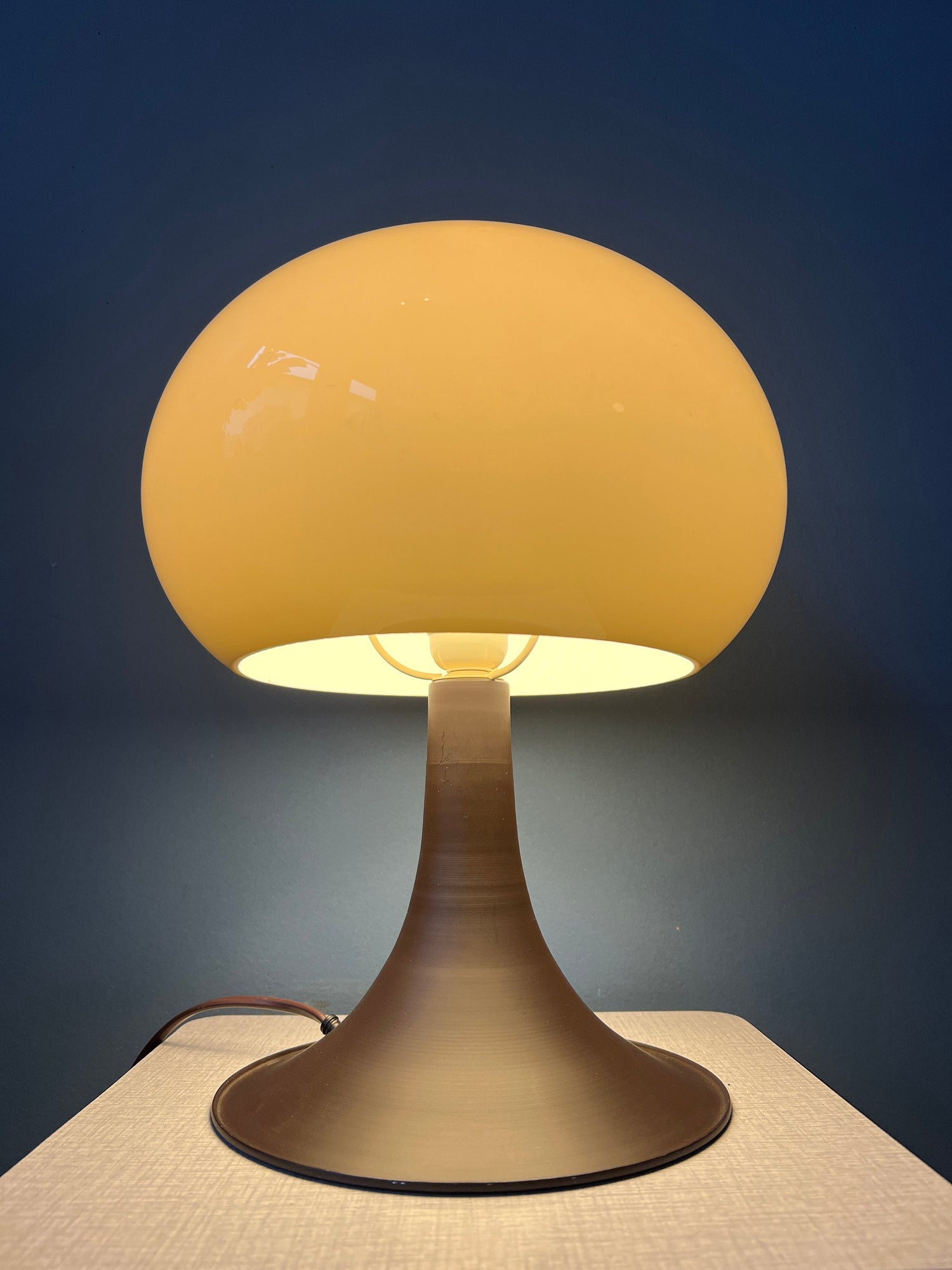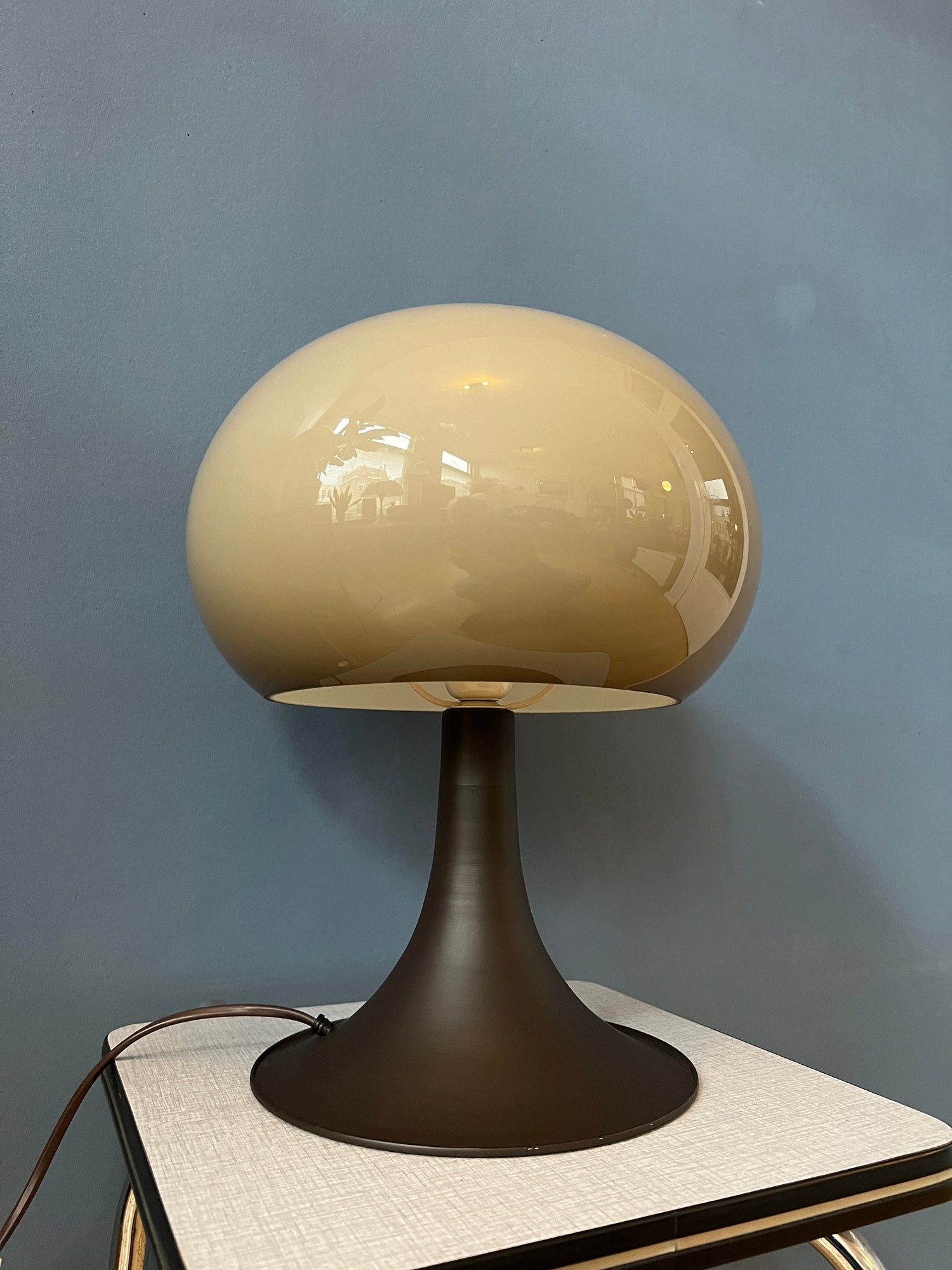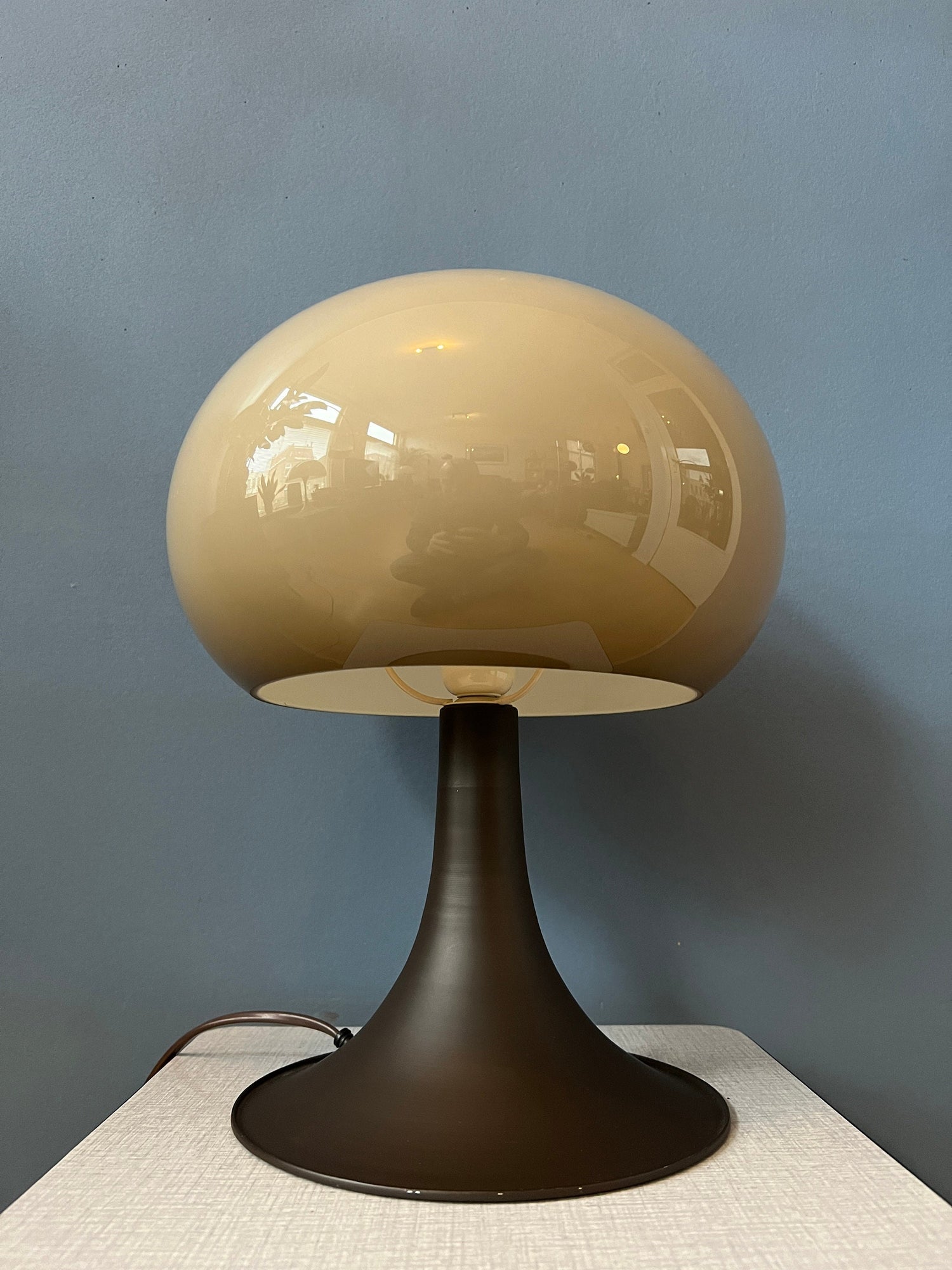A small vintage mushroom table lamp by the Dutch brand Dijkstra in brown/beige colour. The beige mushroom shade produces a cosy and warm light. The lamp requires one E27 (standard) lightbulb and currently has an EU-plug.