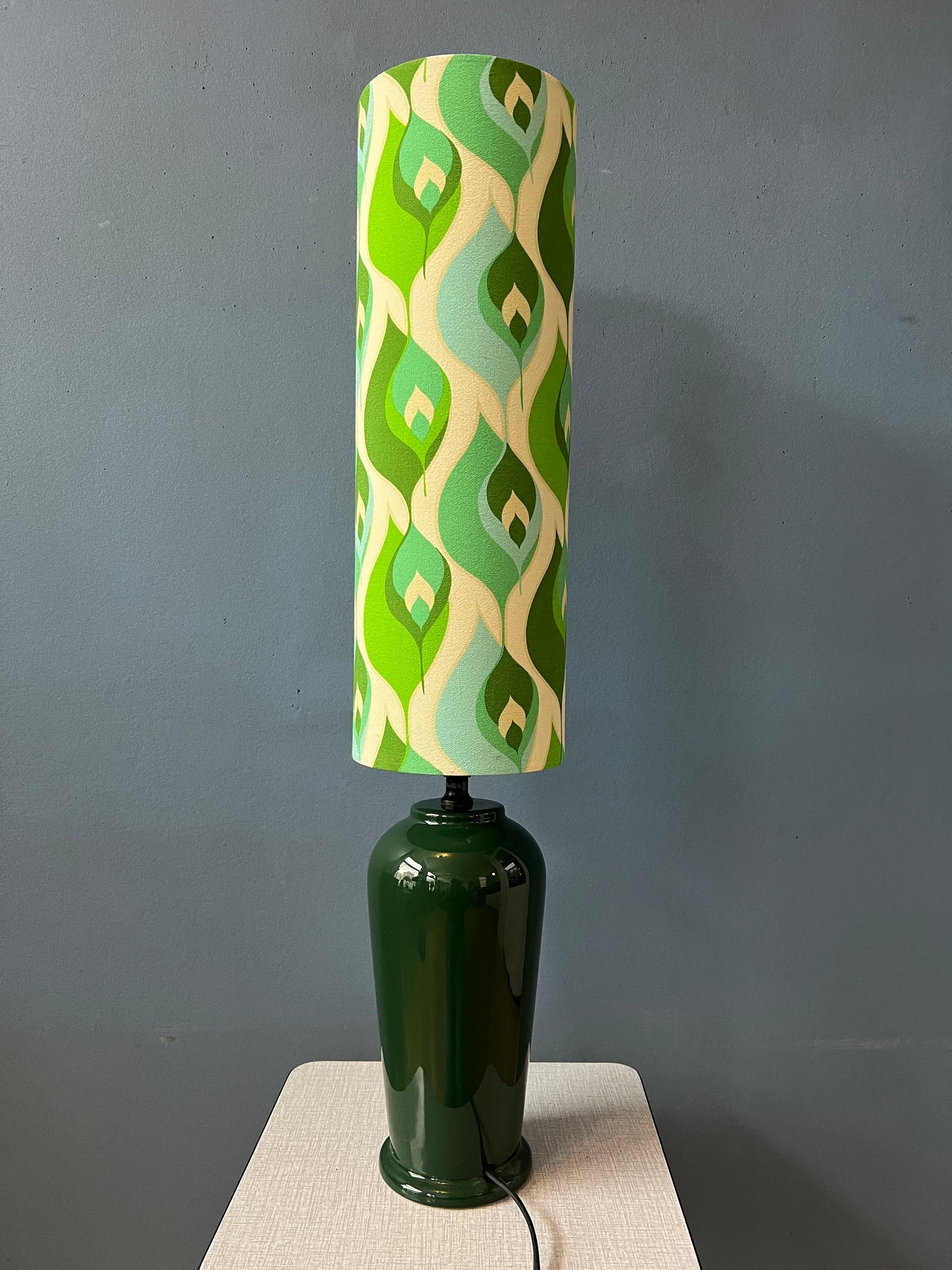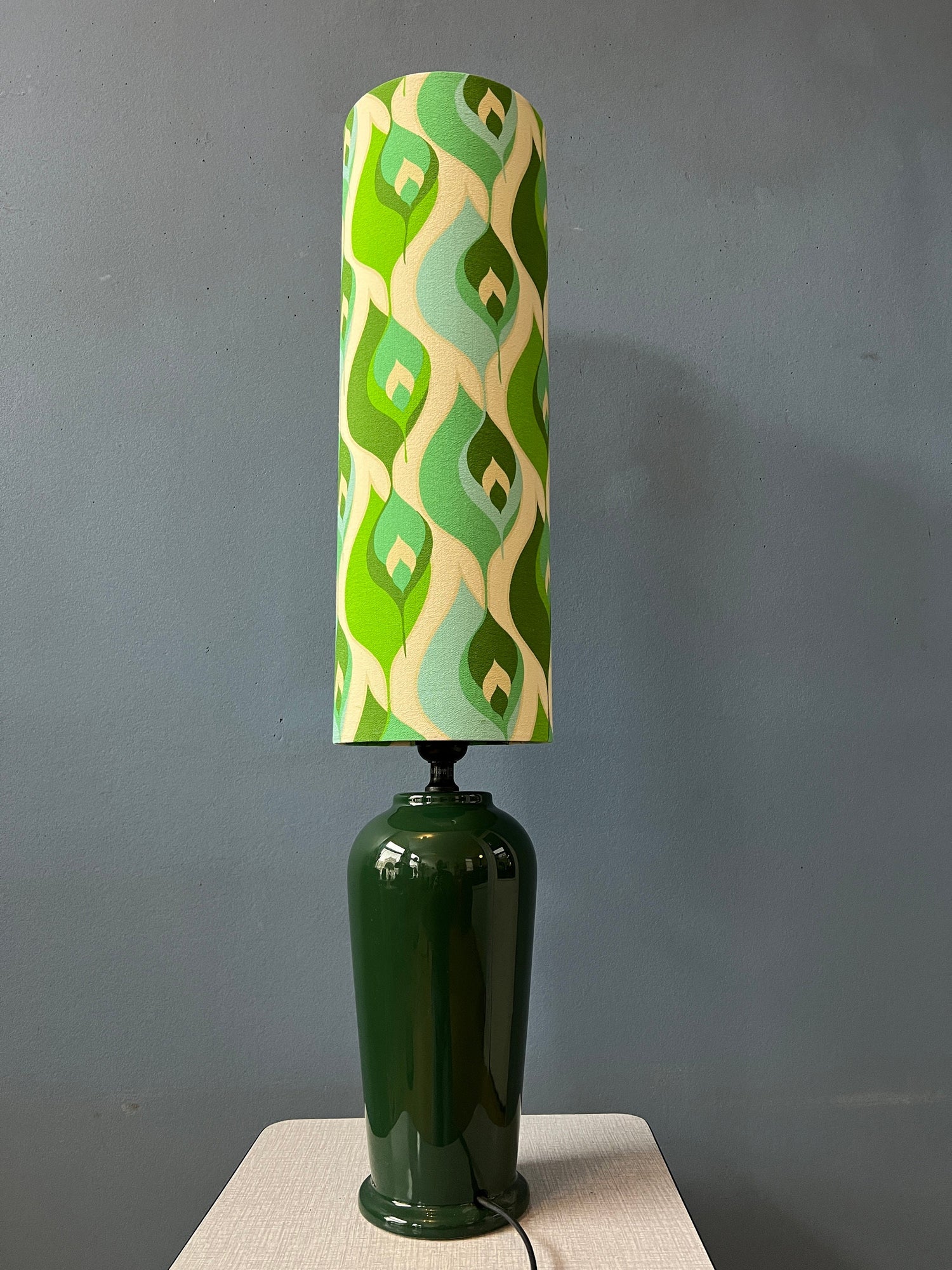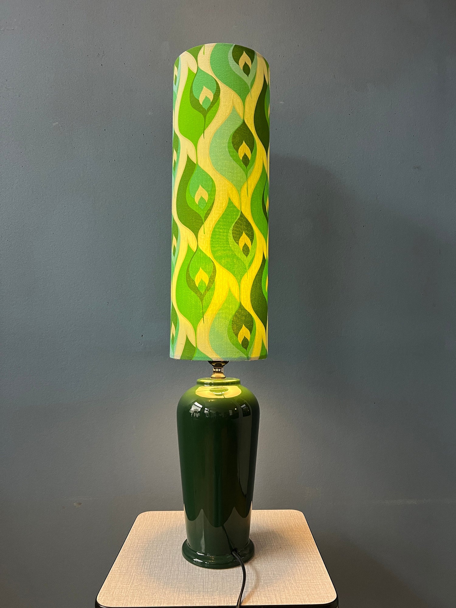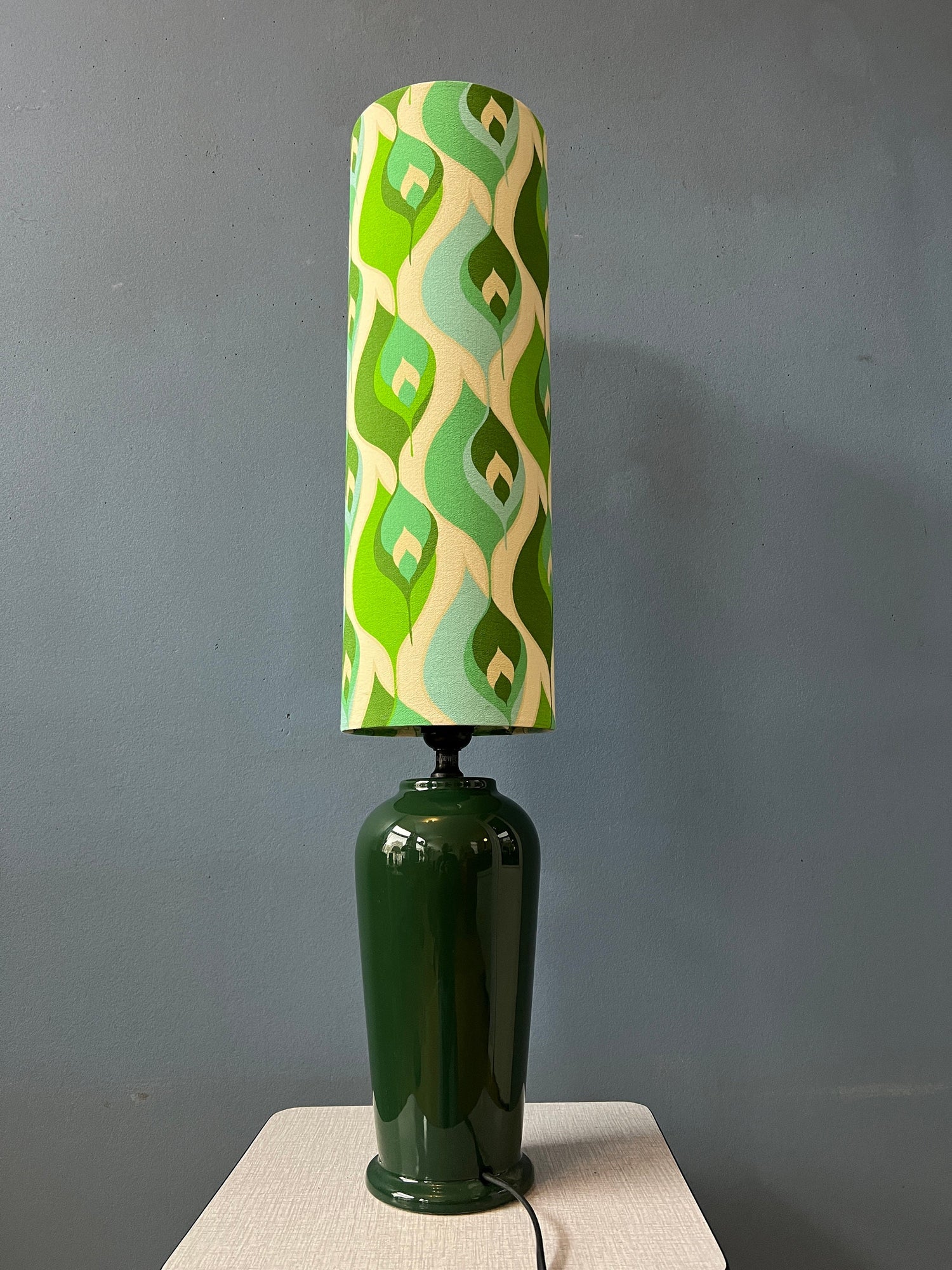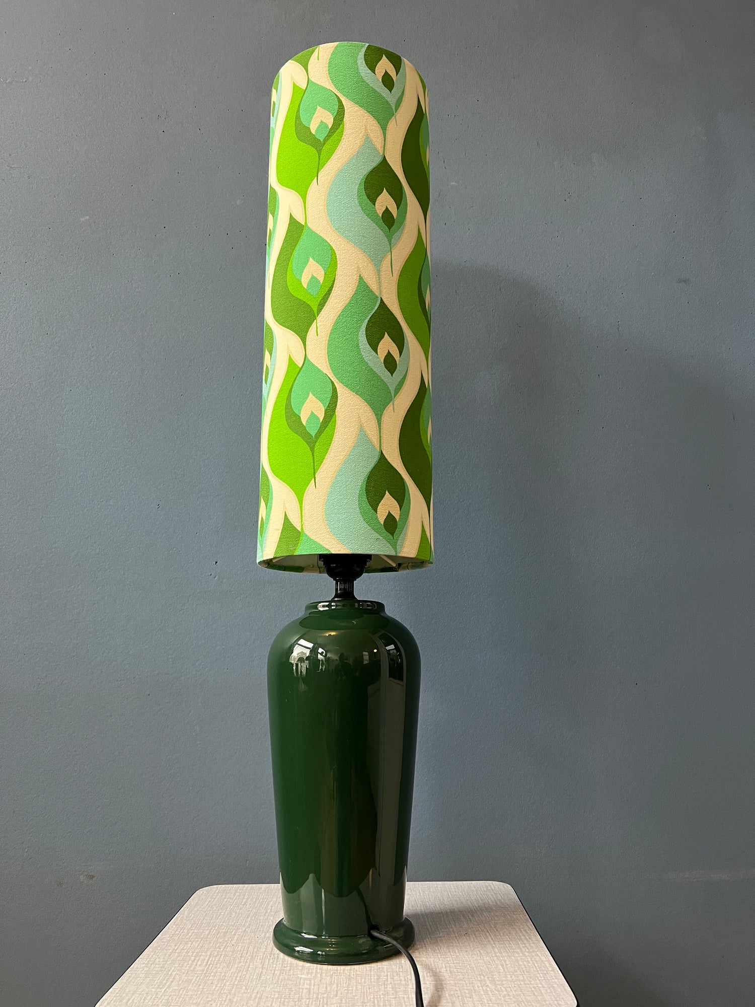 Green vintage space age table lamp with long, newly made textile shade. The lamp has a ceramic base with dark green lacquer. The lamp requires one E27 lightbulb and currently has an EU-plug.