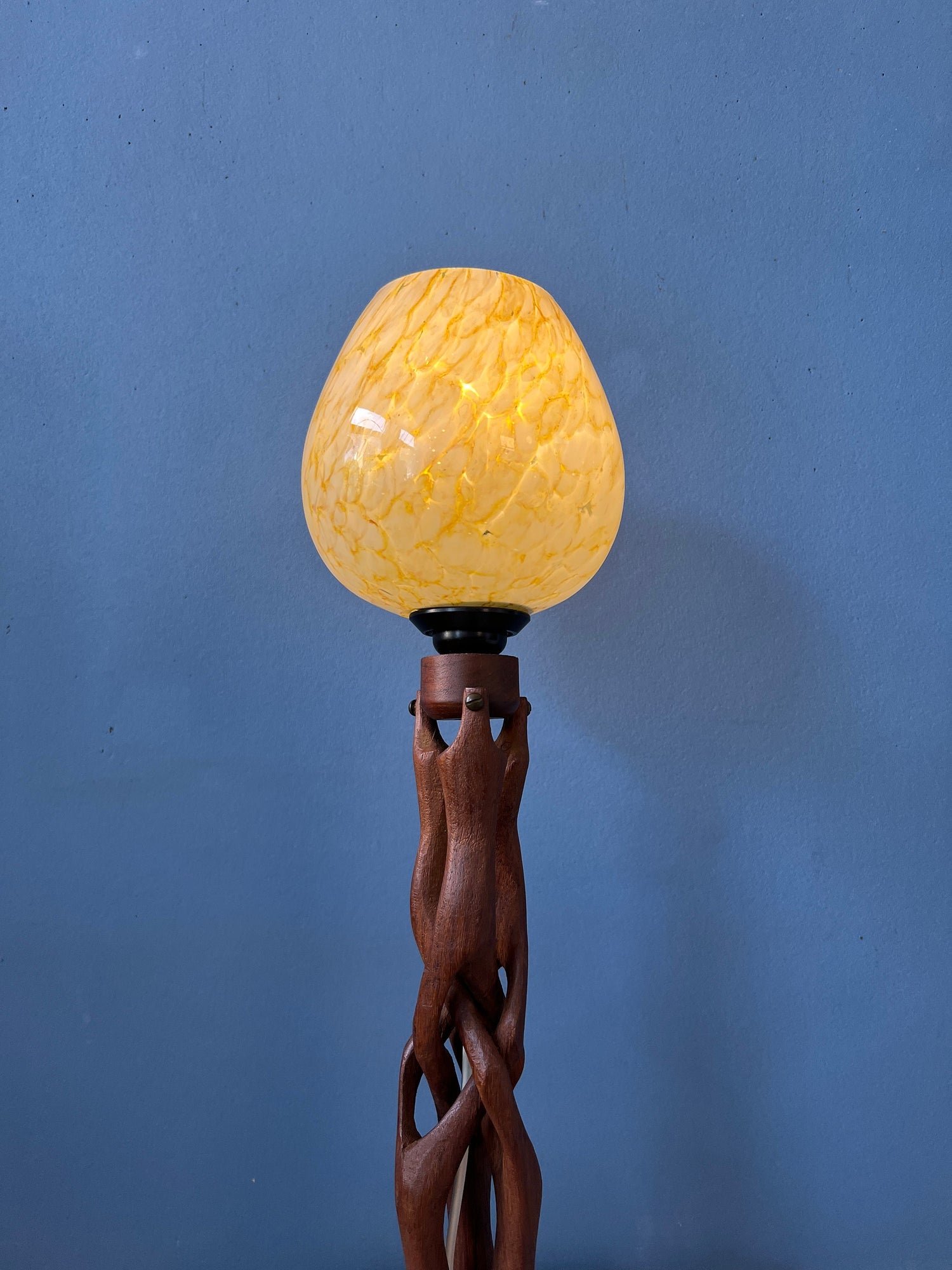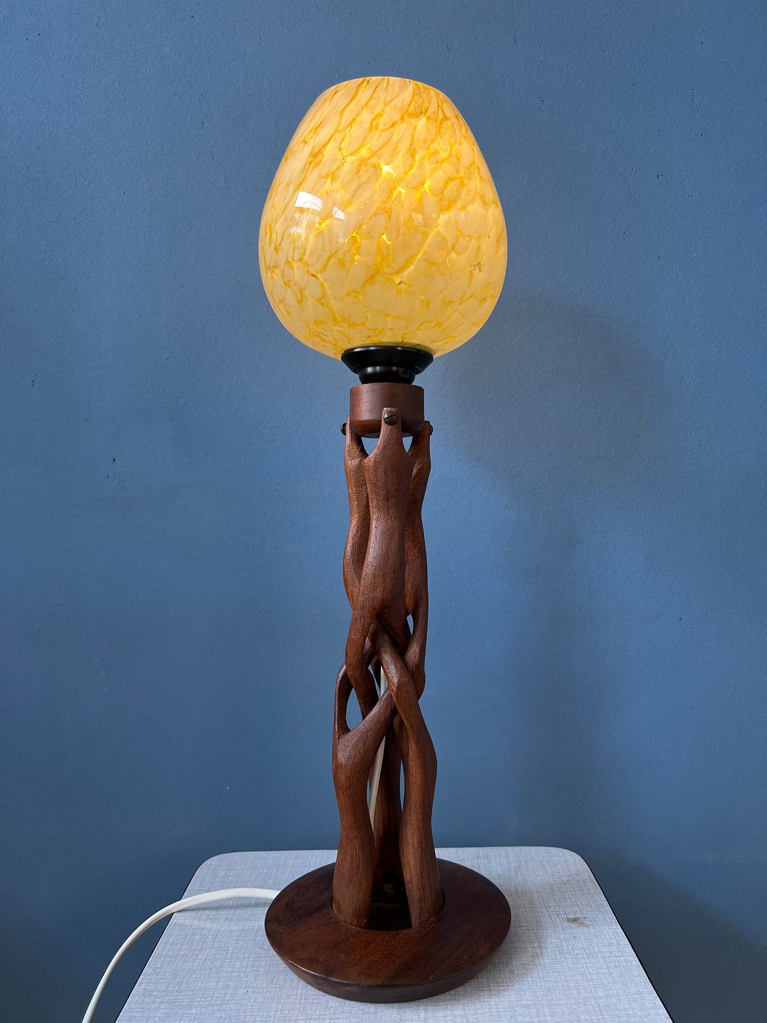 Hand-carved wooden table lamp with glass shade in art deco style. The lamp requires one E14 lightbulb and currently has an EU-plug.