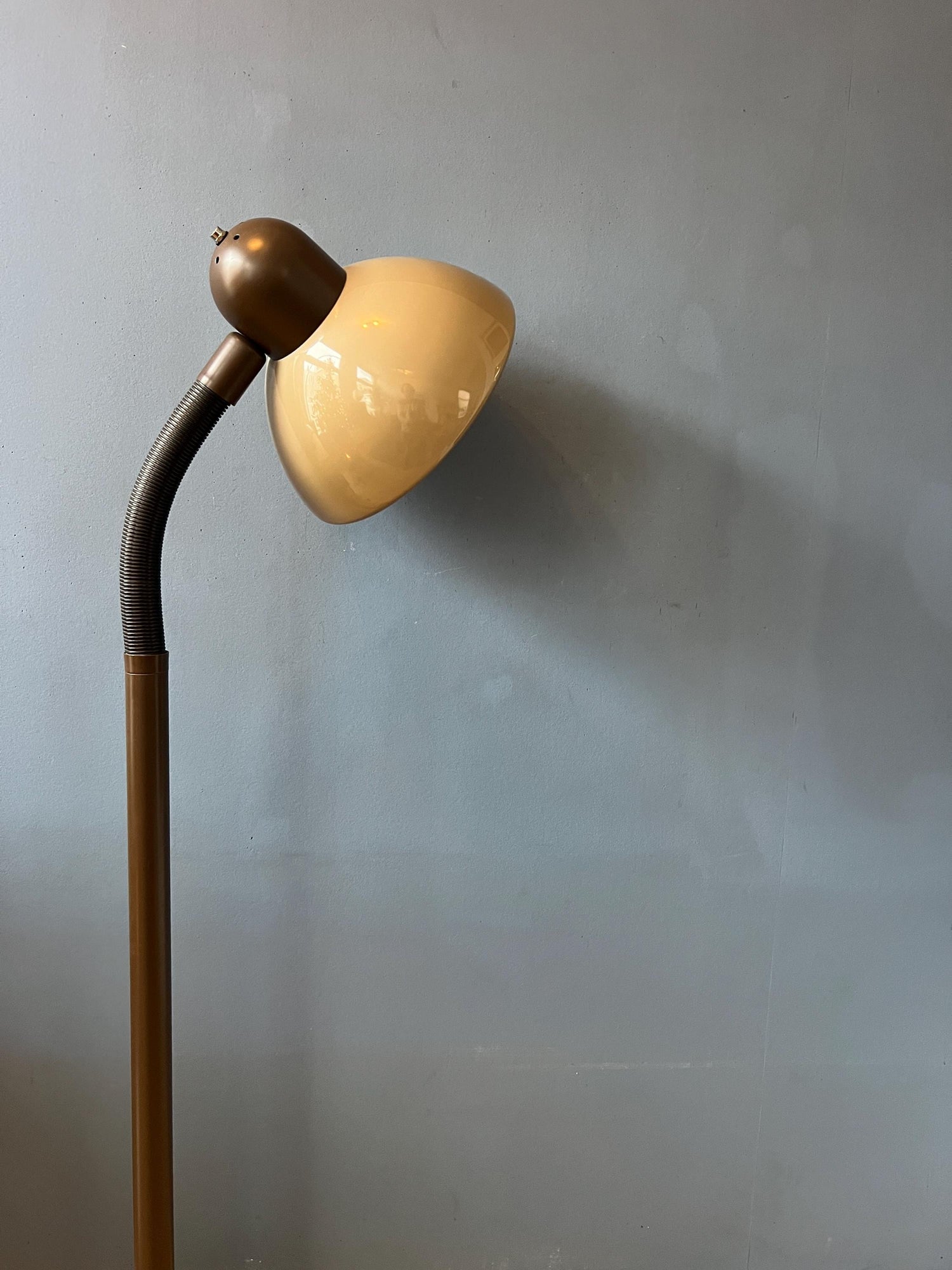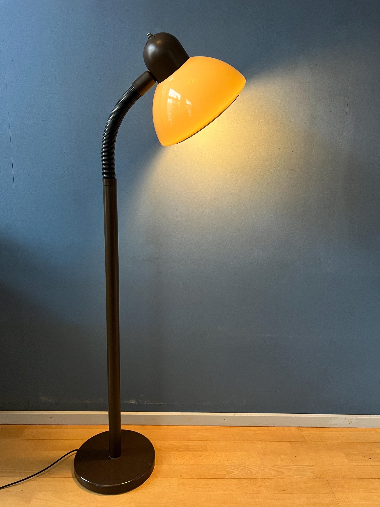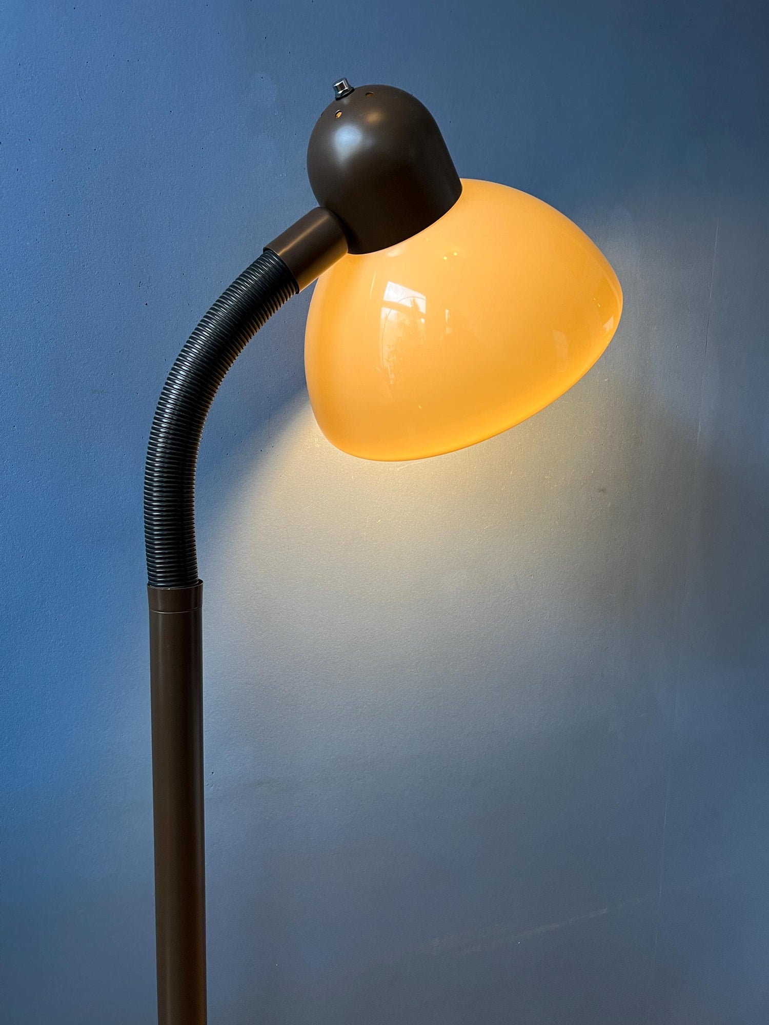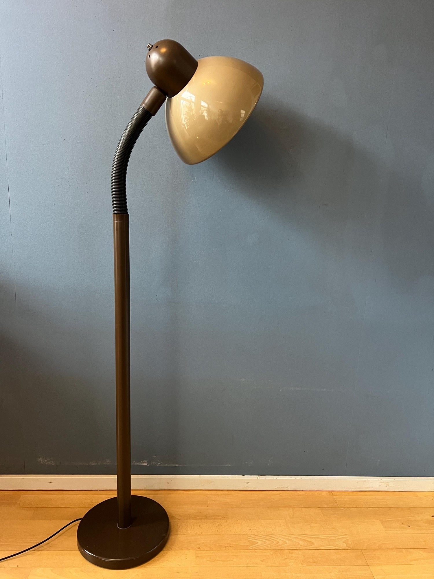 Herda brown space age floor lamp with plexiglass mushroom shade. The beige/brown mushroom shade can easily be adjusted from position with its flexible arm. The lamp requires one E27/26 lightbulb and currently has a EU-plug (works outside EU right away with plug-converter).