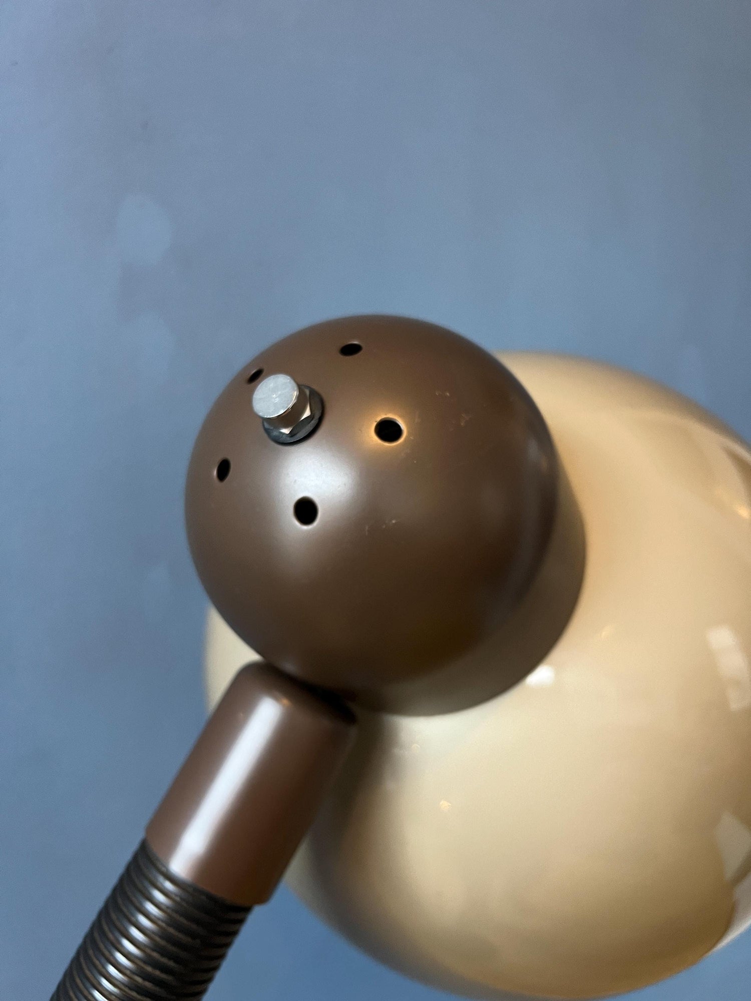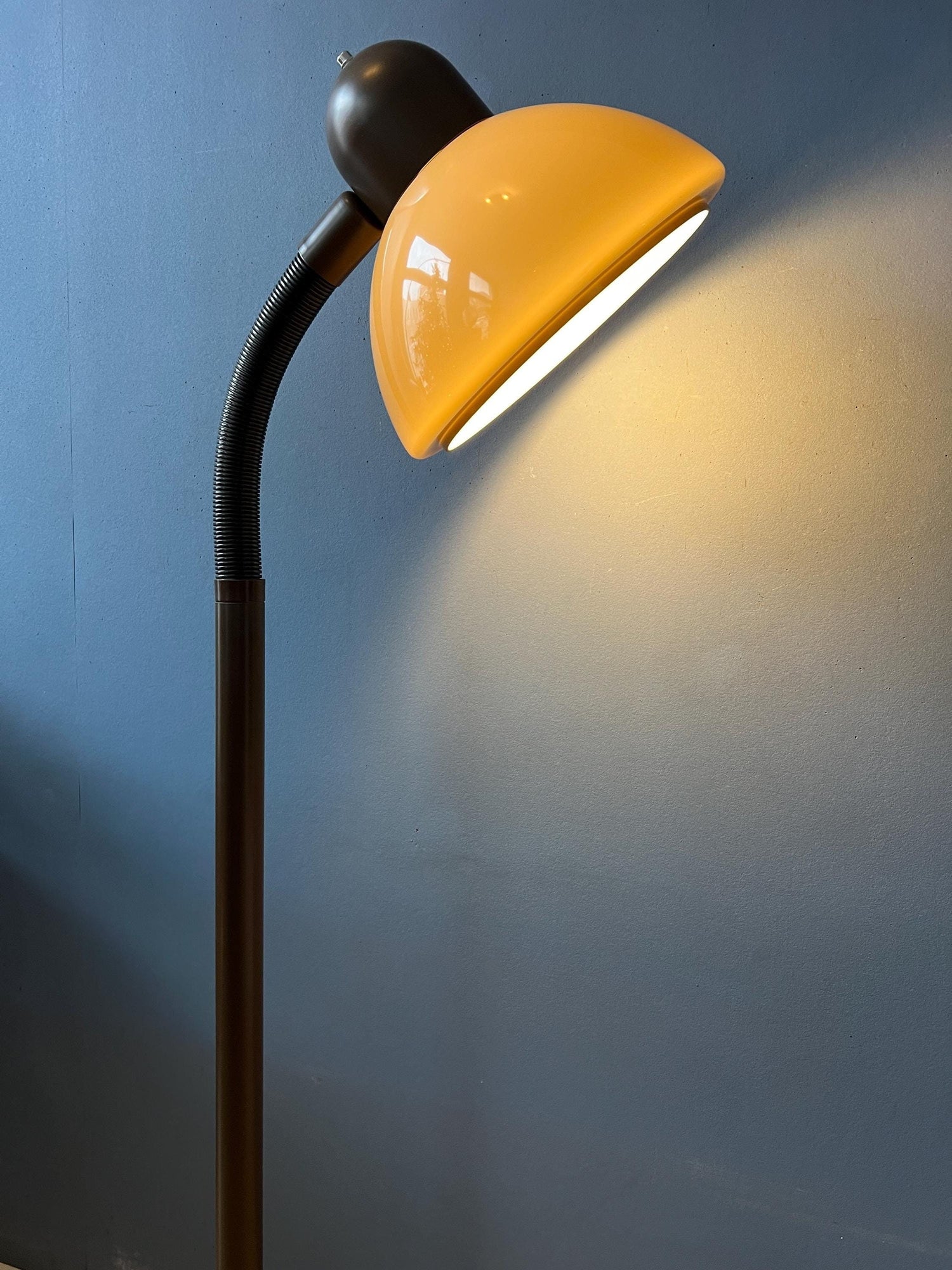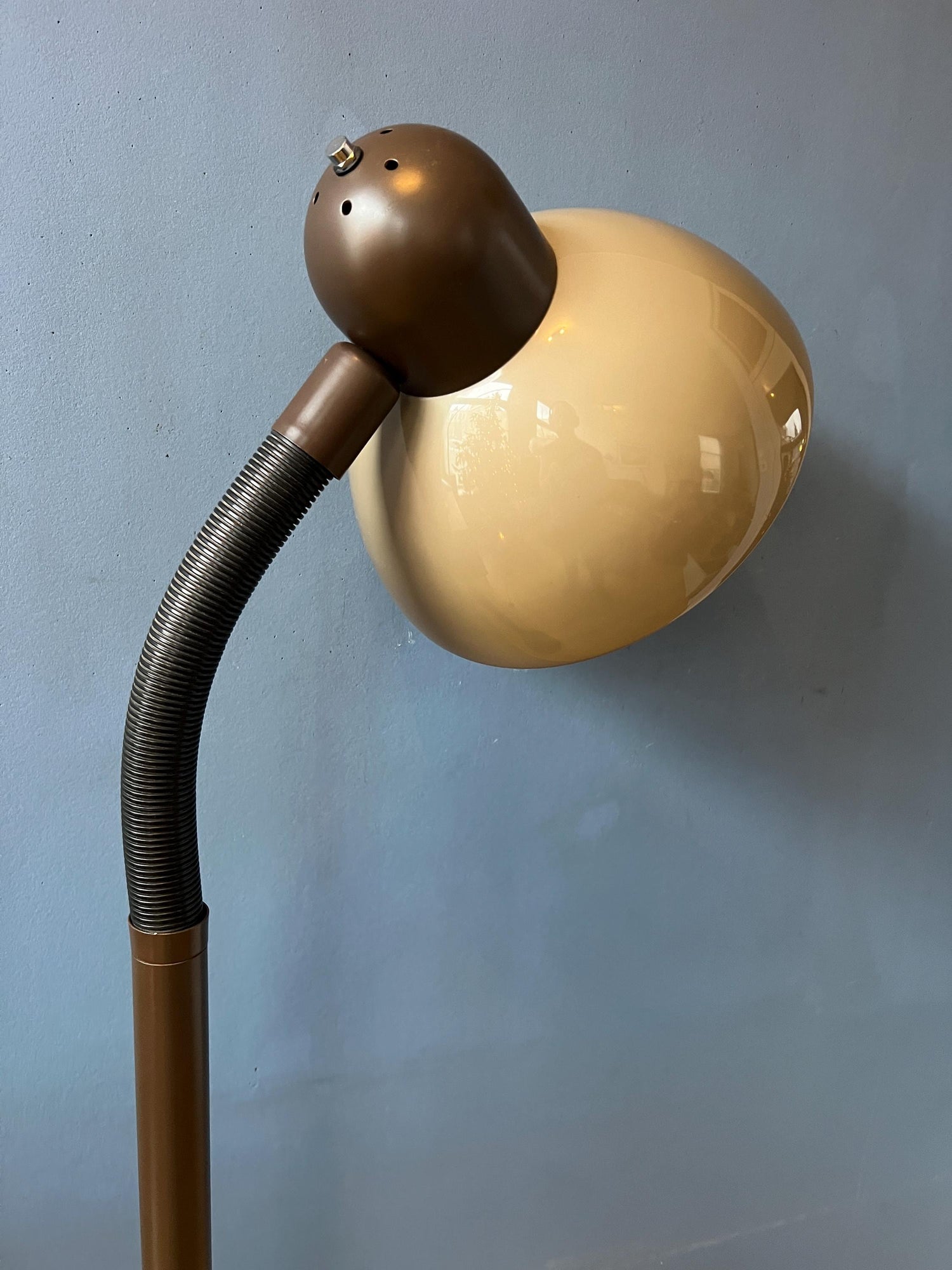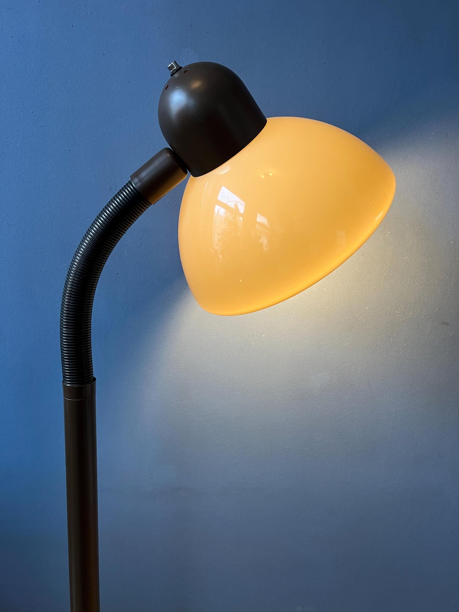Herda brown space age floor lamp with plexiglass mushroom shade. The beige/brown mushroom shade can easily be adjusted from position with its flexible arm. The lamp requires one E27/26 lightbulb and currently has a EU-plug (works outside EU right away with plug-converter).