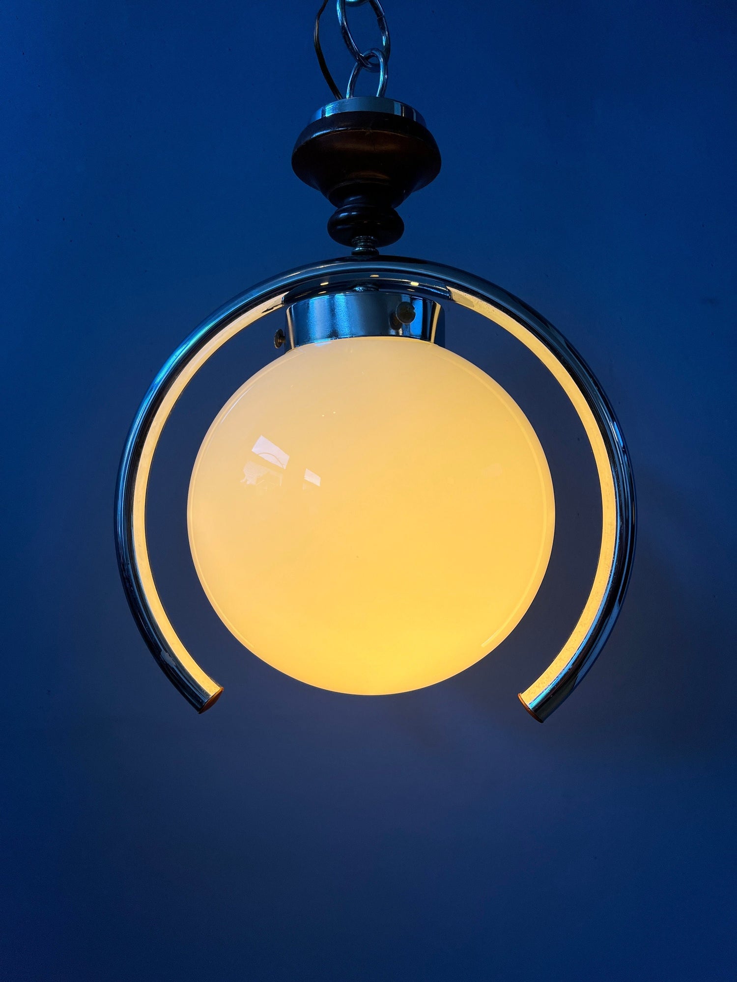 An Italian style mid century pendant light with a glass shade and chrome frame. The white shade produces a beautiful reflection on the chrome frame. The lamp requires one E27/26 lightbulb.