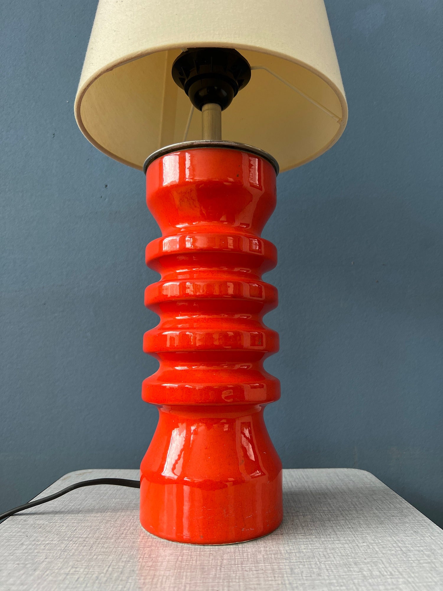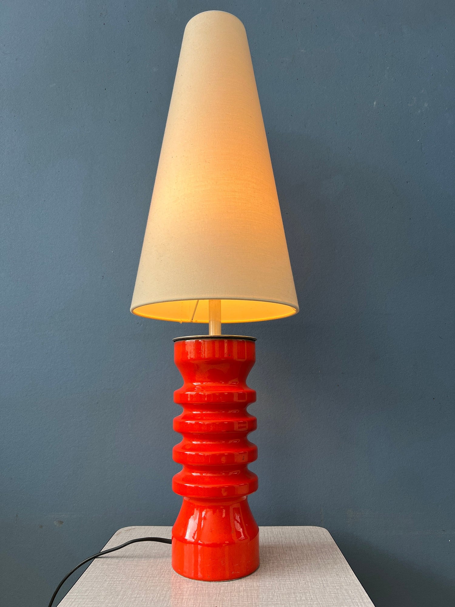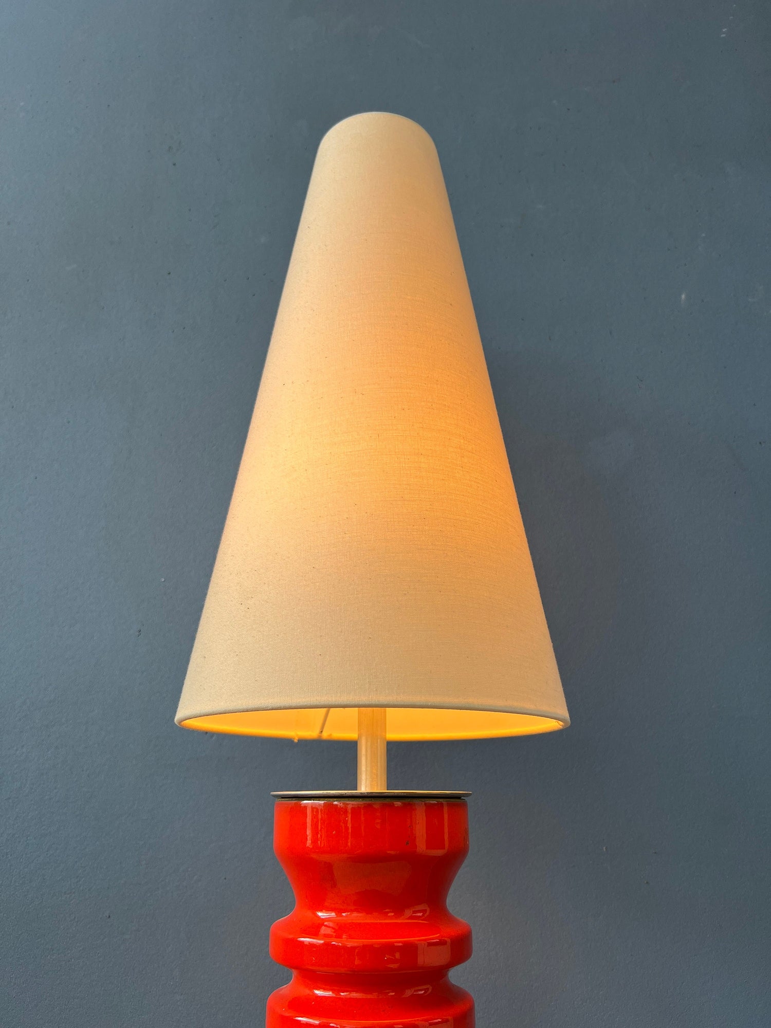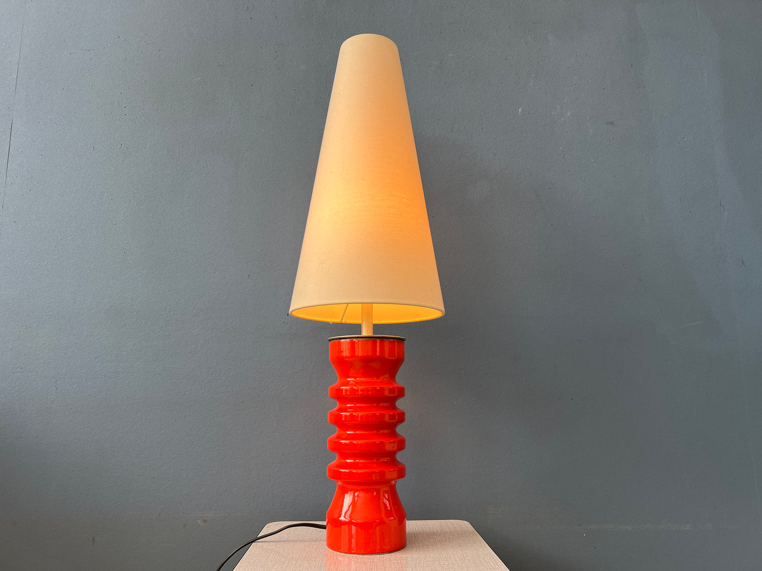 Large red ceramic table lamp with beige textile shade. The fat lava style base has a thick red lacquer. The shade produces a warm, cosy glow. The lamp requires one E27/26 lightbulb and currently has an EU-plug (easily used outside EU with plug converter).