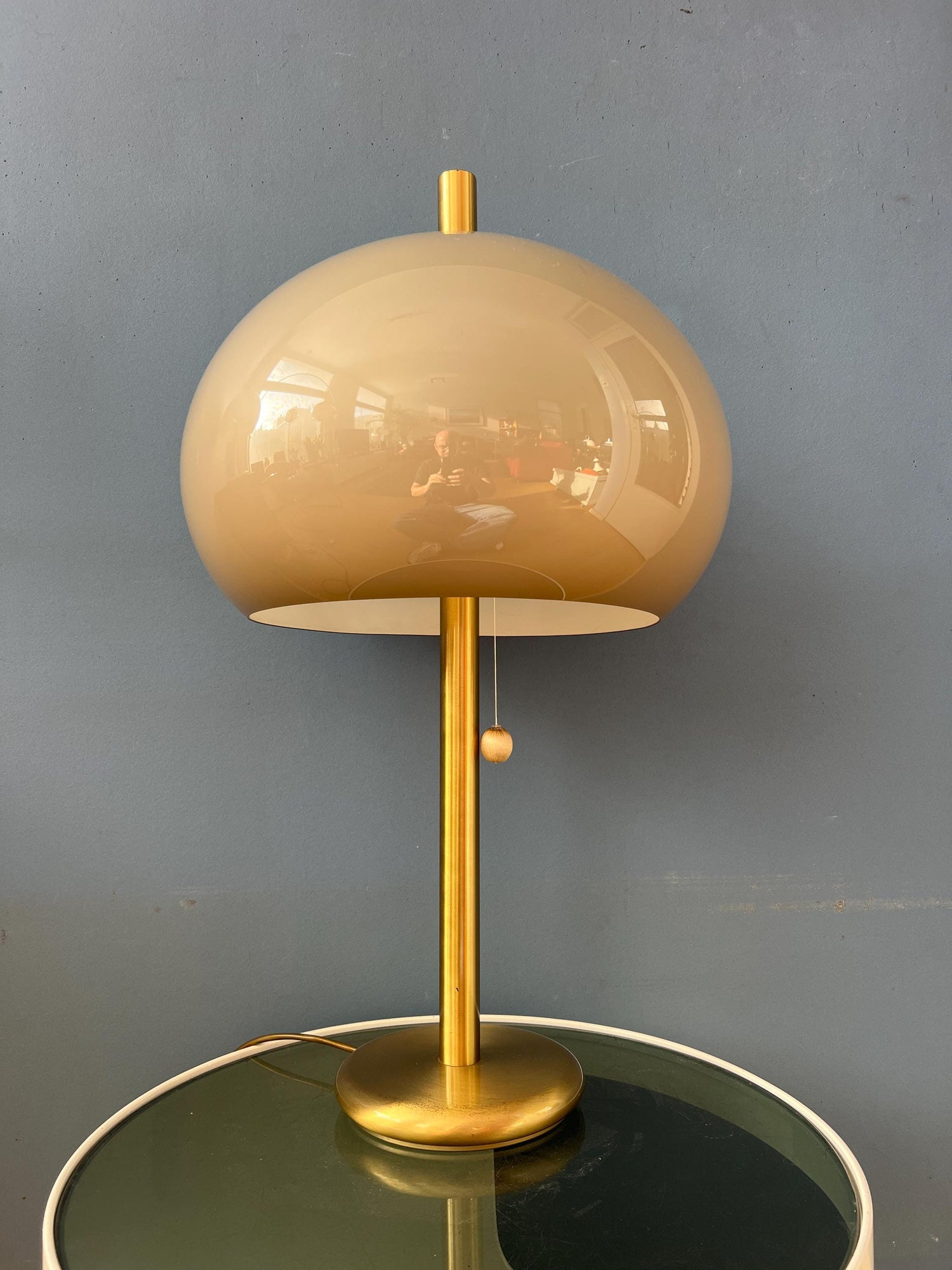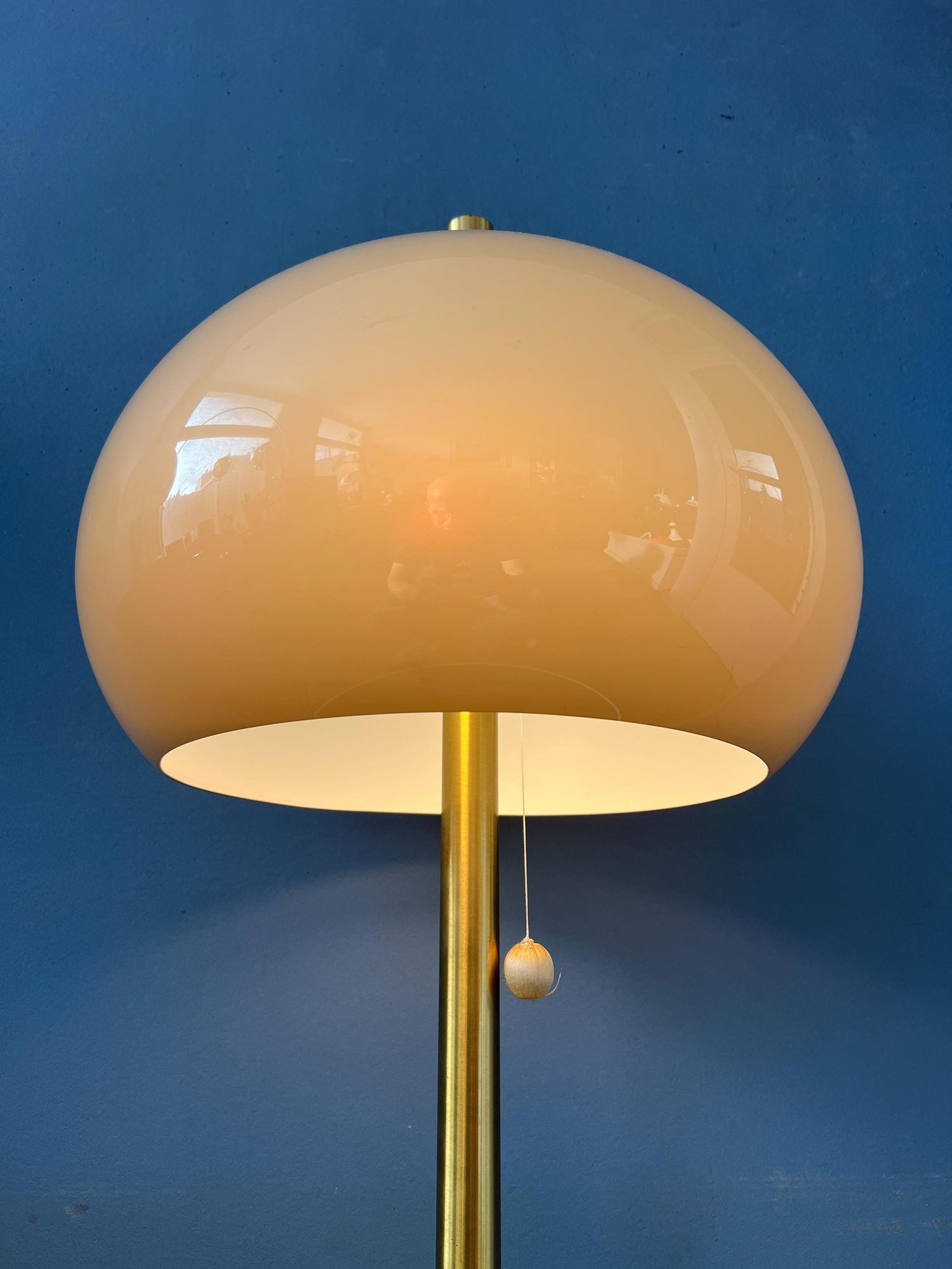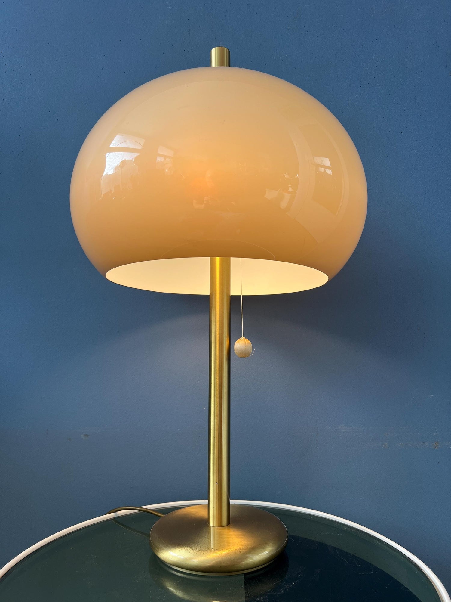 Unique large vintage mushroom table lamp with plexiglass shade and brass base. The beige/brown mushroom shades produces a warm and cosy light. The lamp can be switched on and off by pulling the cord underneath the shade. The lamp requires two E27/26 lightbulbs and currently has an EU-plug.