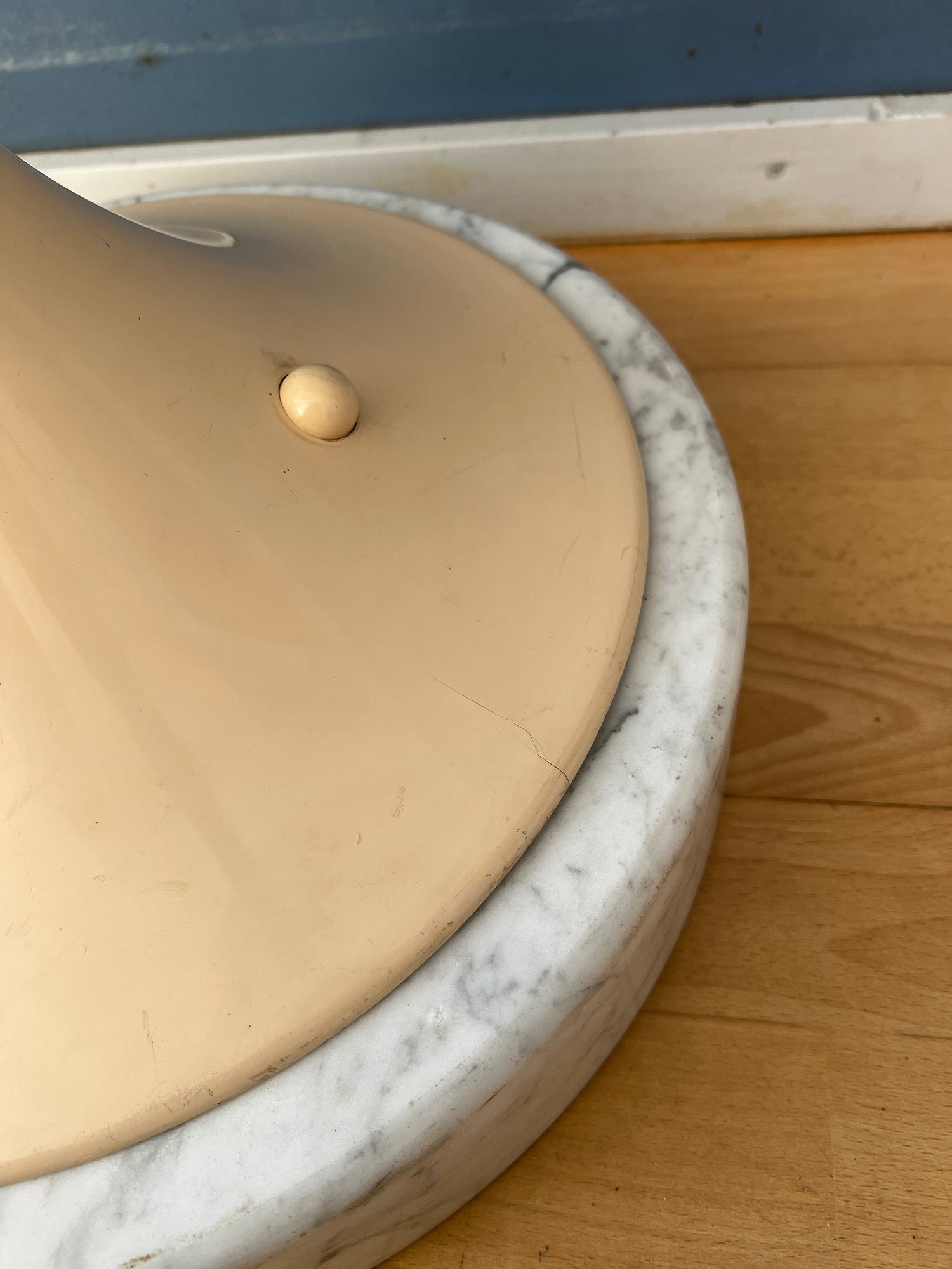 Good/vintage. The lamp is still great looking, but it has some user-wear here and there. Right on top of the shade there is slight heat damage visible, see last pictures. The acrylic glass that carries the shade was damaged due to heat, but professionally restored with another layer of transparent acrylic glass (hardly visible). There is one very small crack in the base, it has been strengthened underneath so there is no danger of further damage, see last picture.