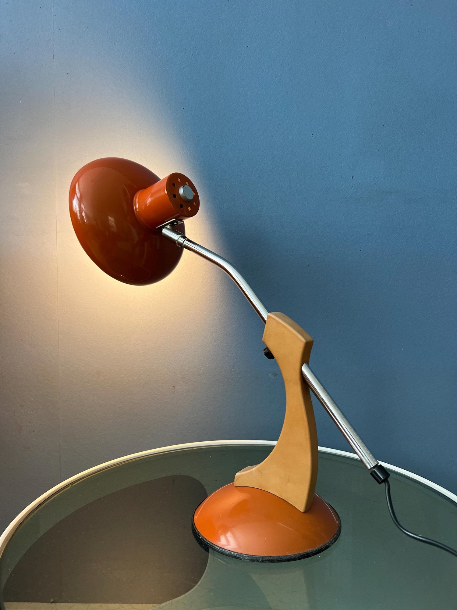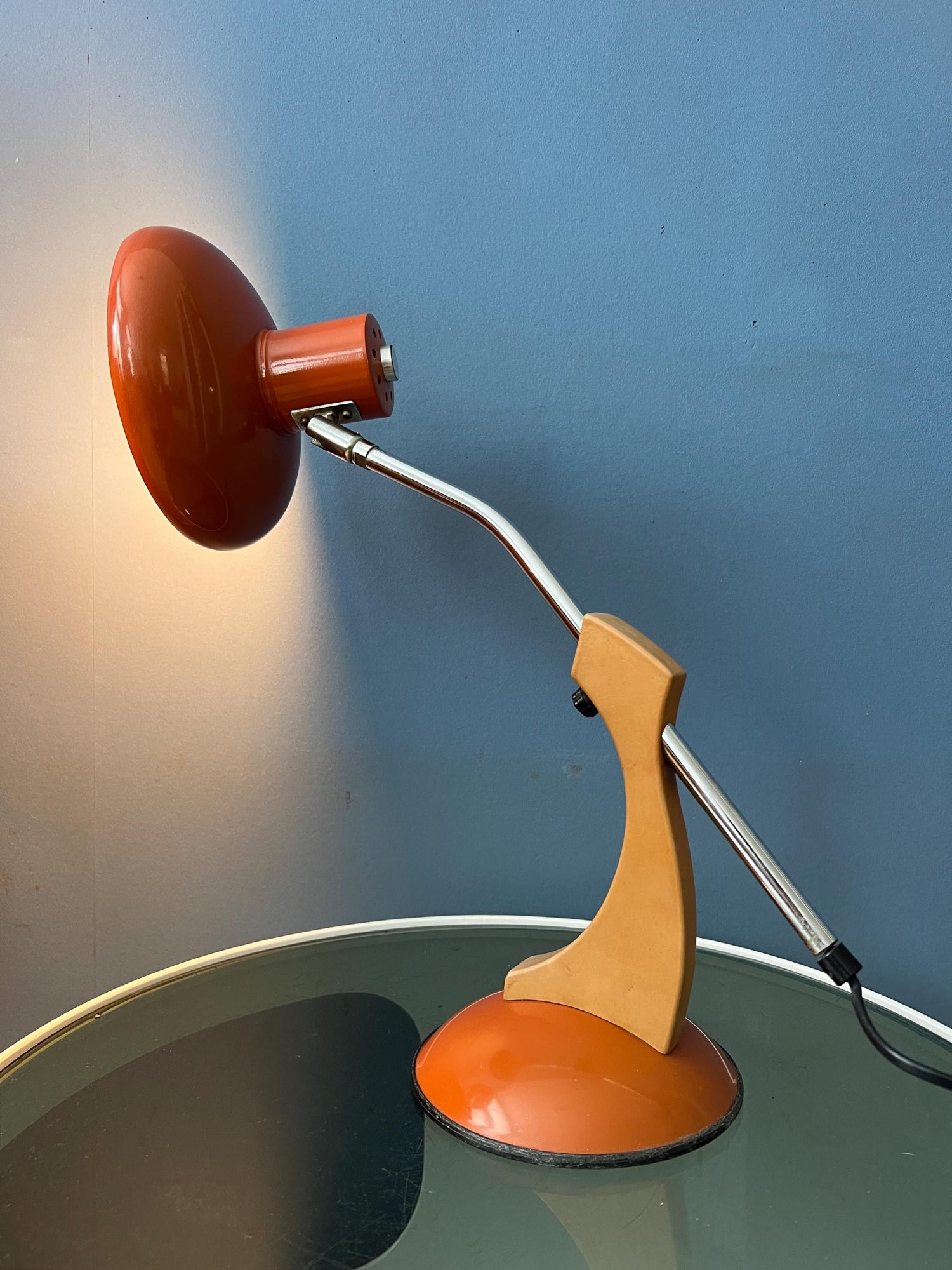Massive orange space age desk lamp with adjustable arm in the style of Fase Madrid. The arm can be adjusted and also the shade itself can be repositioned. The lamp requires one E27/26 (standard) lightbulb and currently has an EU plug (easily usable outside EU with plug-converter).