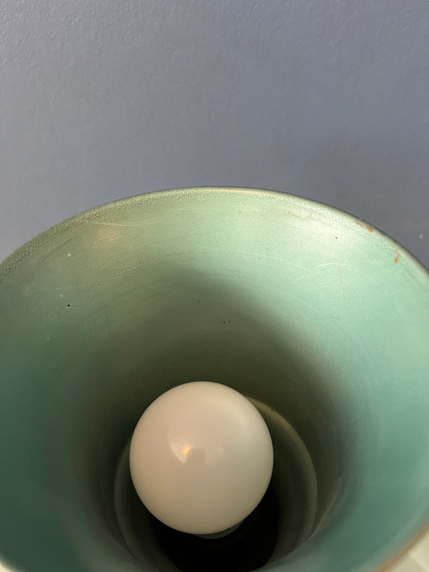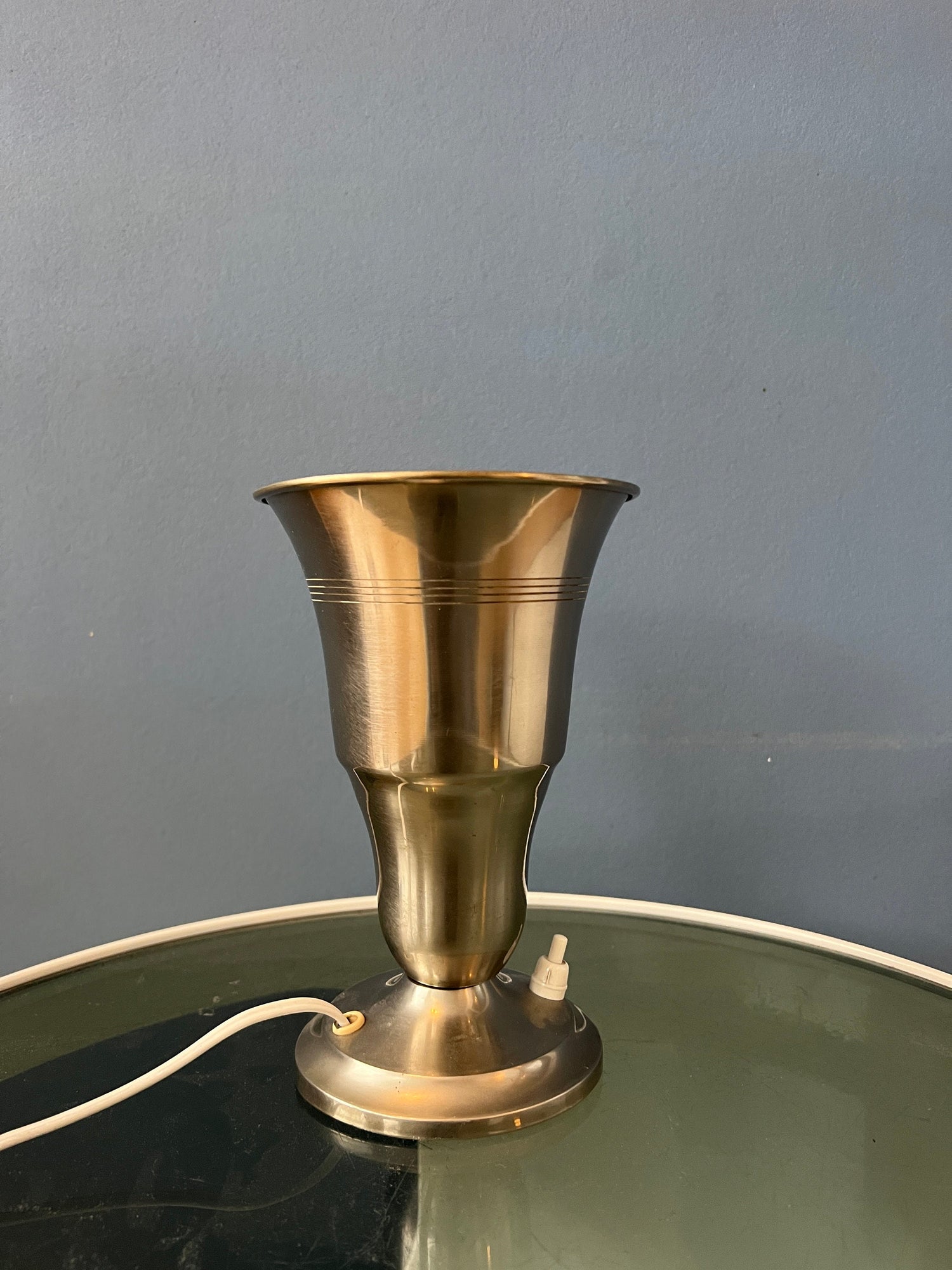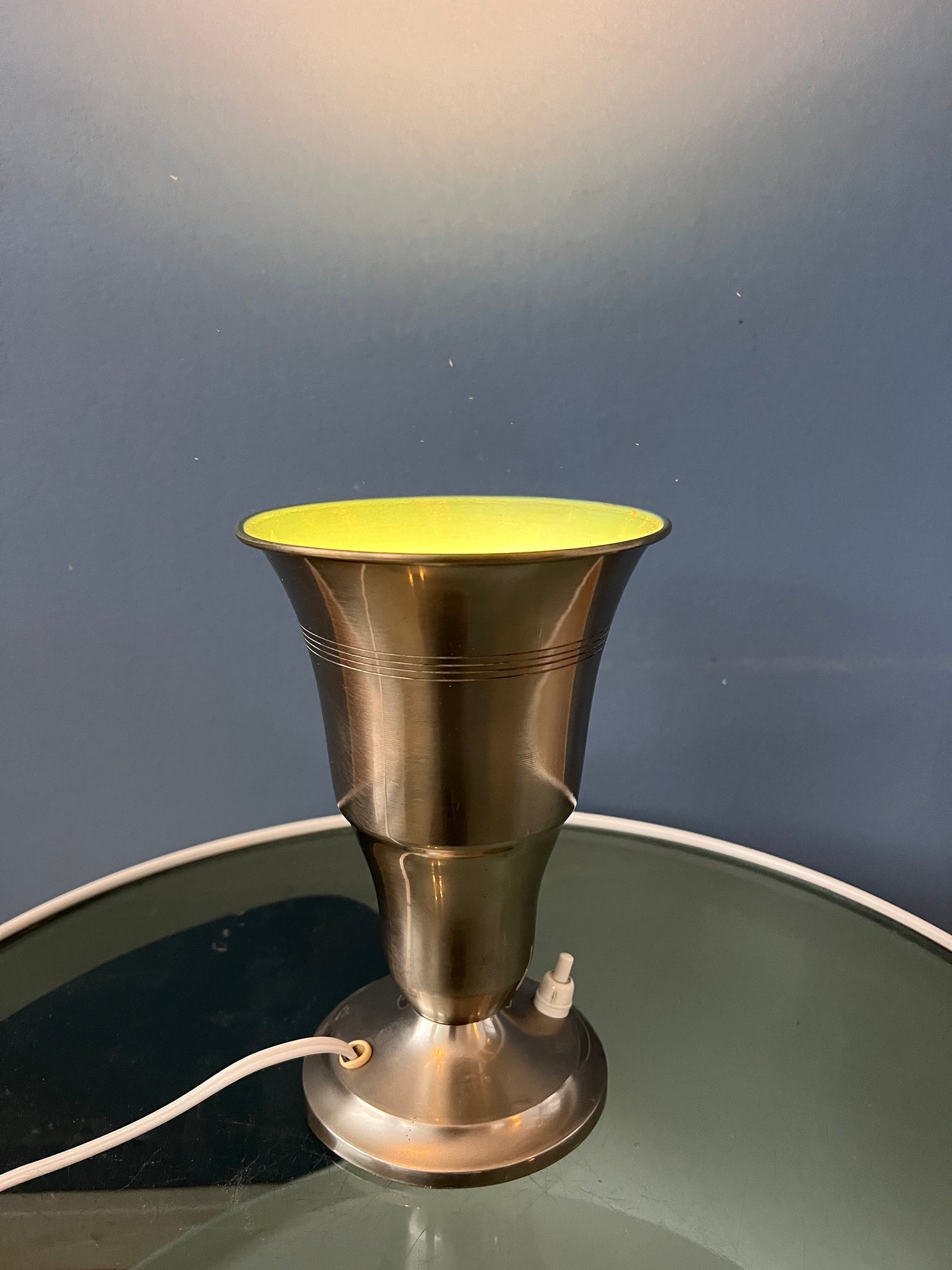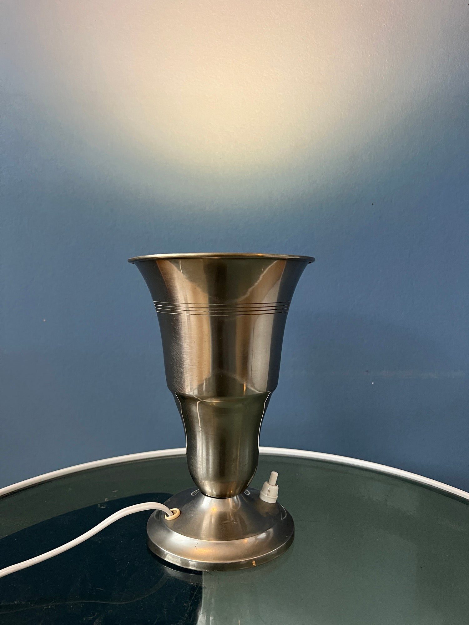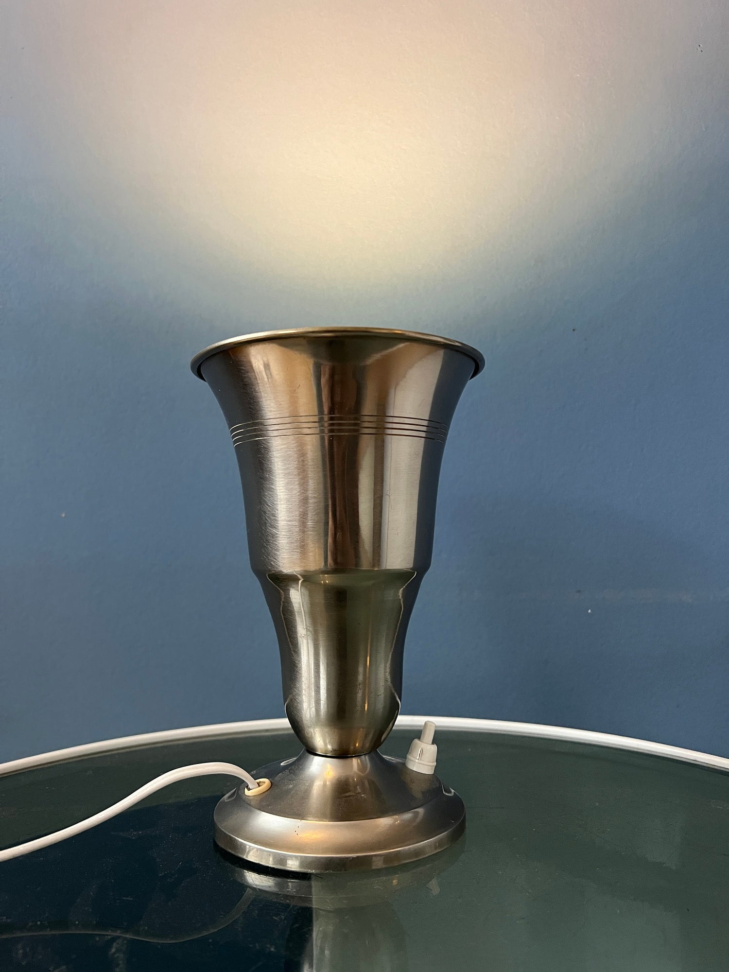Metal Uplighter 'Cup' table lamp in trumpet shape. The light nicely projects upward, reflecting nicely on the silver surface. The lamp can be switched on and off with a button on the base. The lamp requires an E26/27 lightbulb and currently has an EU-plug (usable outside EU with plug-converter).