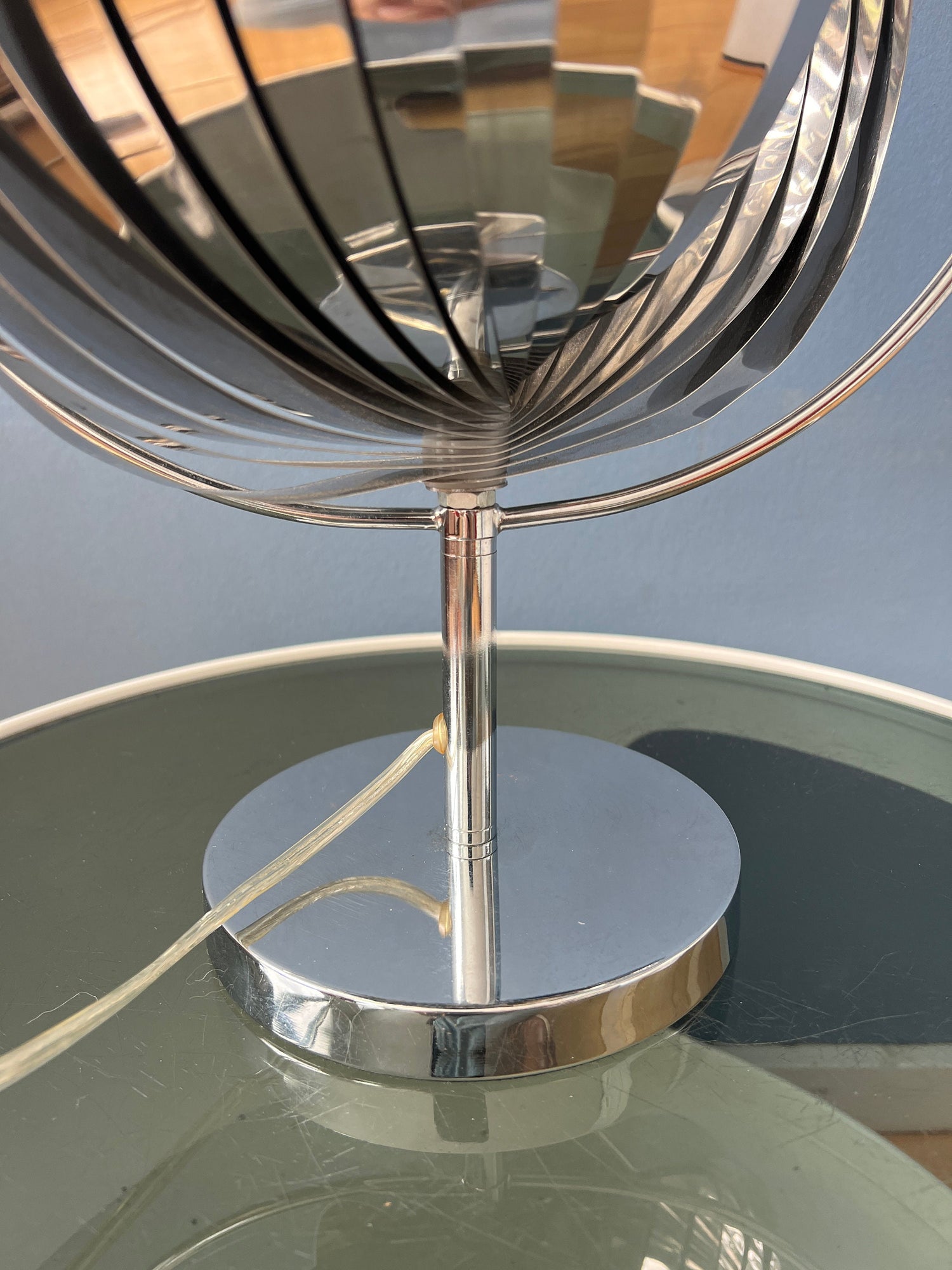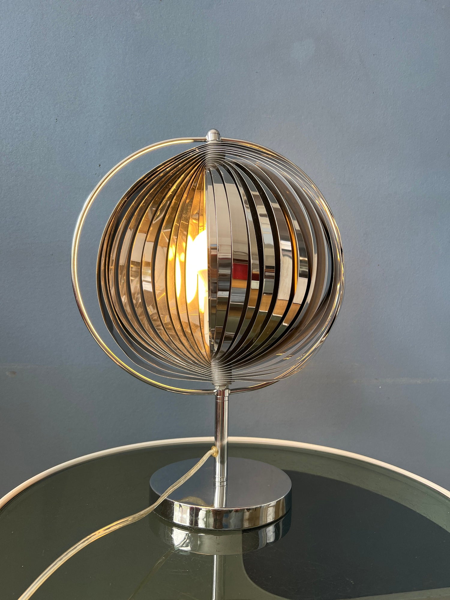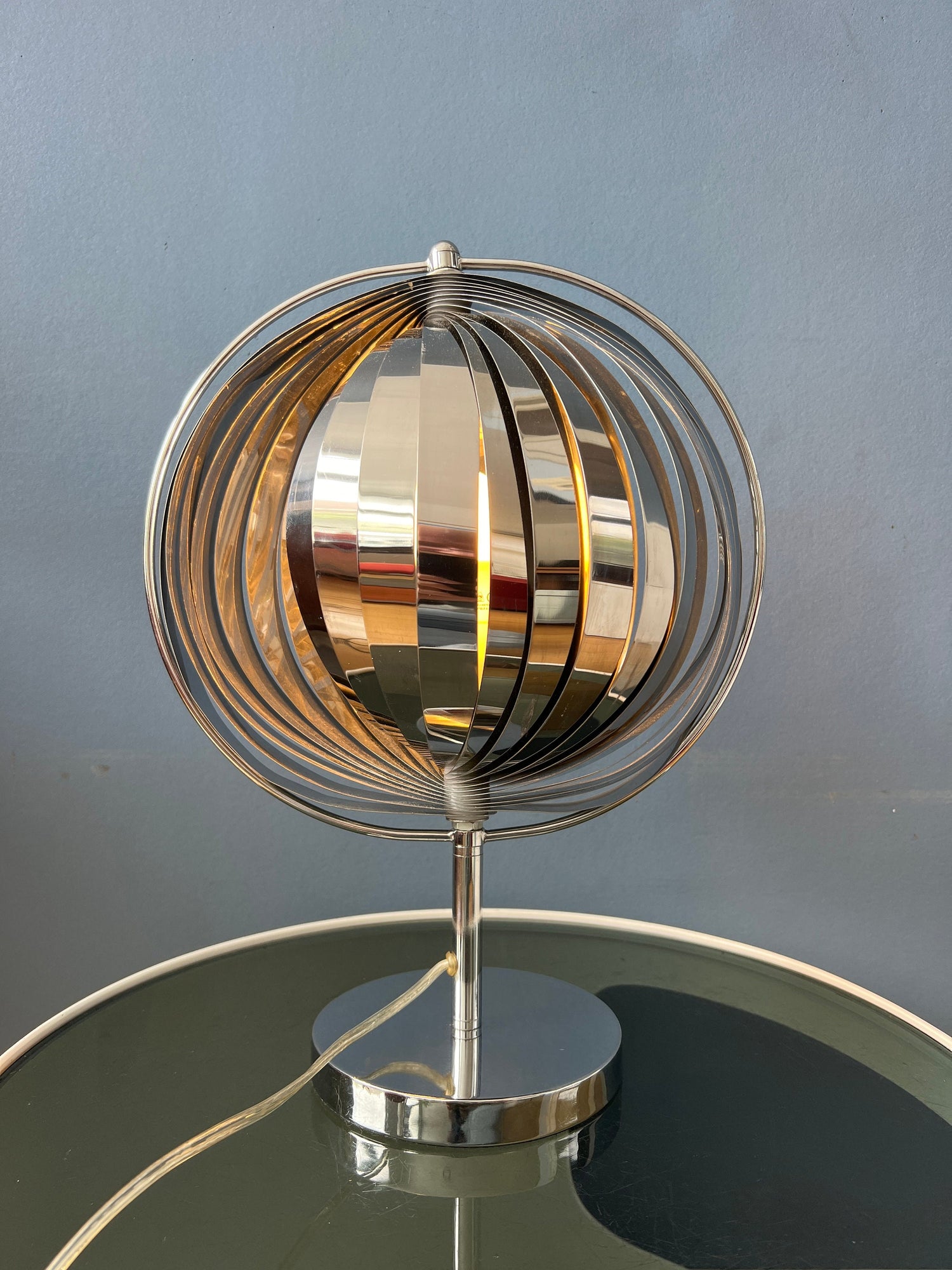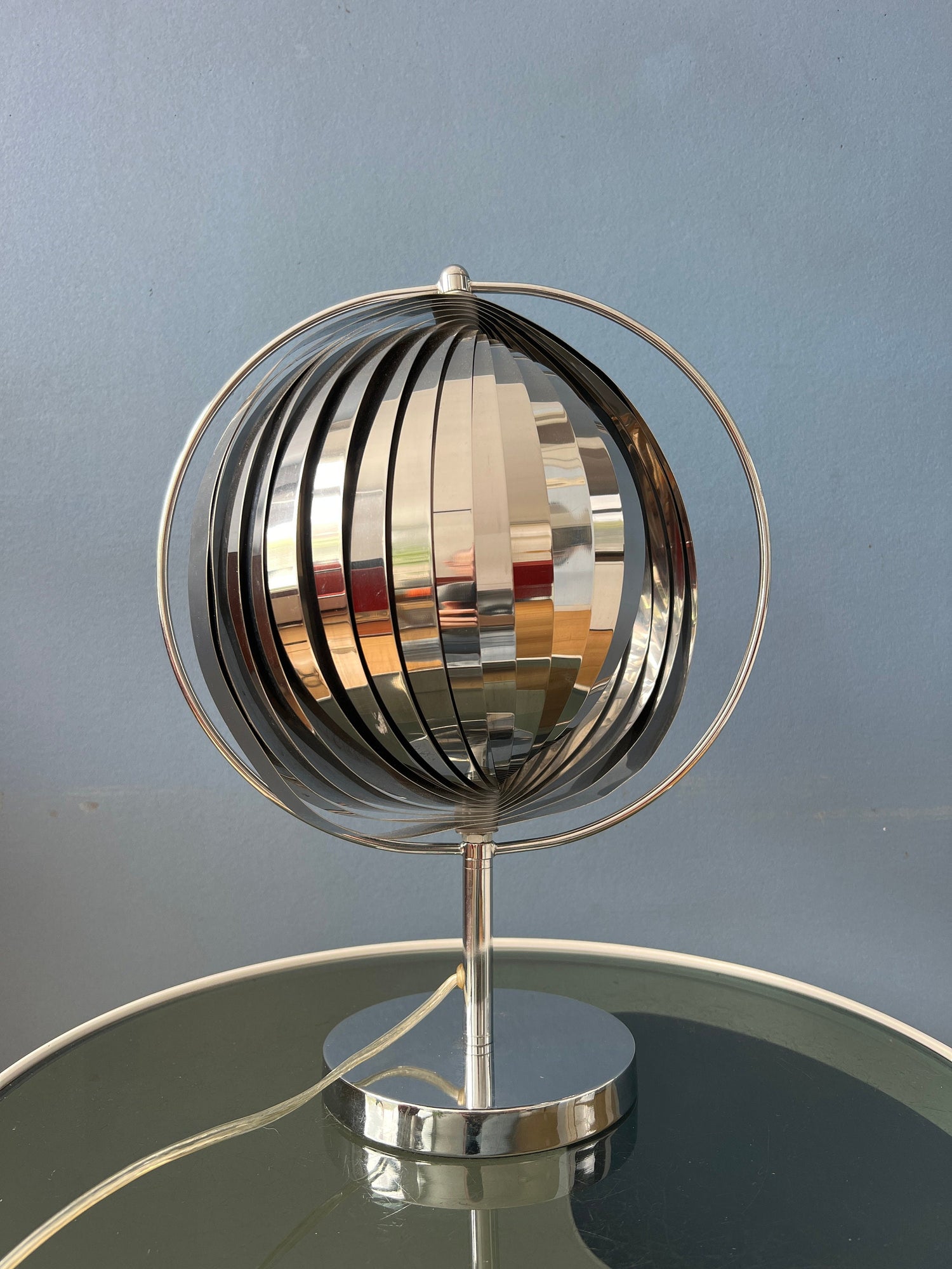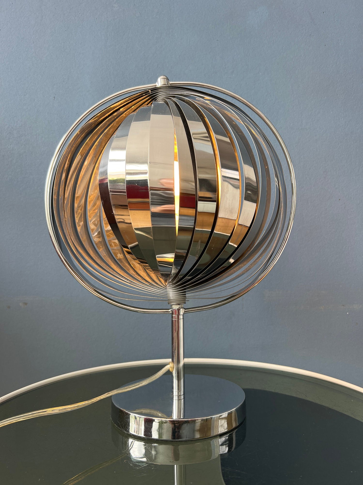Chrome 'moon' desk lamp in the style of Henri Matthieu (remake). The light nicely spreads and beautifully reflects on the chrome swirls. The lamp requires an E26/27 lightbulb and currently has an EU-plug (usable outside EU with plug-converter).