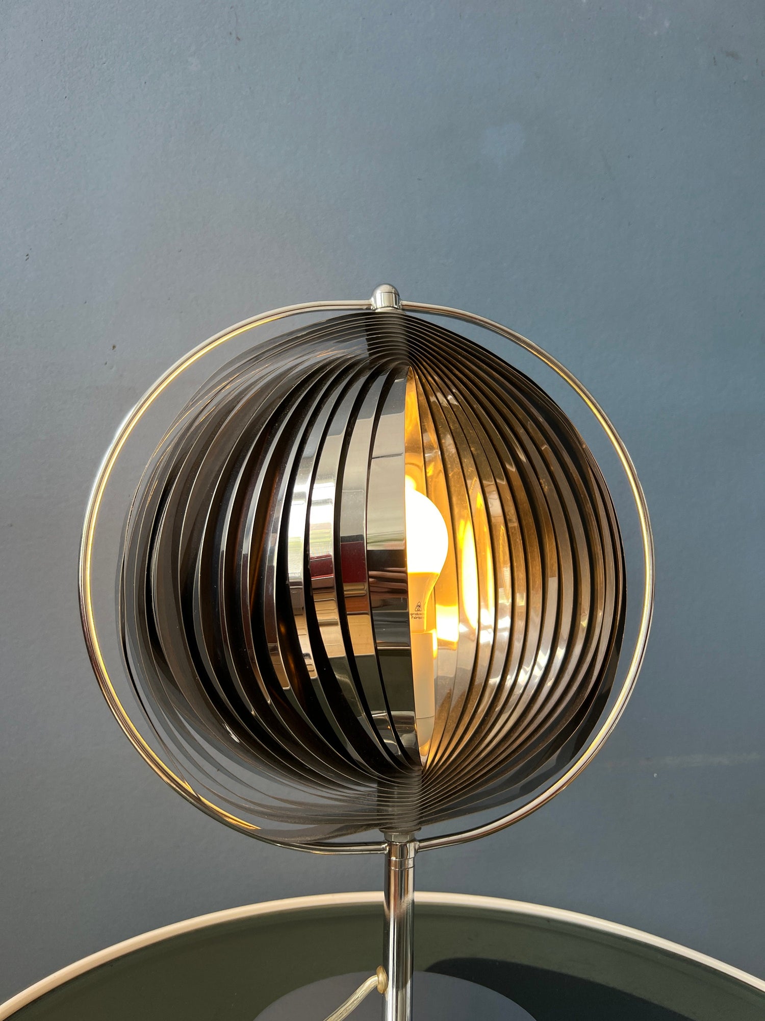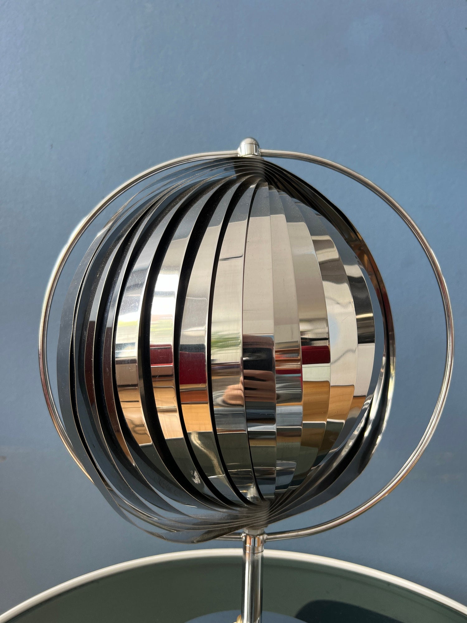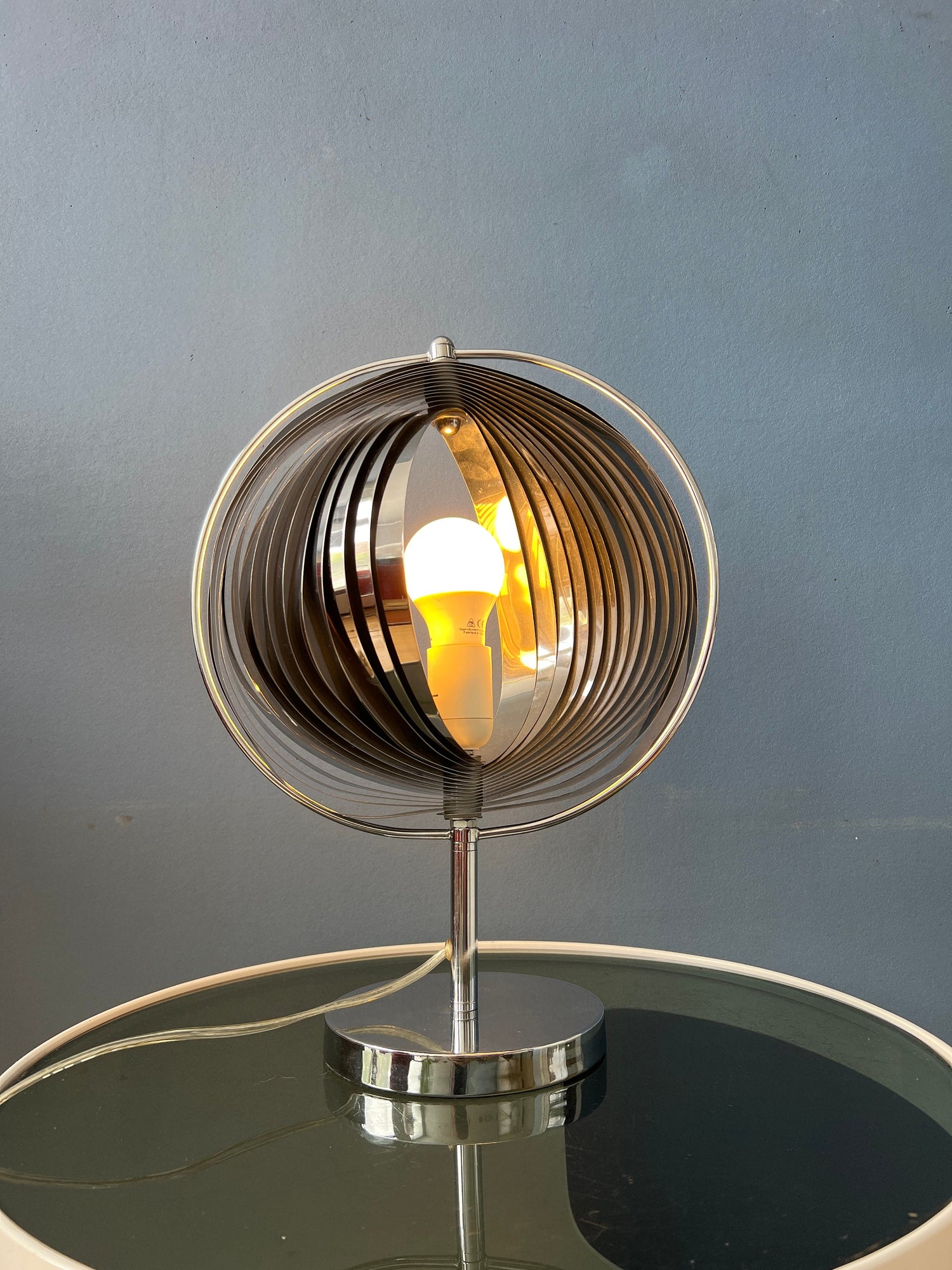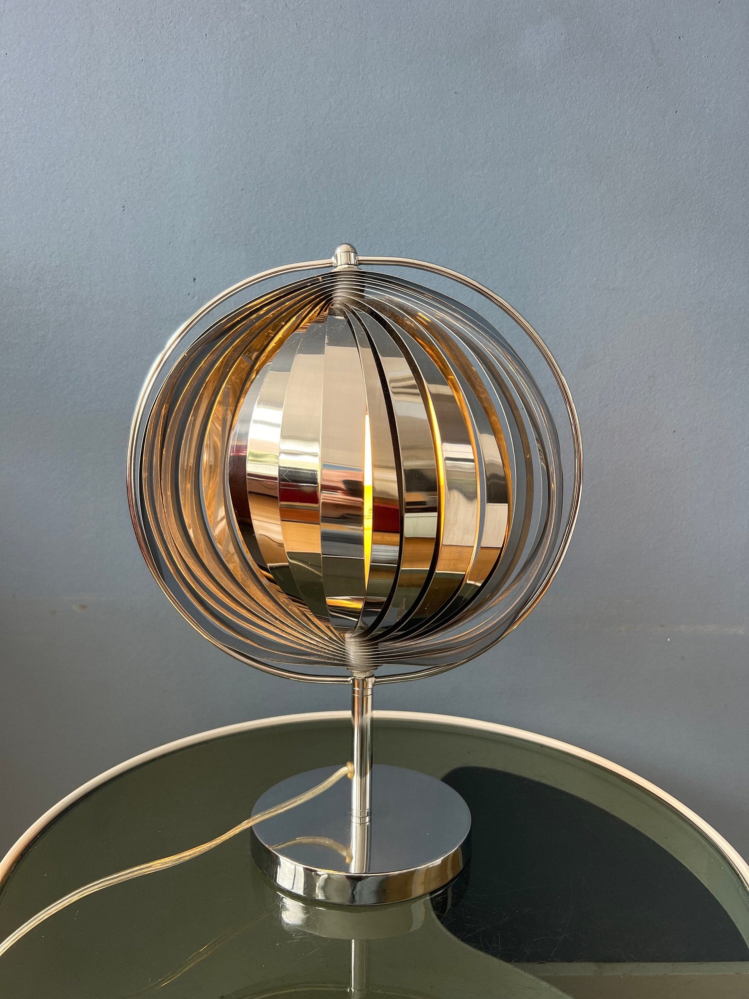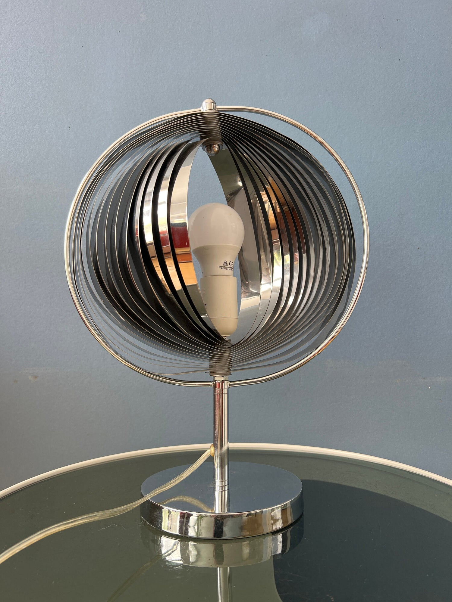 Chrome 'moon' desk lamp in the style of Henri Matthieu (remake). The light nicely spreads and beautifully reflects on the chrome swirls. The lamp requires an E26/27 lightbulb and currently has an EU-plug (usable outside EU with plug-converter).