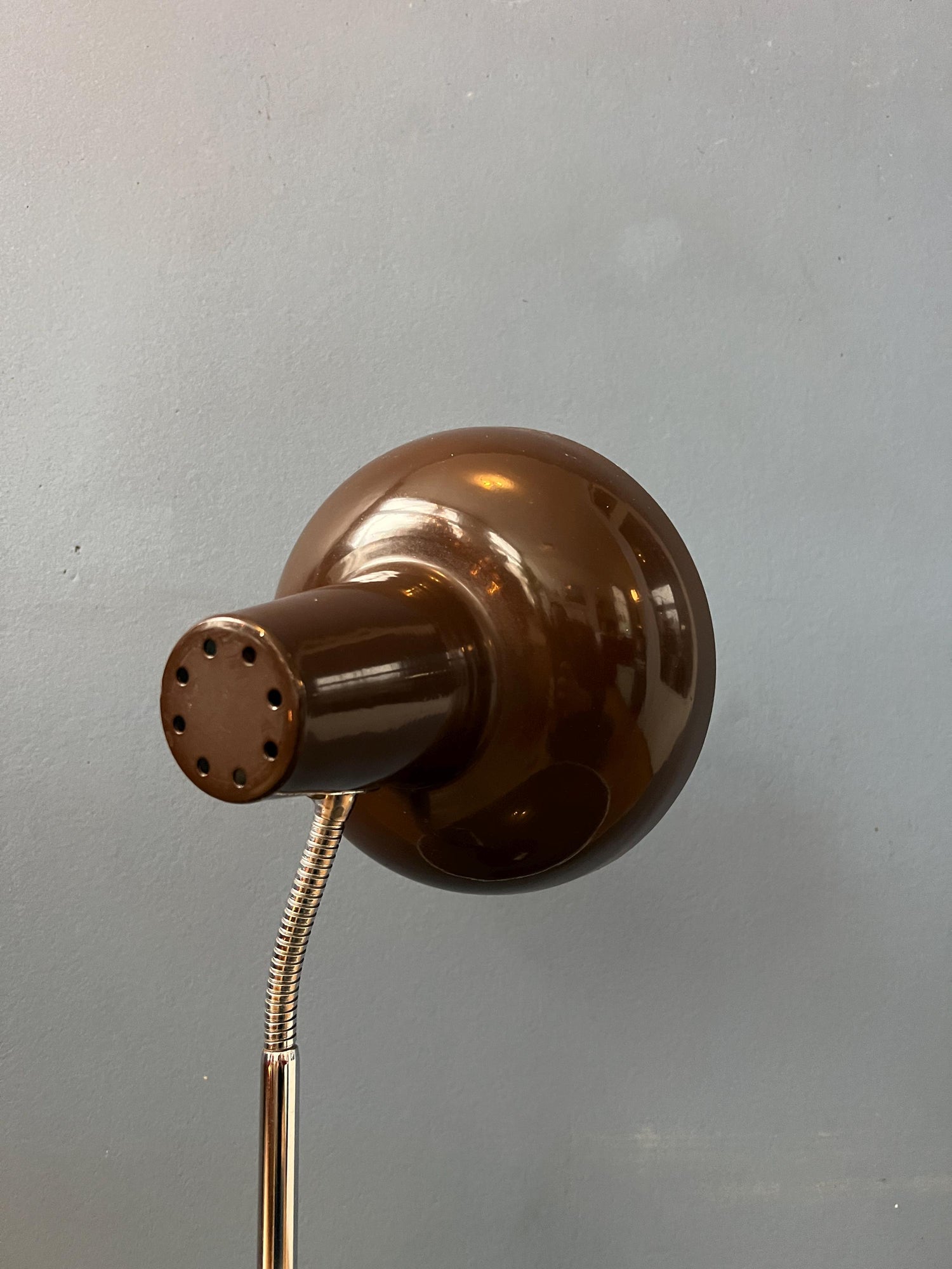 Small metal desk lamp in brown colour. The position of the shade can be adjusted. The lamp has a switch on the base. The lamp requires one E14 lightbulb and currently has an EU plug (easily used outside EU with plug-converter).