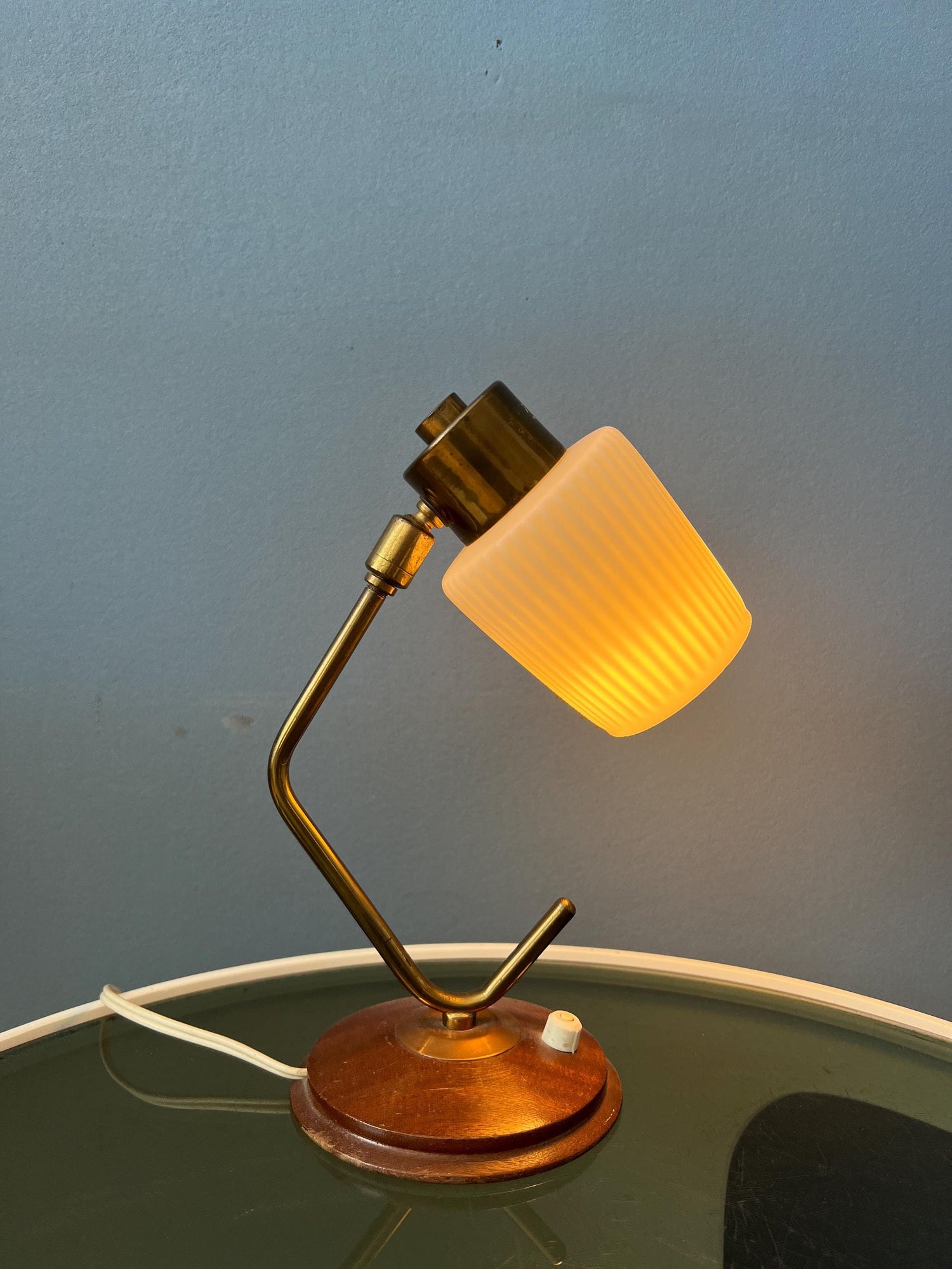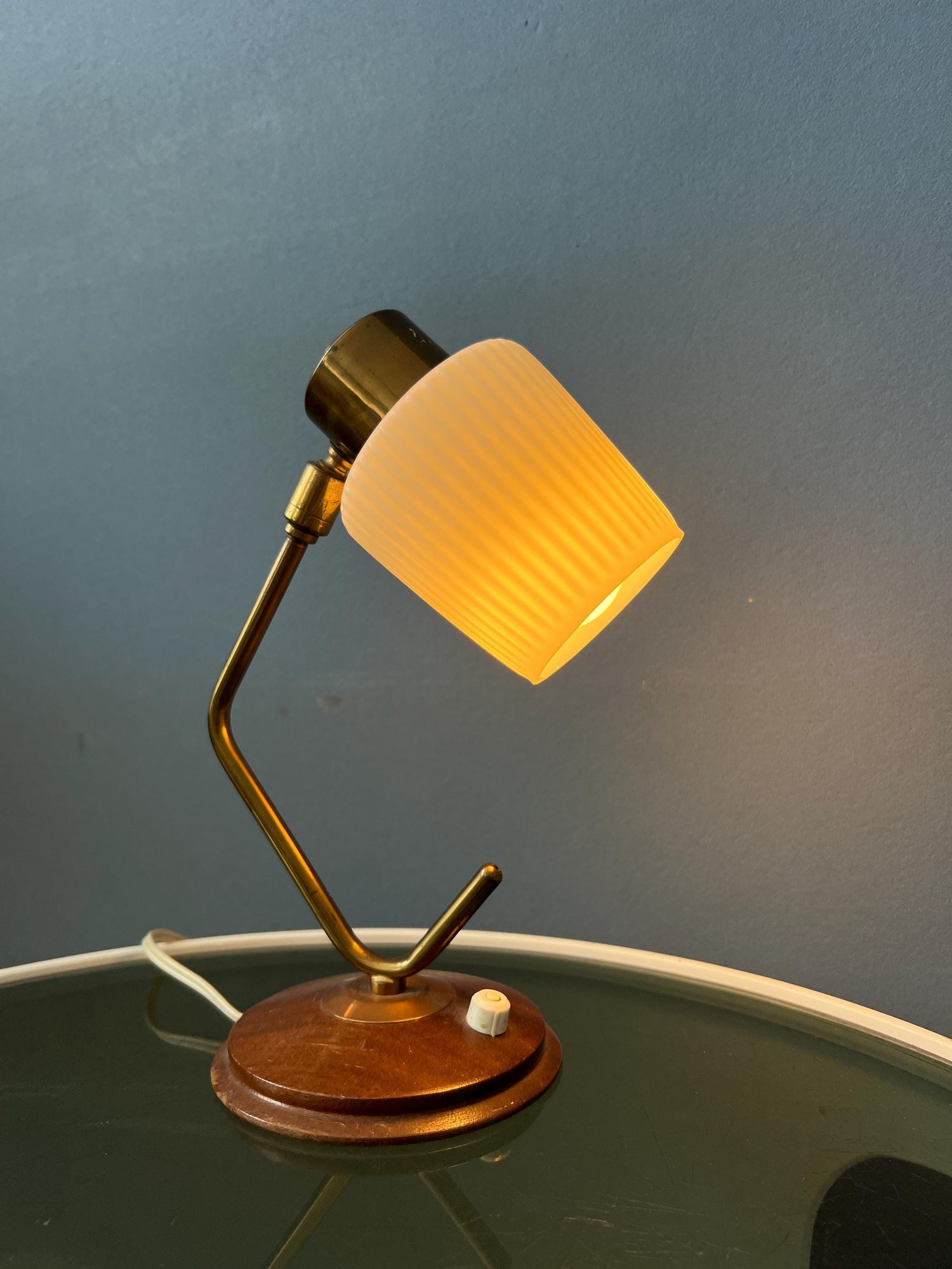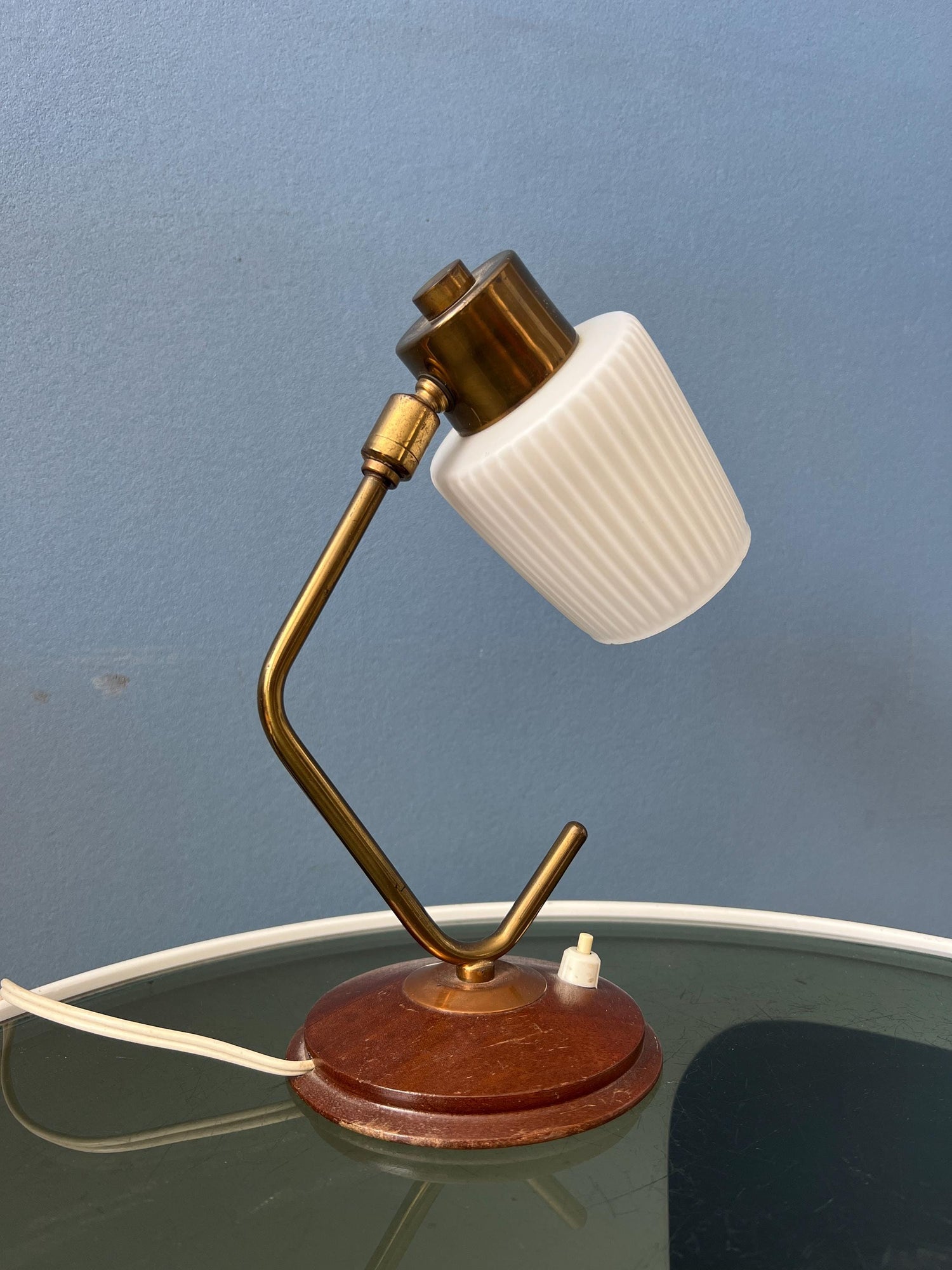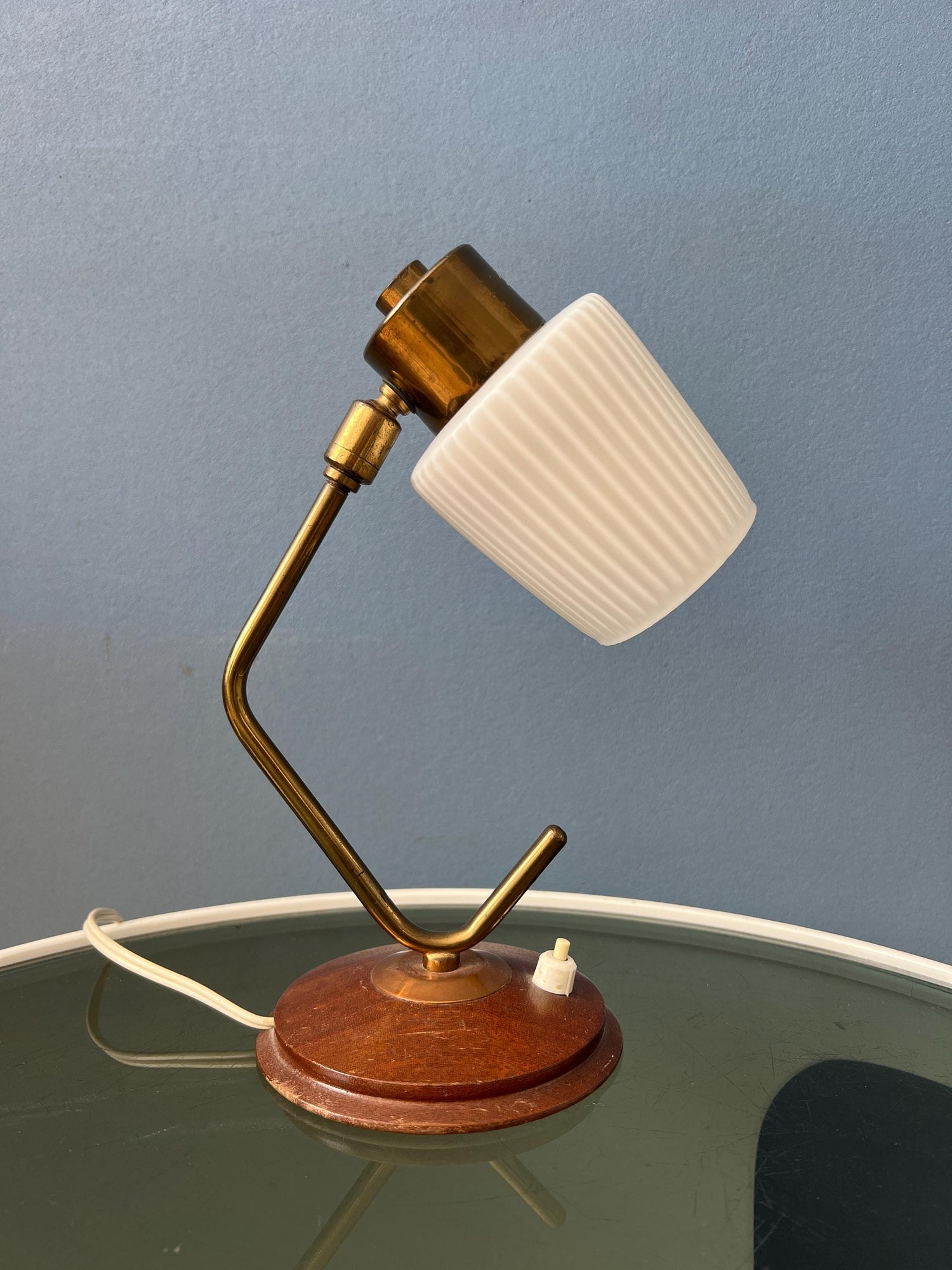 Mid century art deco style table lamp with opaline glass shade. The piece has a brass frame and a wooden base. The angle of the milk glass shade can be adjusted. The lamp requires one E27/26 (standard) lightbulb and currently has an EU-plug.
