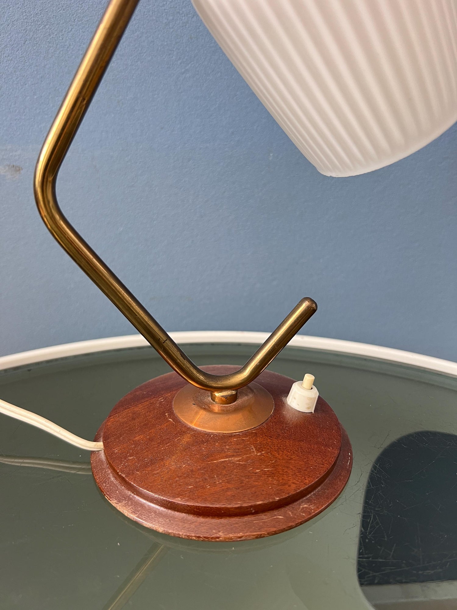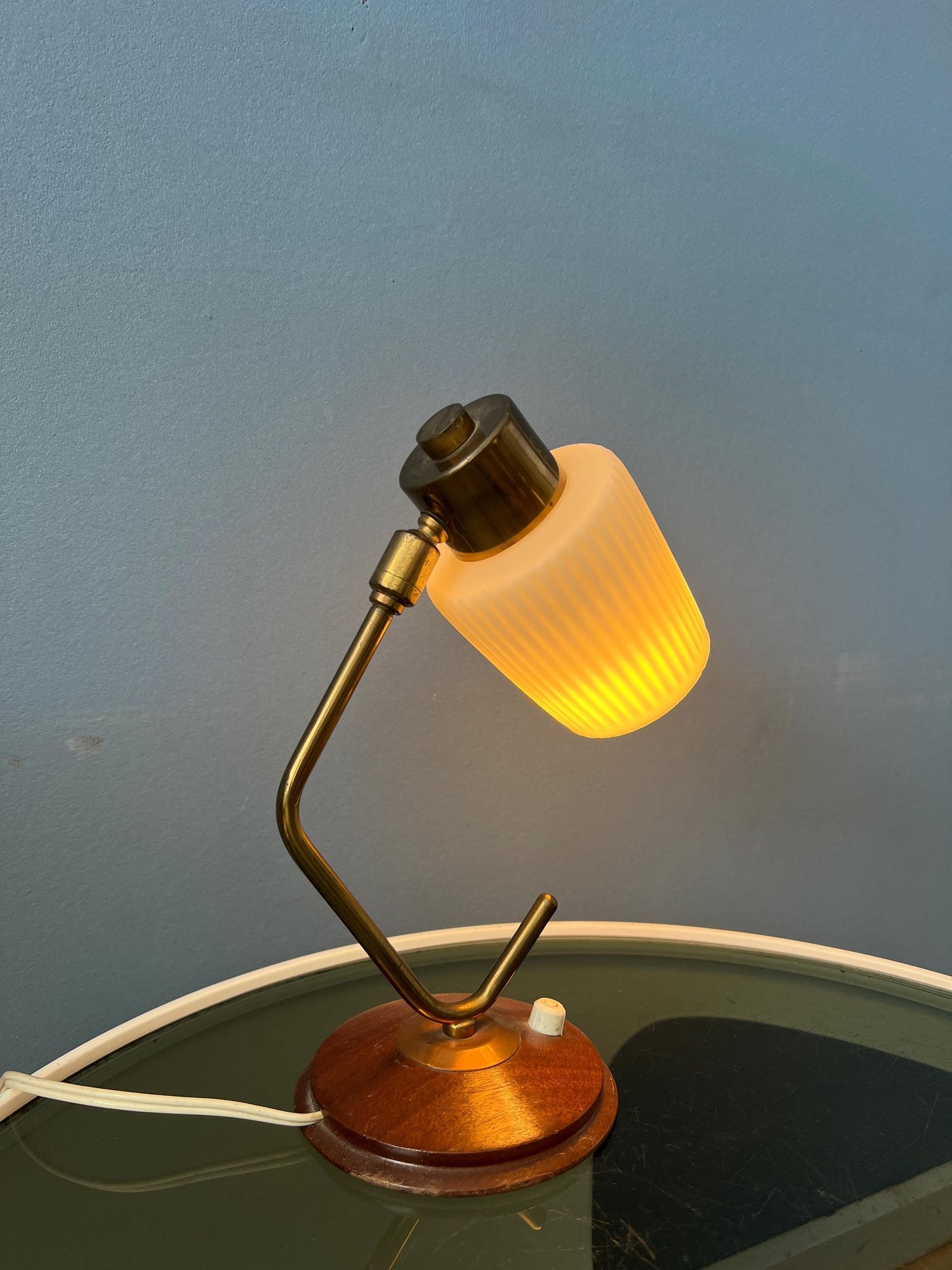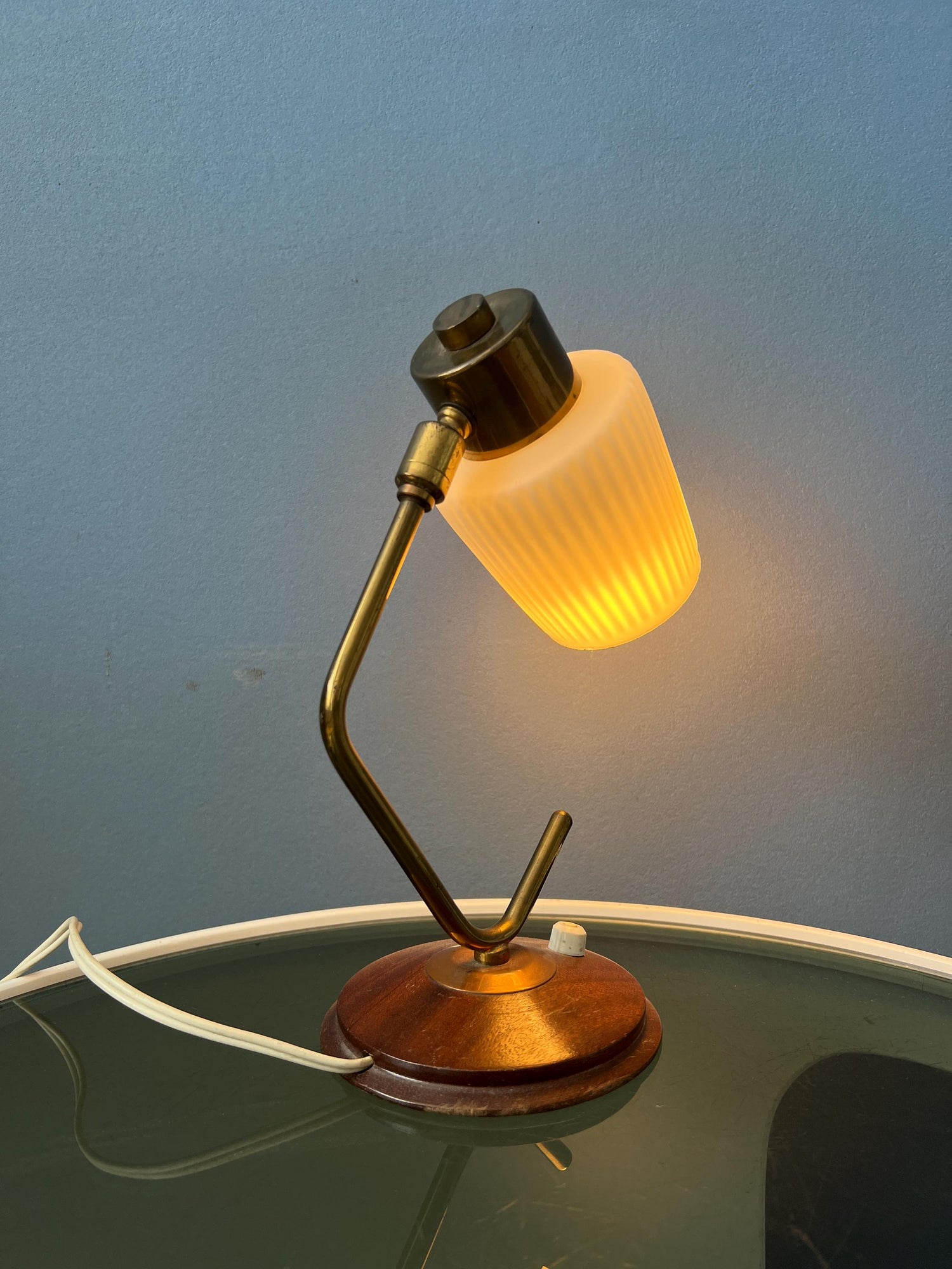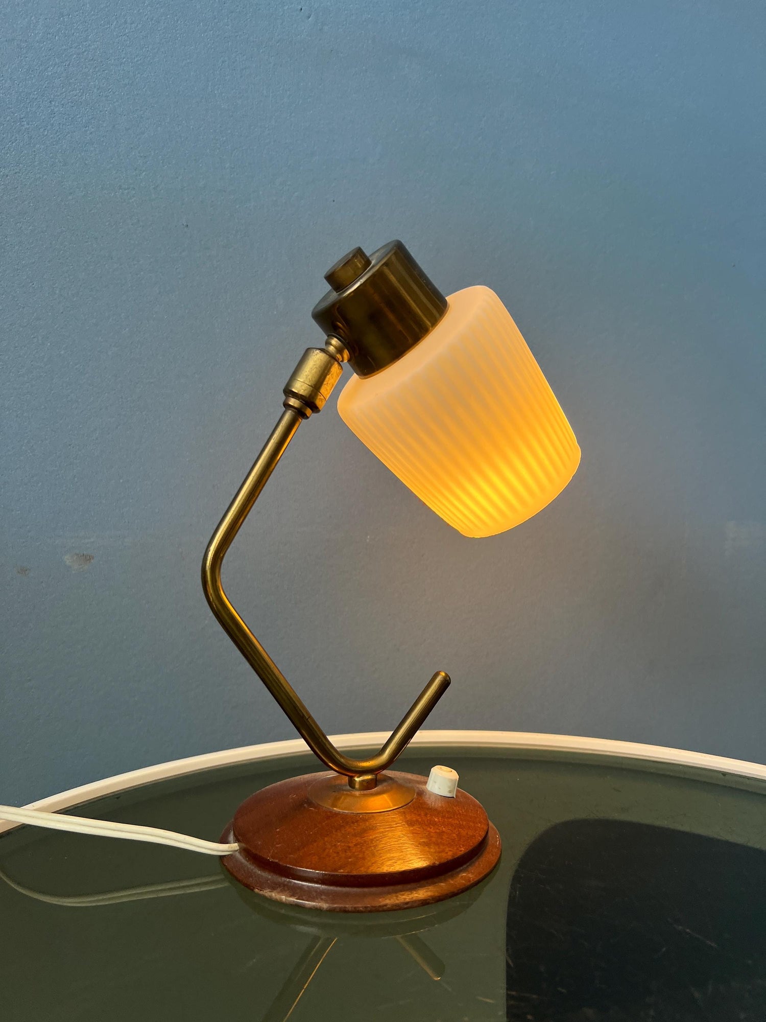 Mid century art deco style table lamp with opaline glass shade. The piece has a brass frame and a wooden base. The angle of the milk glass shade can be adjusted. The lamp requires one E27/26 (standard) lightbulb and currently has an EU-plug.