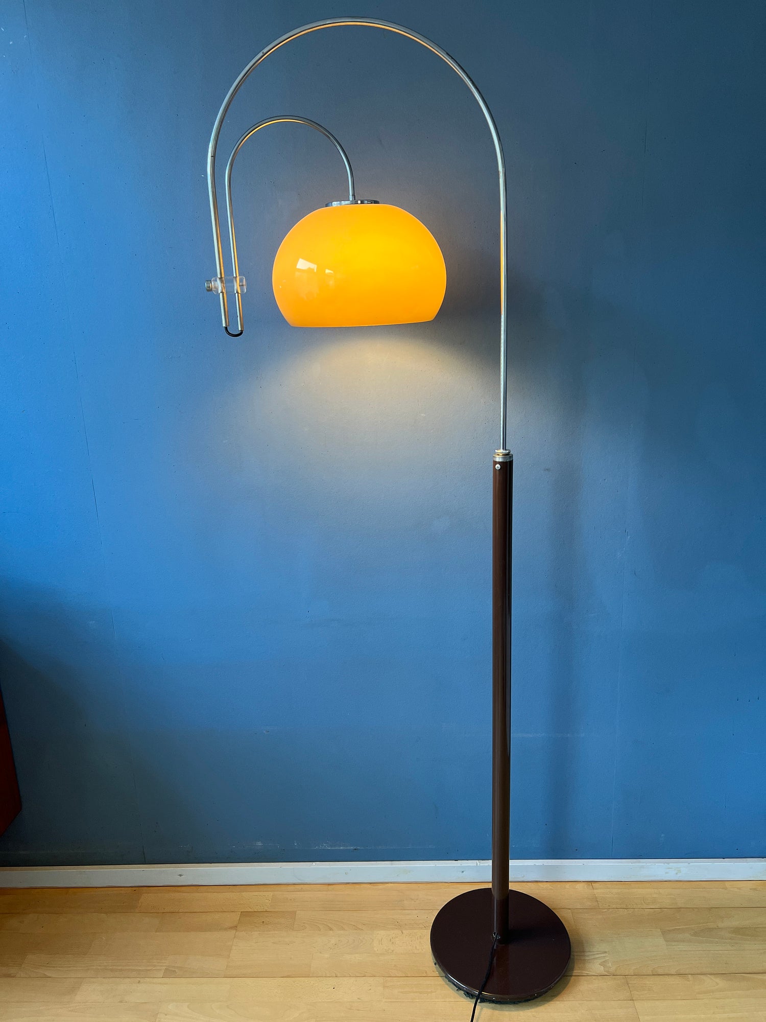 Very rare vintage Artiforte 'double arc' floor lamp with mushroom shade. The inner arc can be positioned underneath the main arc as well as outside of it. The lamp can be adjusted in height by loosening up the metal knob on the base, see picture. The beige/brown shade is made out of acrylic glass. The lamp requires an E27/26 bulb and currently has an EU plug.