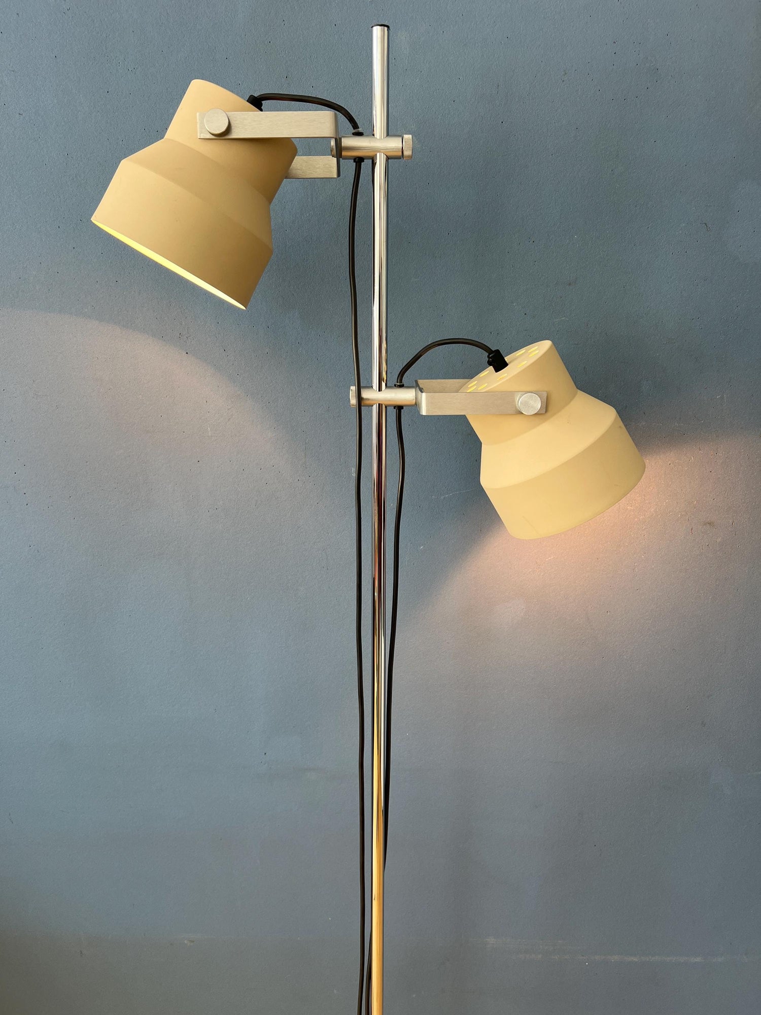 Beige mid century Dijkstra floor lamp with two metal adjustable shades. The two spots can be moved up and down the base and adjusted in any direction desirable. The lamp requires two E27/26 lightbulbs and currently has an EU-plug (directly usable outside EU with plug converter).