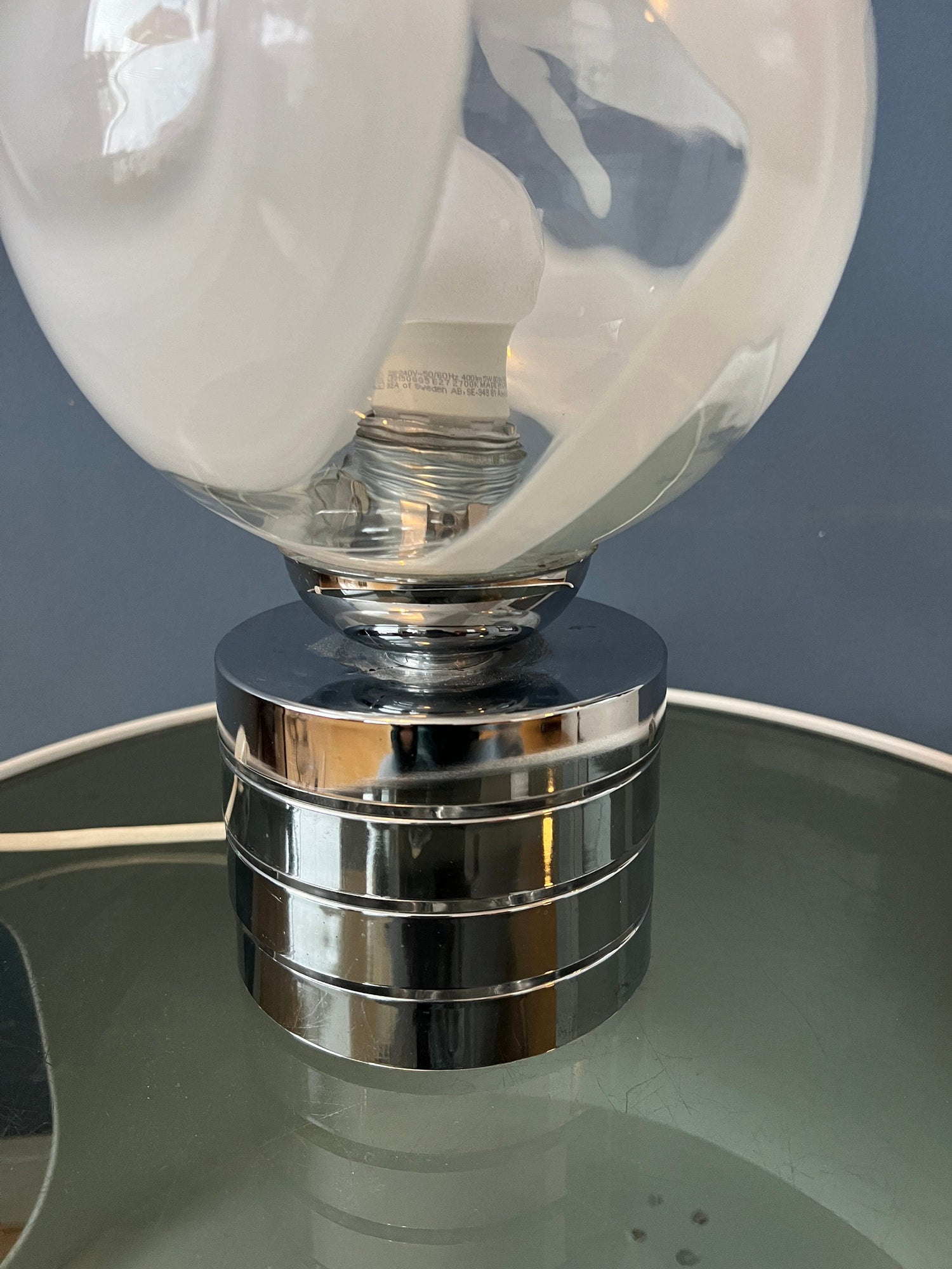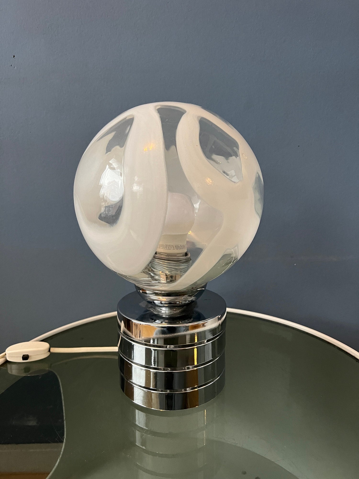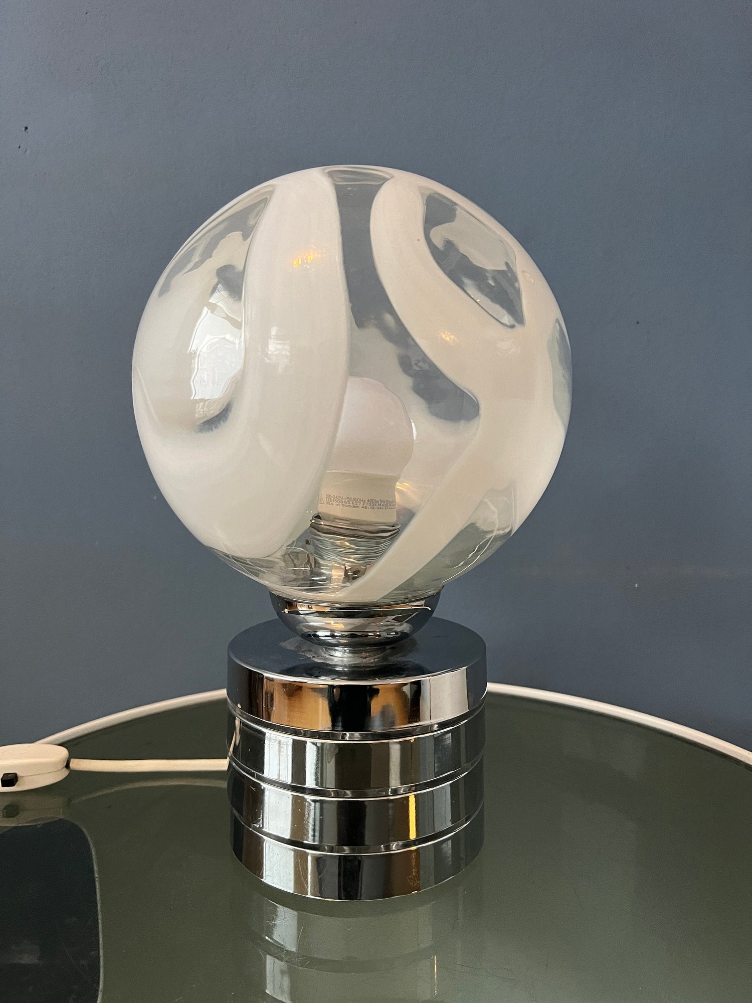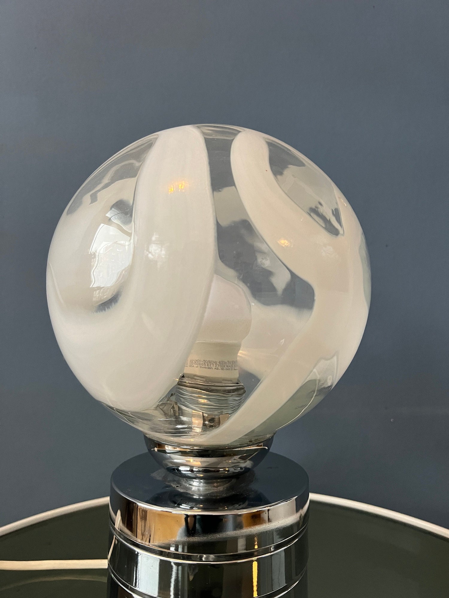 Mid century glass table lamp with chrome base and glass shade. The metal base is pretty heavy for such a small lamp. The patterned glass shade spreads a beautiful light. The lamp currently has an EU-plug (usable outside EU with plug-converter) and requires and E14 lightbulb.