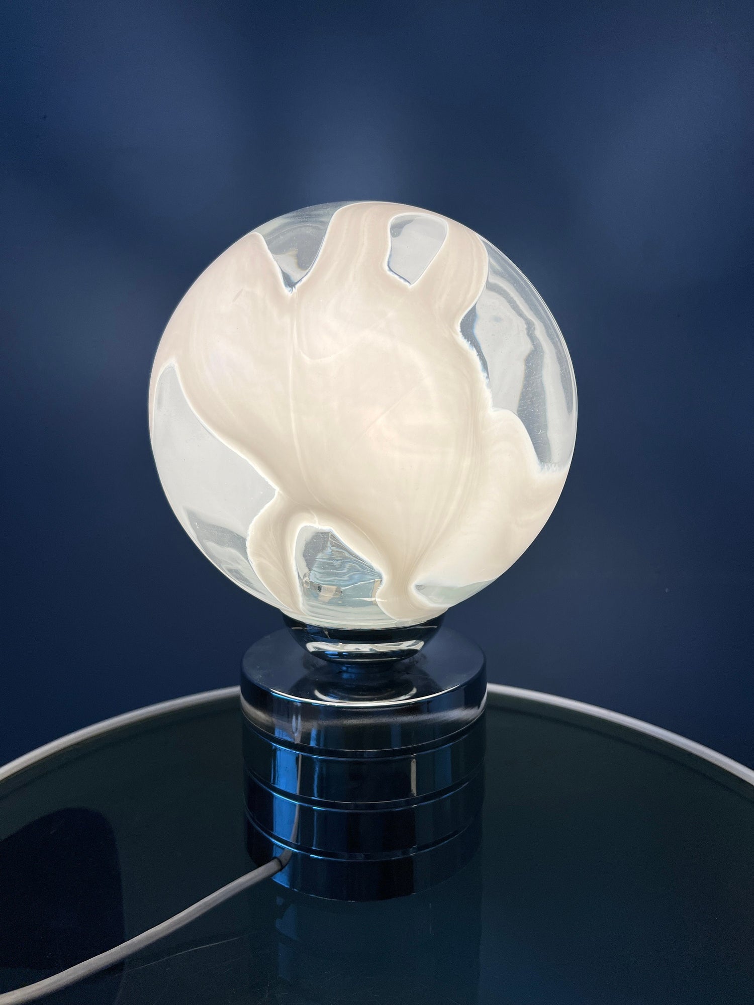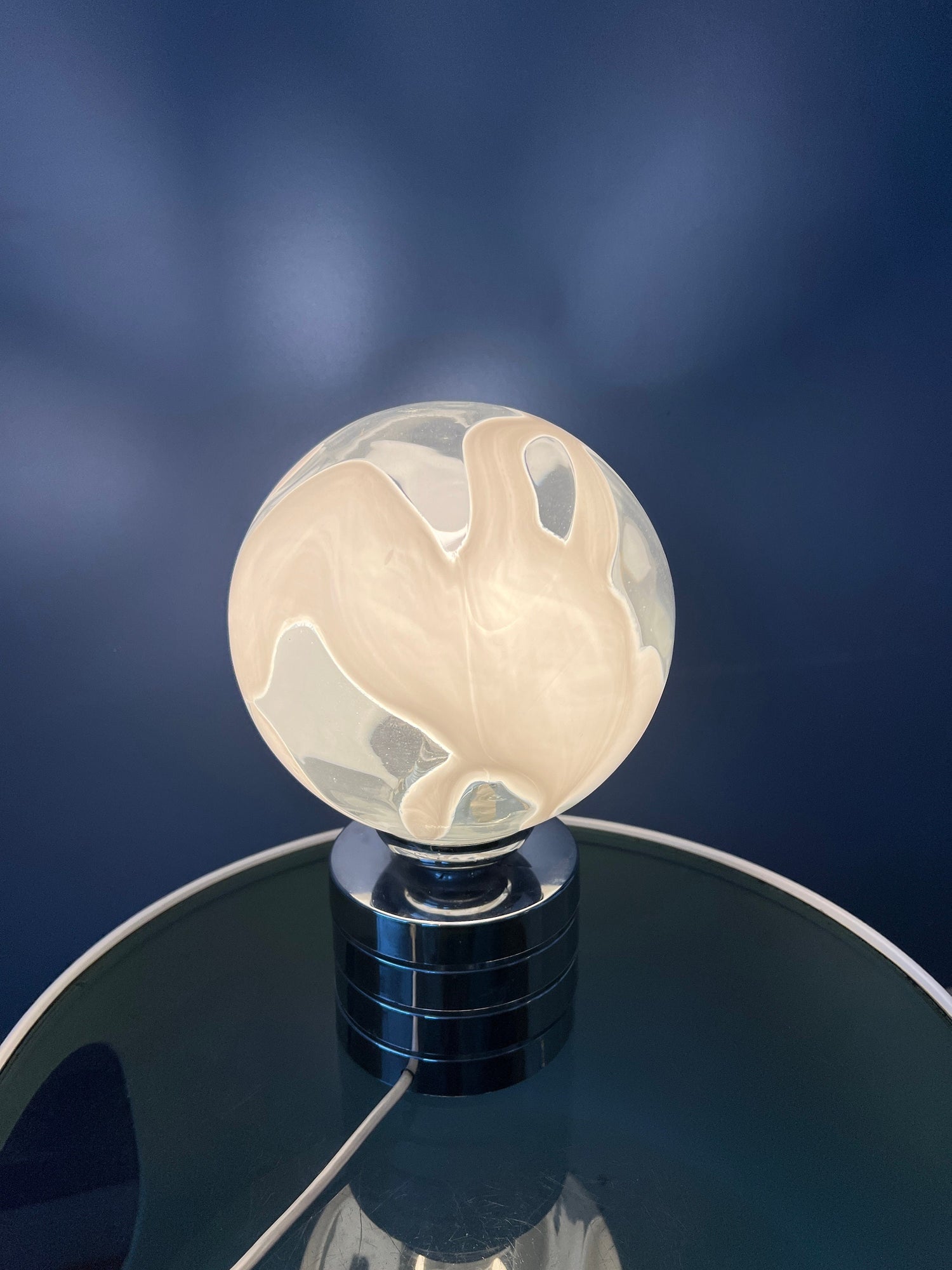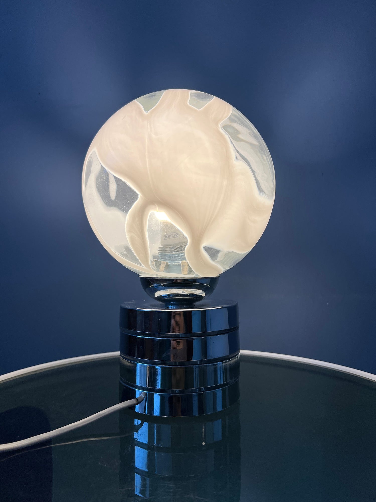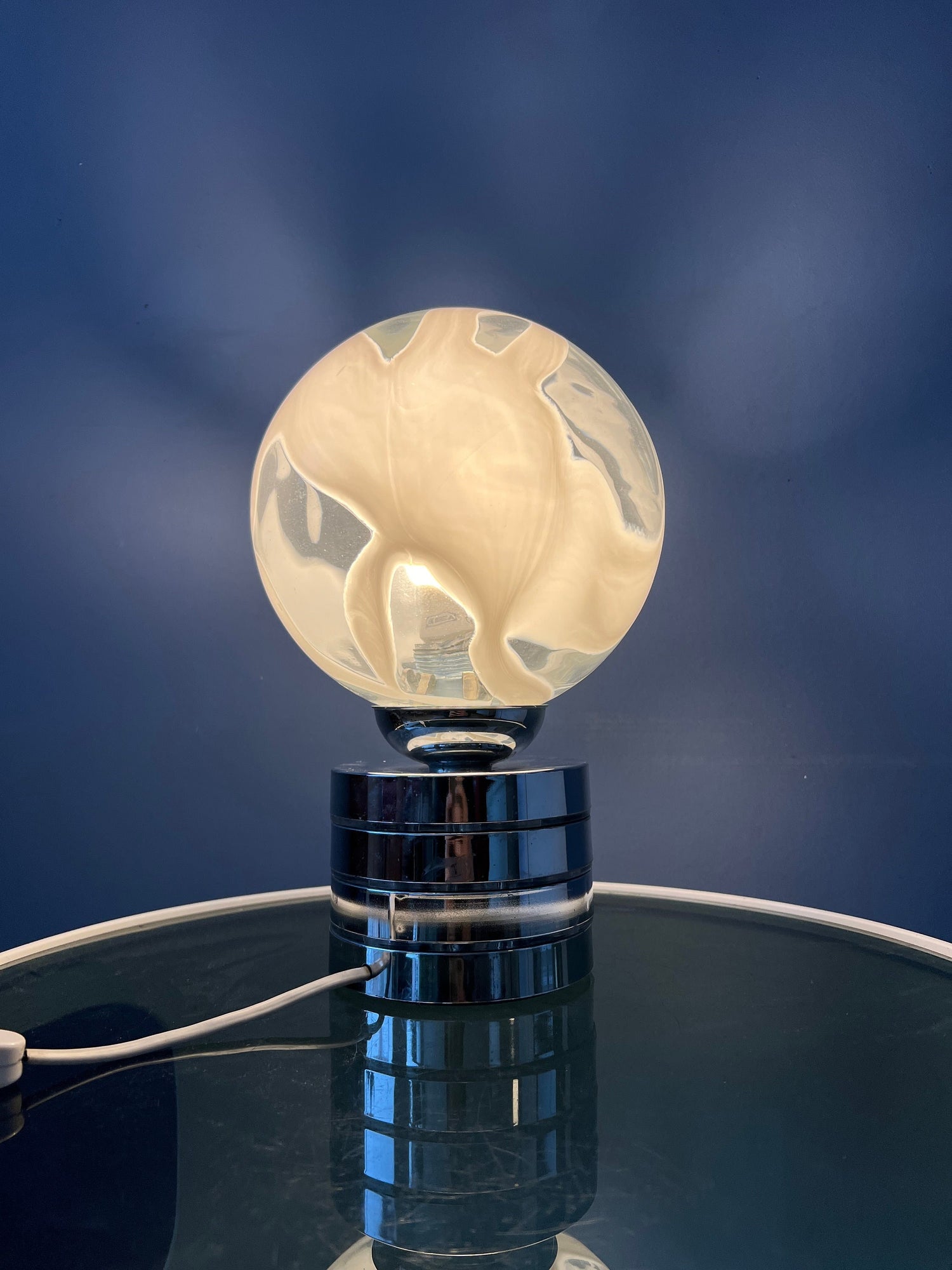 Mid century glass table lamp with chrome base and glass shade. The metal base is pretty heavy for such a small lamp. The patterned glass shade spreads a beautiful light. The lamp currently has an EU-plug (usable outside EU with plug-converter) and requires and E14 lightbulb.