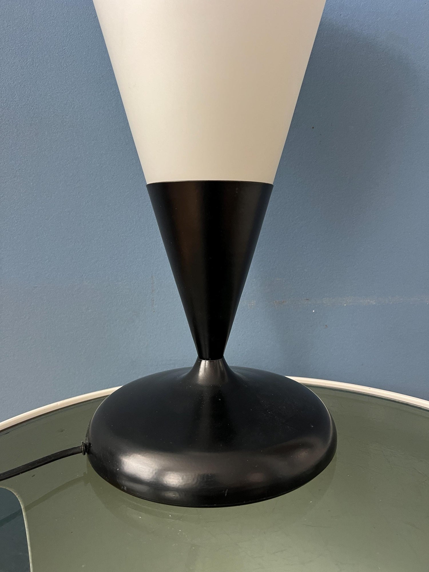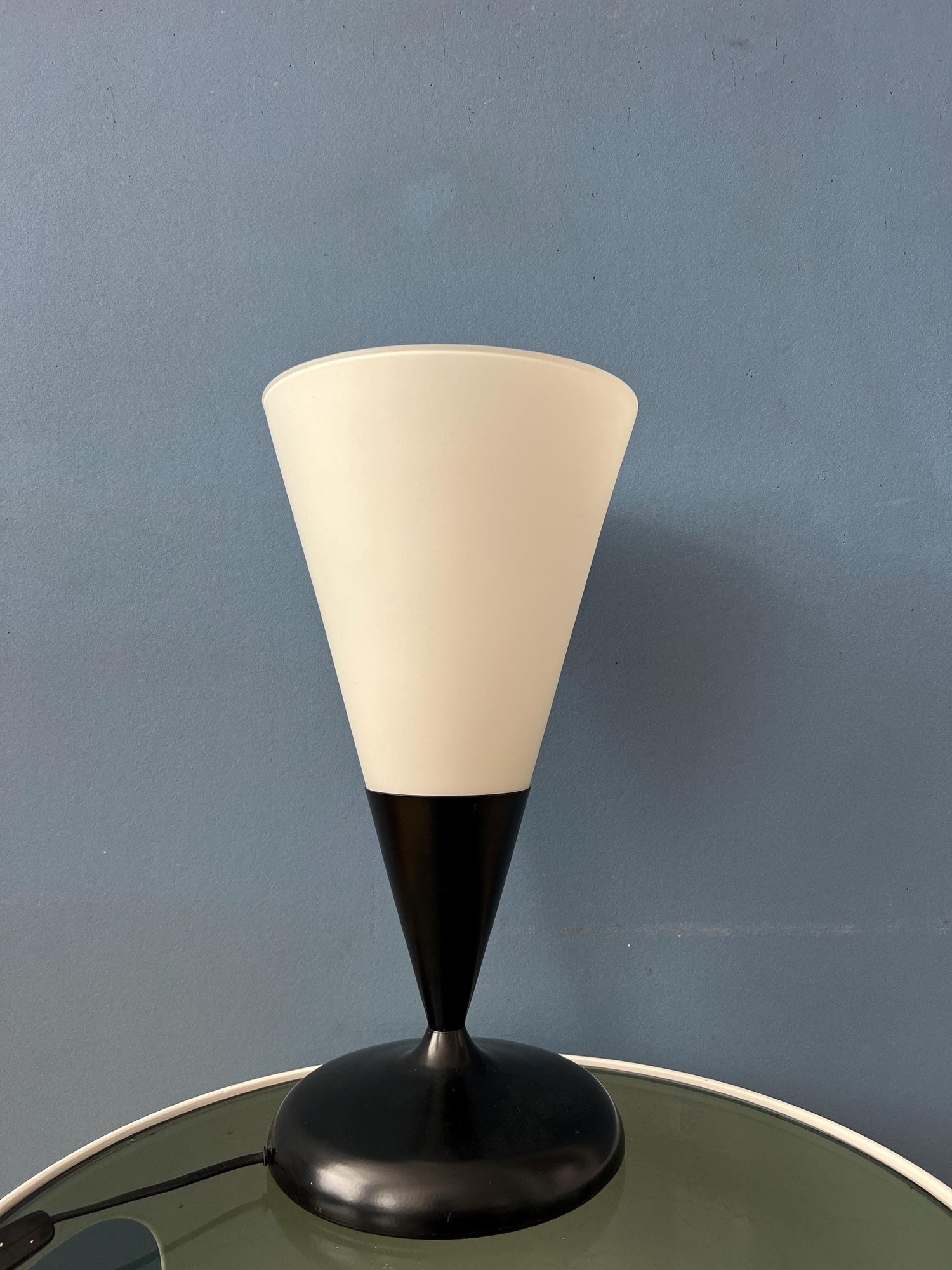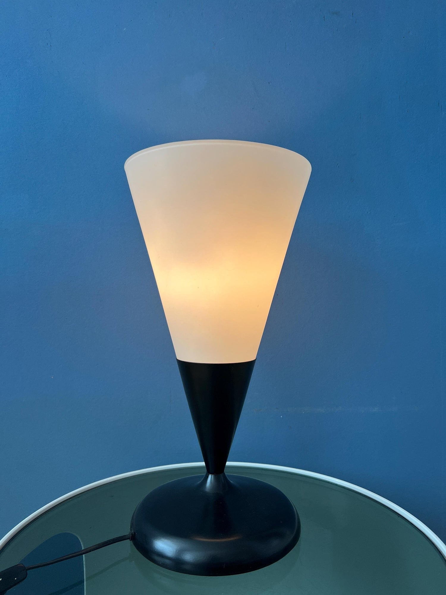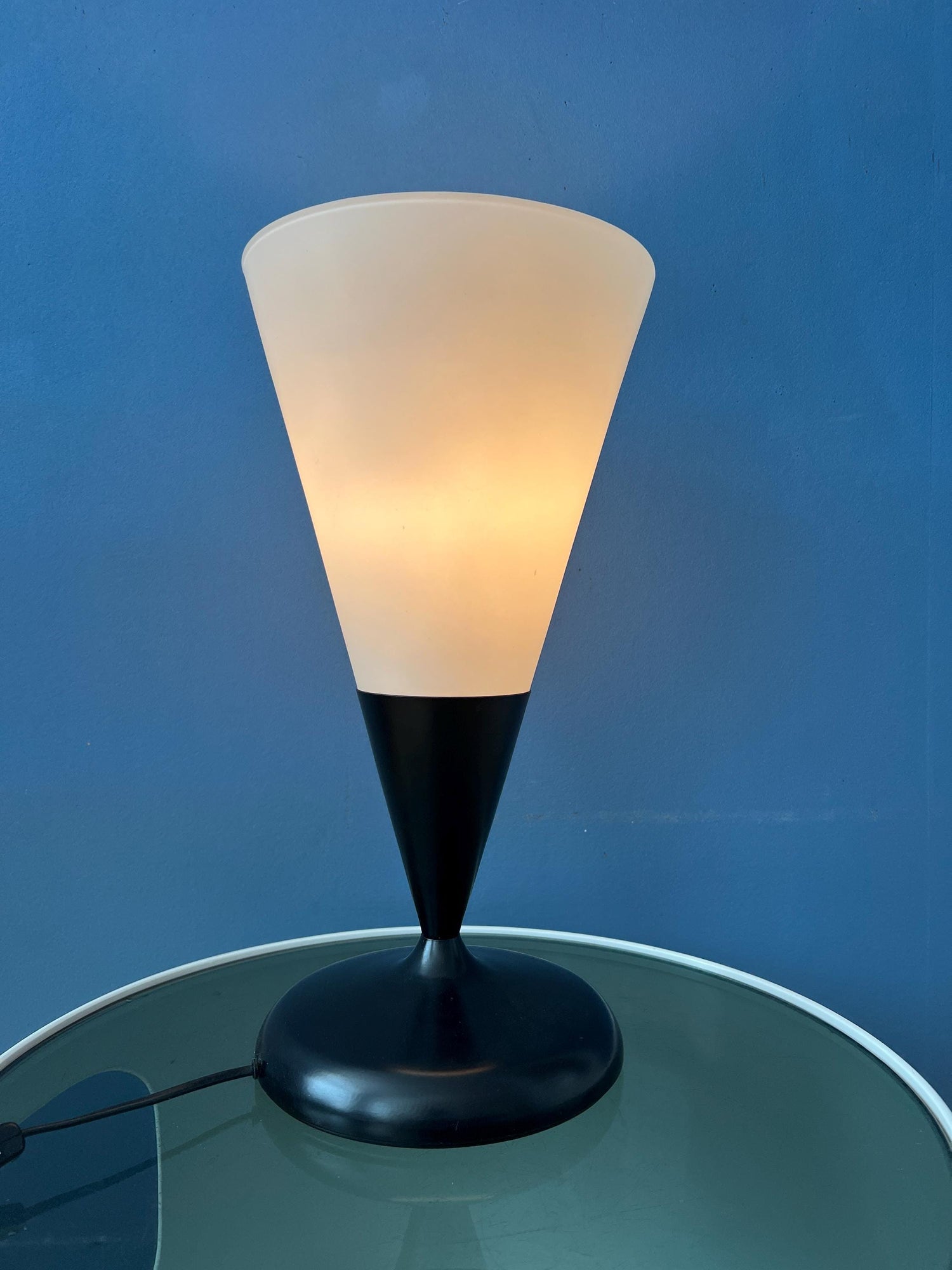 Opaline glass table in cone shape with black metal base and milk glass scone. The lamp is pretty large in size. The lamp requires one E27/26 (standard) lightbulb and currently has an EU-plug.