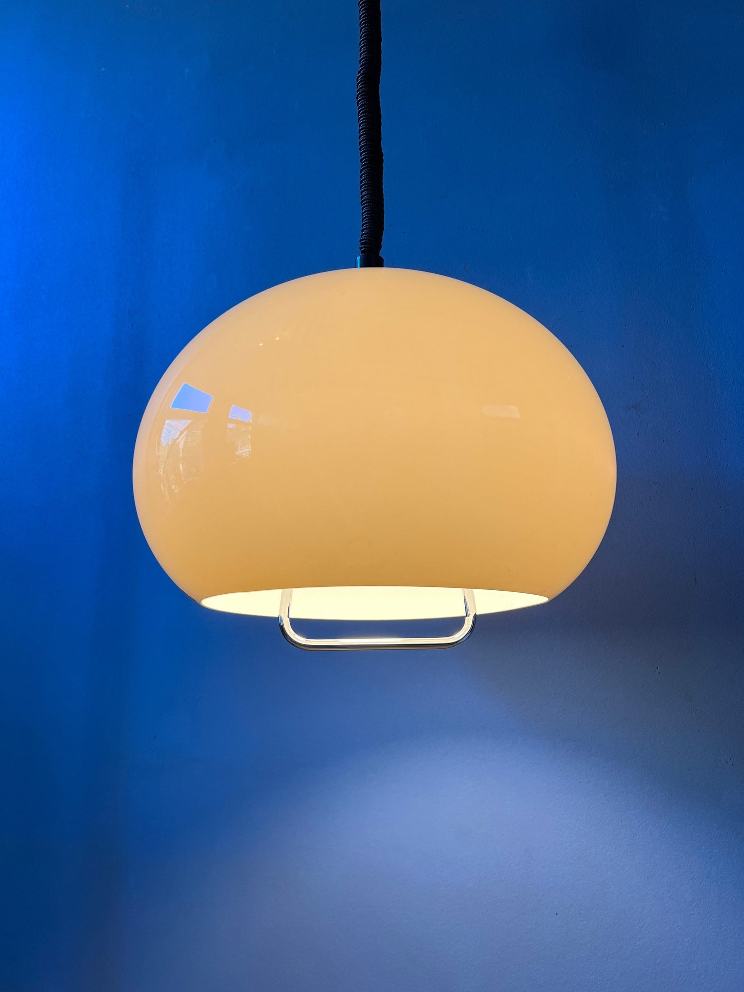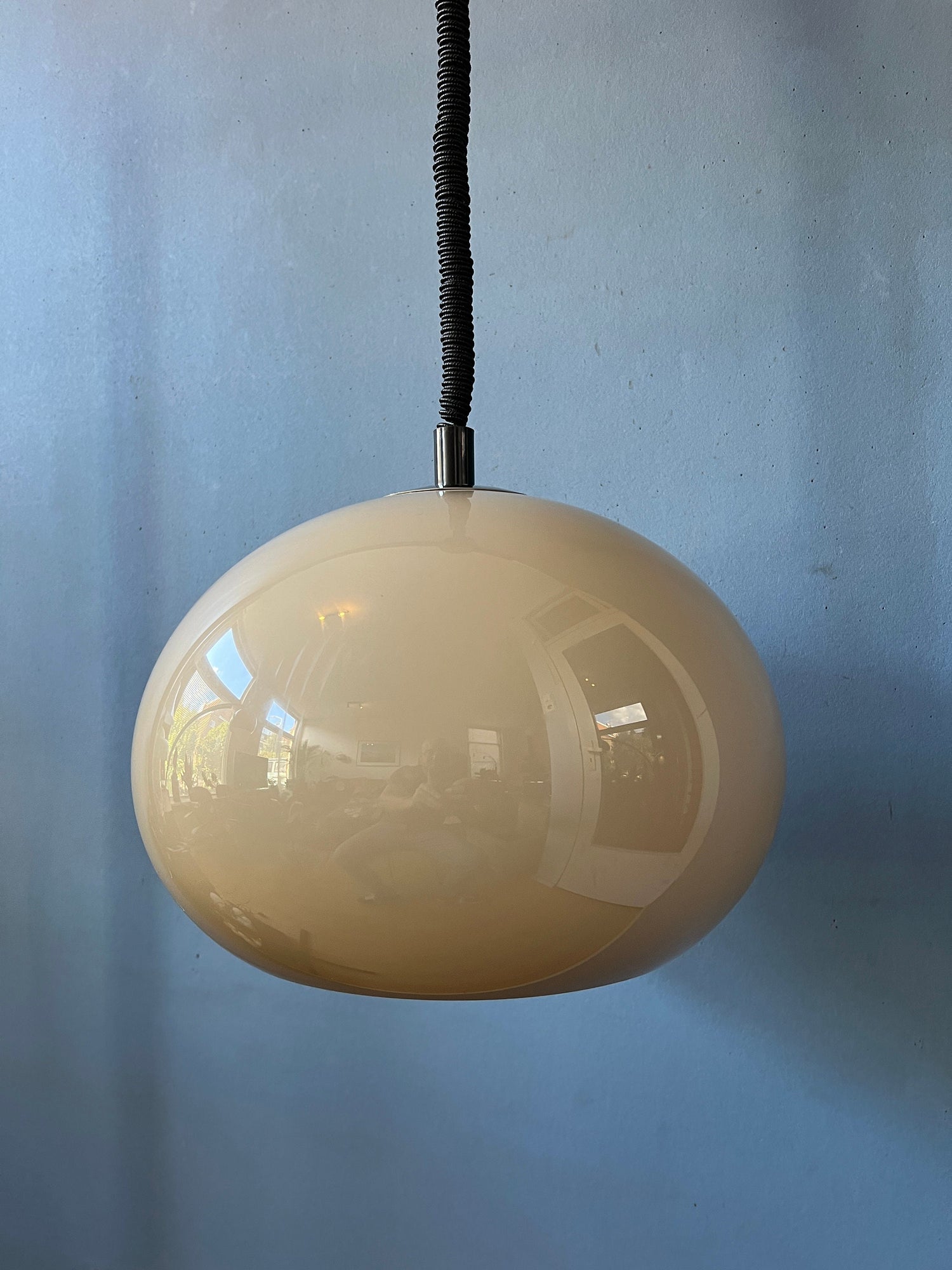 Beautiful mid century space age pendant lamp / light fixture by Dijkstra in beige/mocca colour. The shade produces a magnificent glow, reflecting nicely on the chrome element underneath the shade. The lamps requires an E27 (standard) lightbulb.