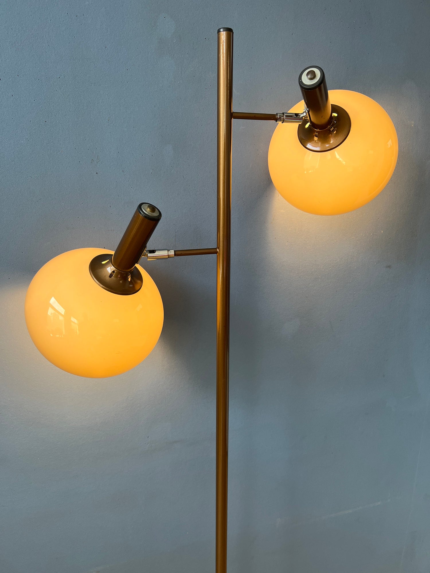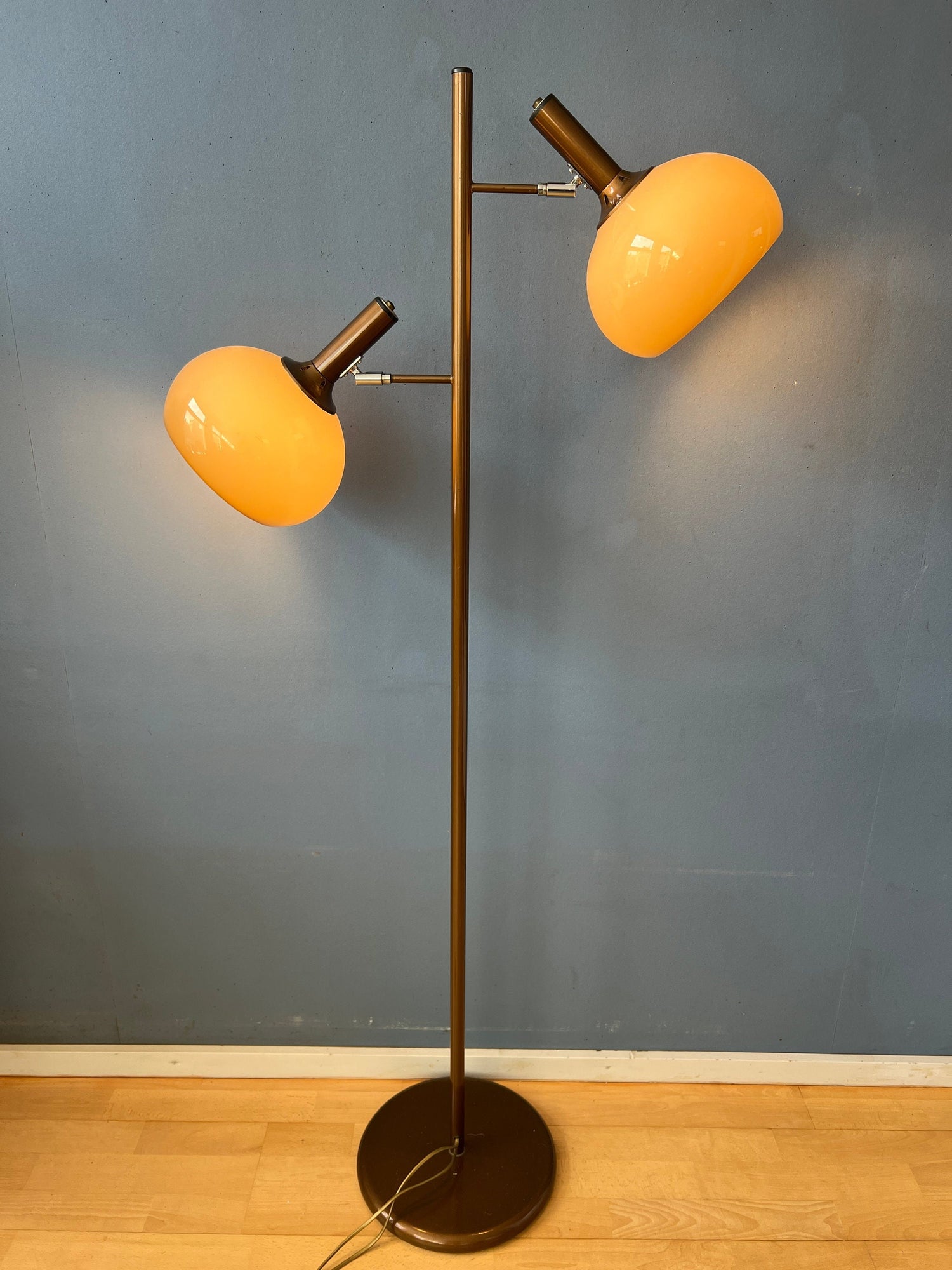 Unique space age mushroom floor lamp by Dijkstra. The mushroom spots can turned in any direction desirable. The footswitch allows you to switch on the lights simultaneously or separately. The lamp requires two E27 lightbulbs.