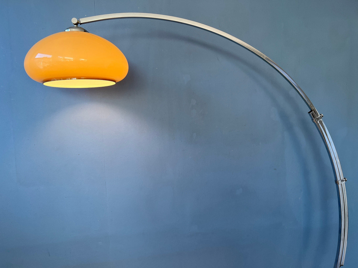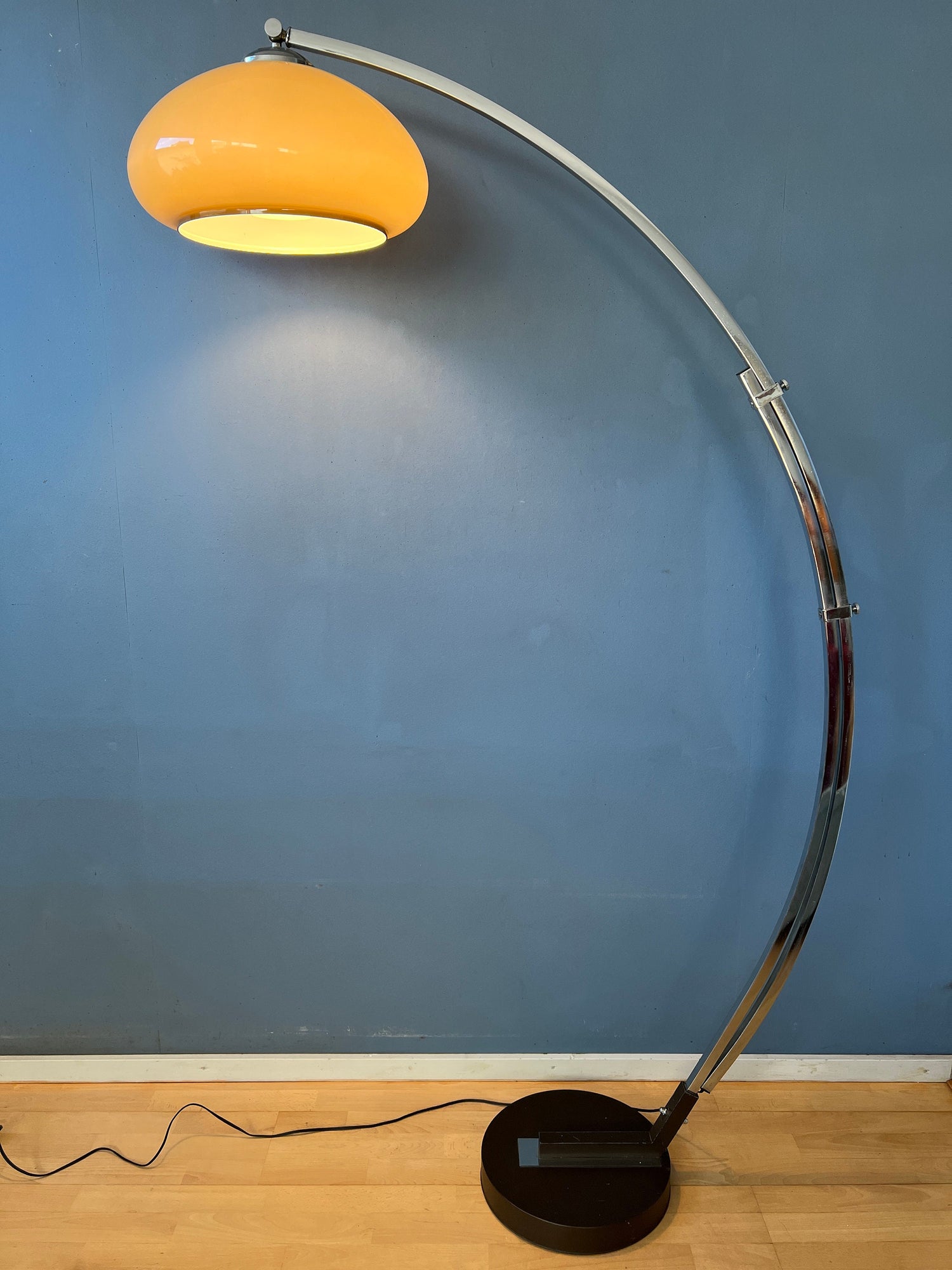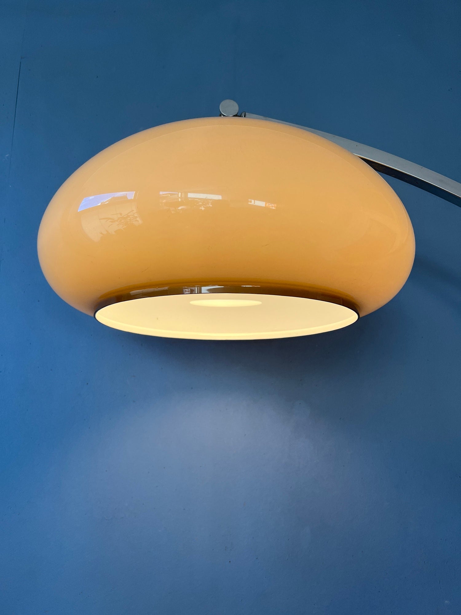 Very rare Italian space age arc floor lamp with beige mushroom shade attributed to Goffredo Reggiani The acrylic glass shade produces a delicate, warm glow. The height/length of the lamp can be adjusted with its extendable arm. The lamp requires one E26/27 (standard) lightbulb and currently has an EU-plug (easily used outside EU with plug-converter).
