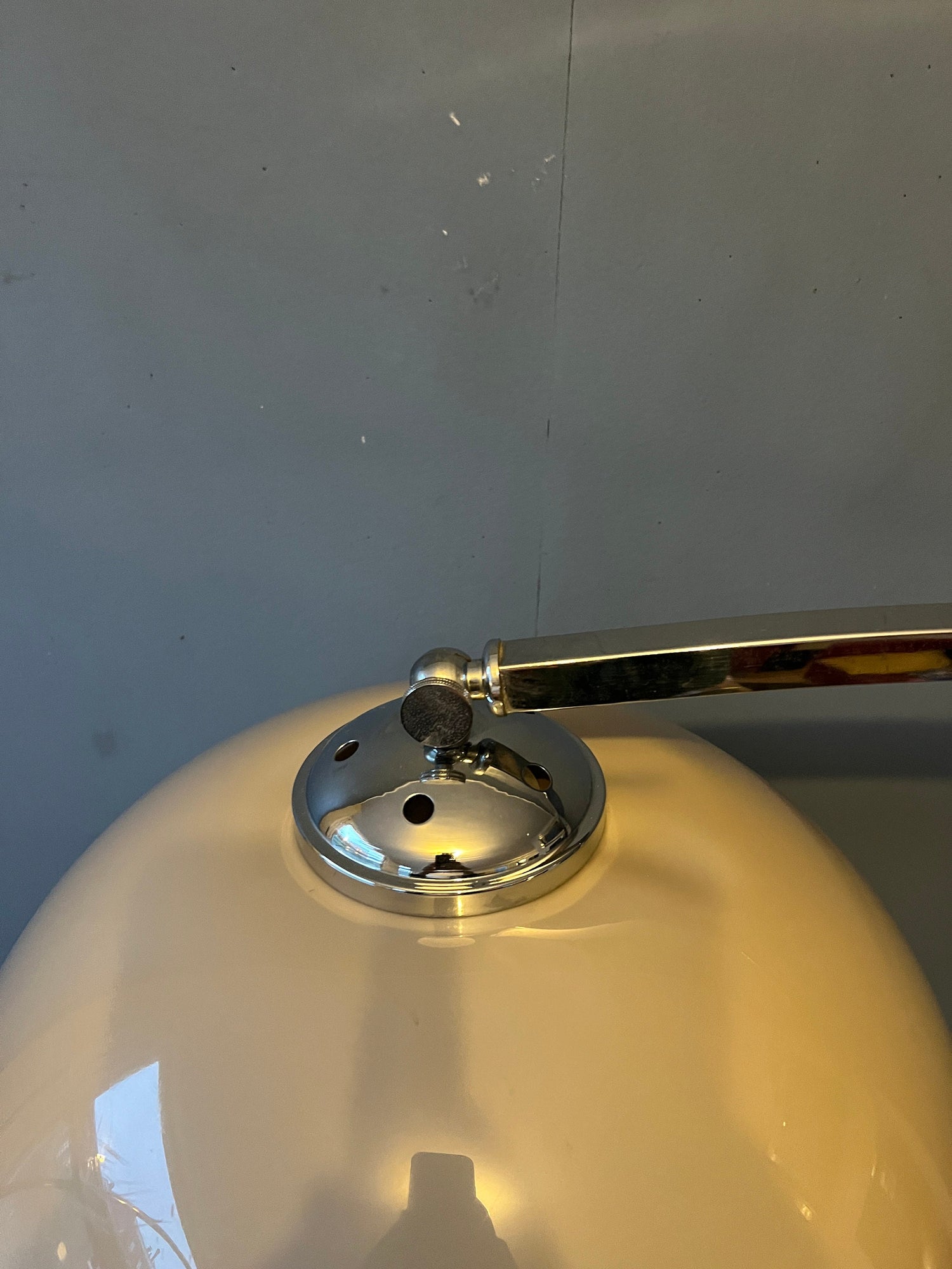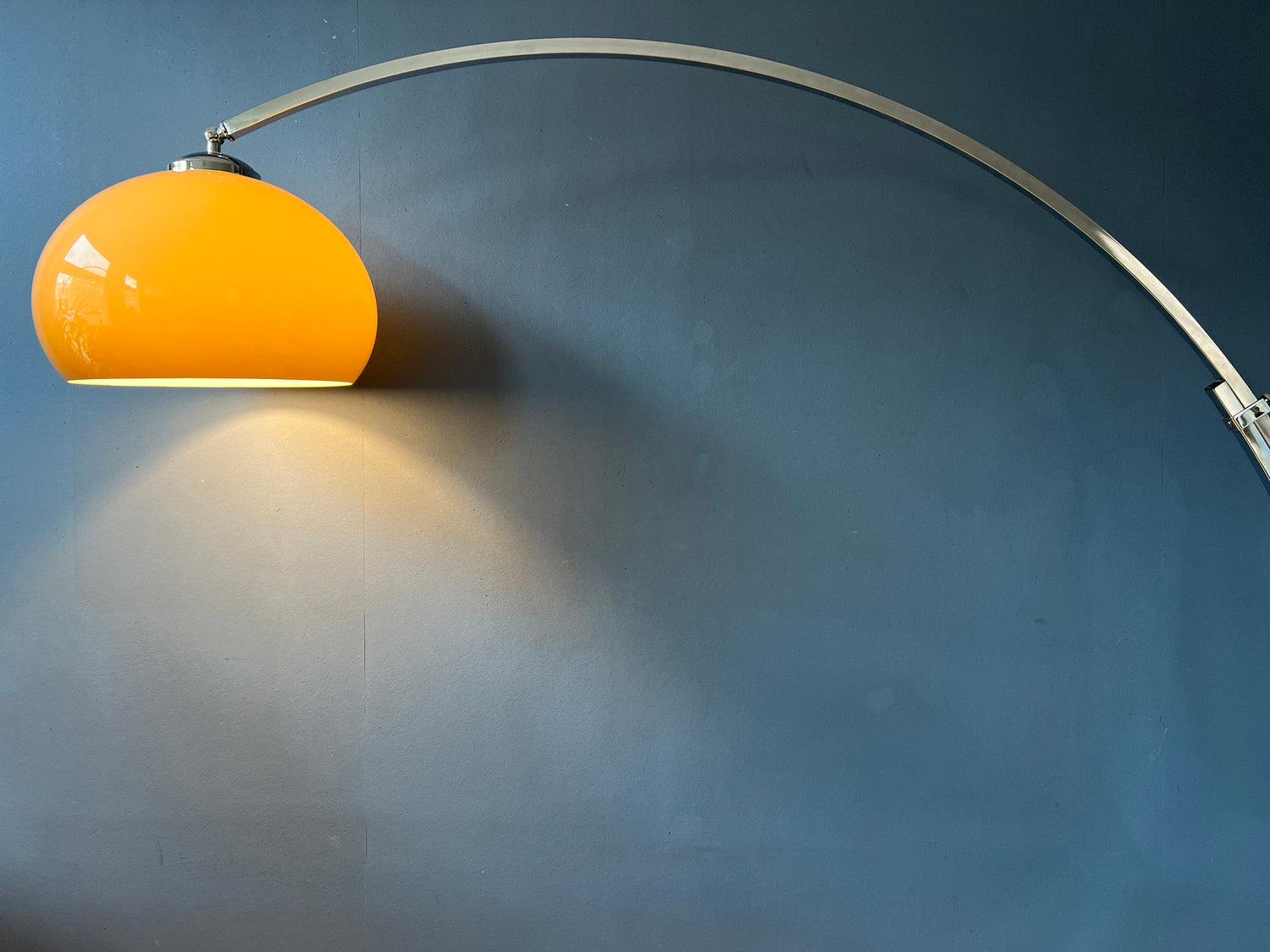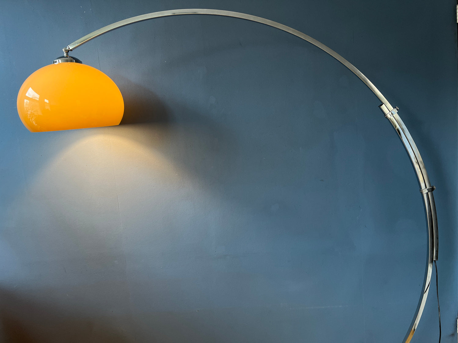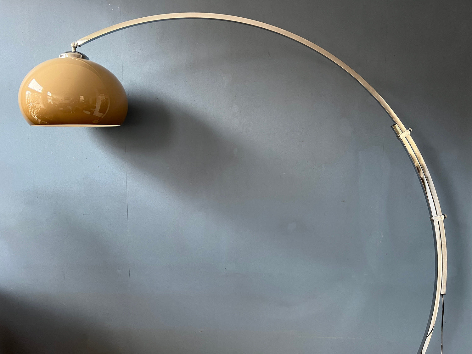 Very rare Italian space age arc floor lamp with beige mushroom shade attributed to Goffredo Reggiani. The acrylic glass shade produces a delicate, warm glow. The height/length of the lamp can be adjusted with its extendable arm. The lamp requires one E26/27 (standard) lightbulb and currently has an EU-plug (easily used outside EU with plug-converter).