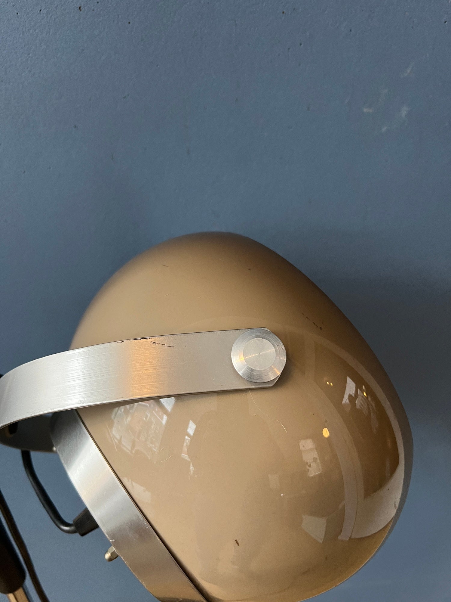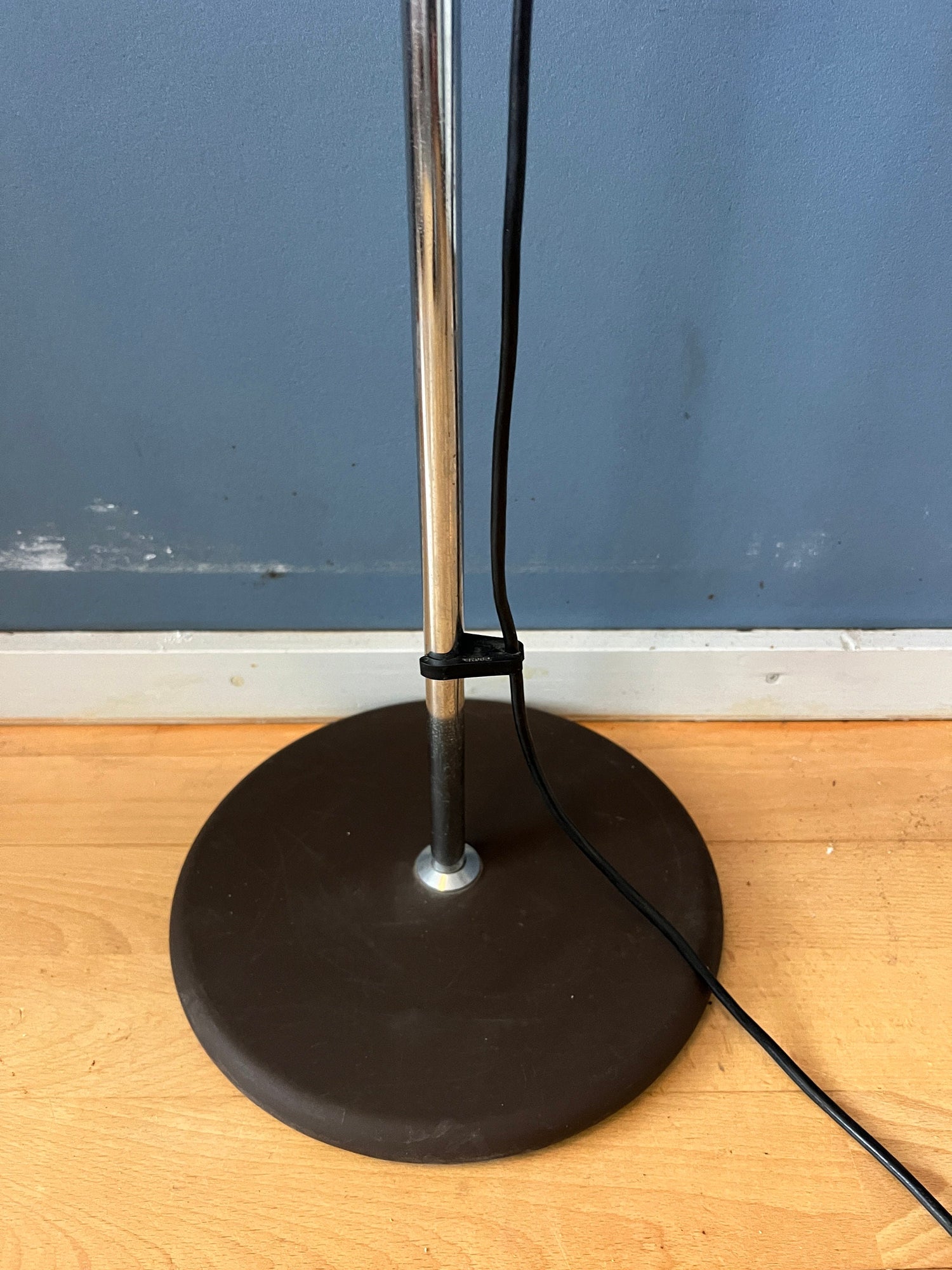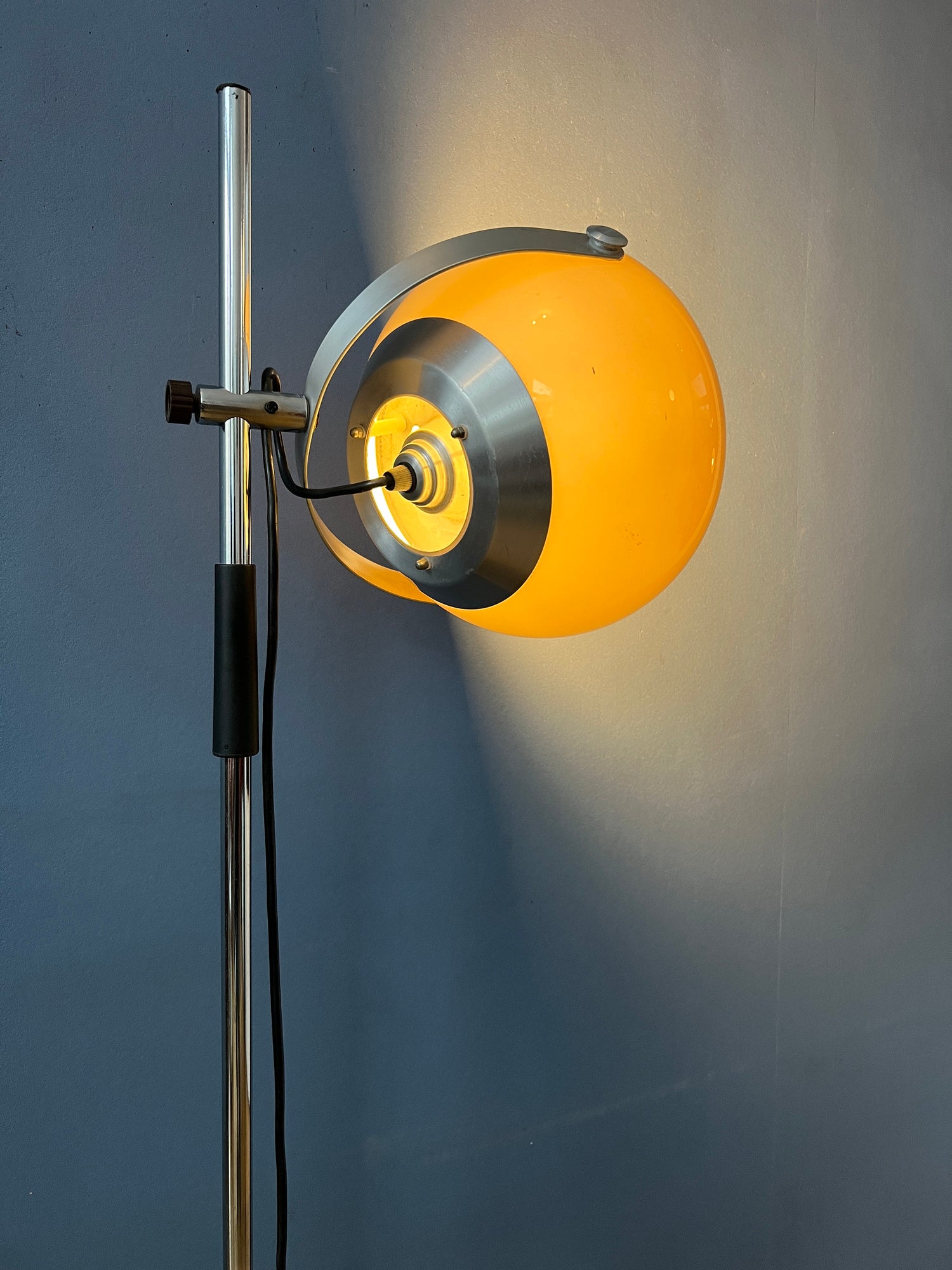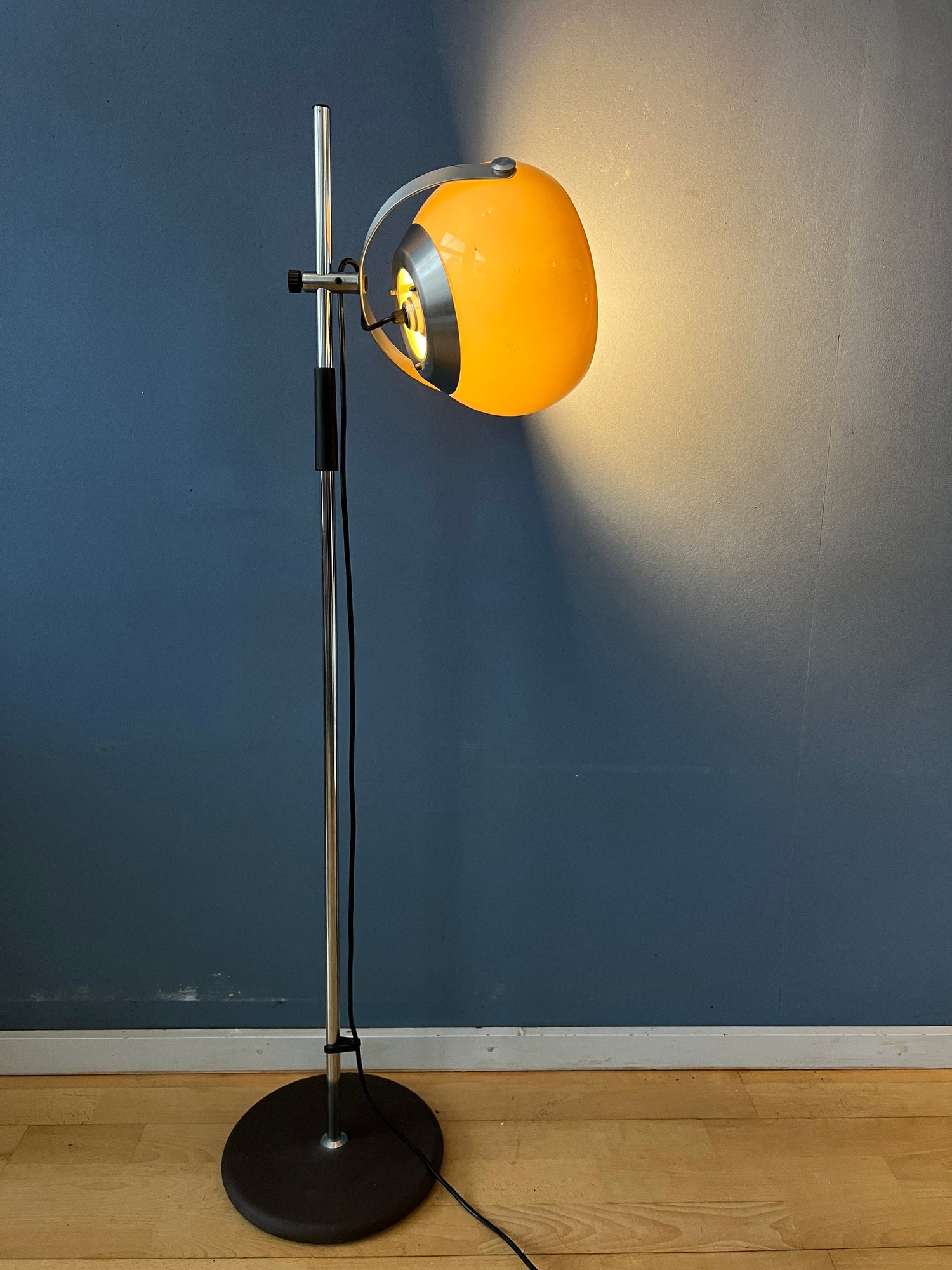 Small mid century mushroom floor lamp or table with a beautiful warm glow. The mushroom shade can be turned in any direction and move up and down the base. The lamp requires one E27/26 lightbulb and currently has an EU-plug (works outside EU with plug-converter).