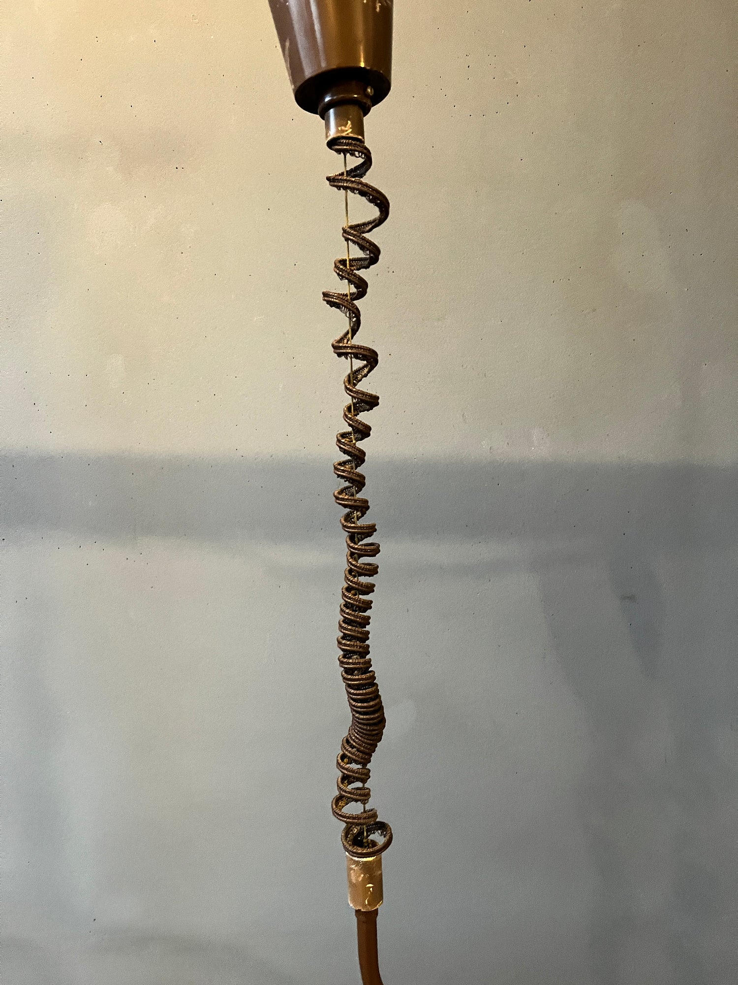 Herda's iconic pendant light with mushroom shade and decorative chrome shape. The mushroom shape is mocca-coloured and produces a warm light. The height of the lamp can easily be adjusted with the rise/fall mechanism. The lamp requires one E27/26 (standard) lightbulb.
