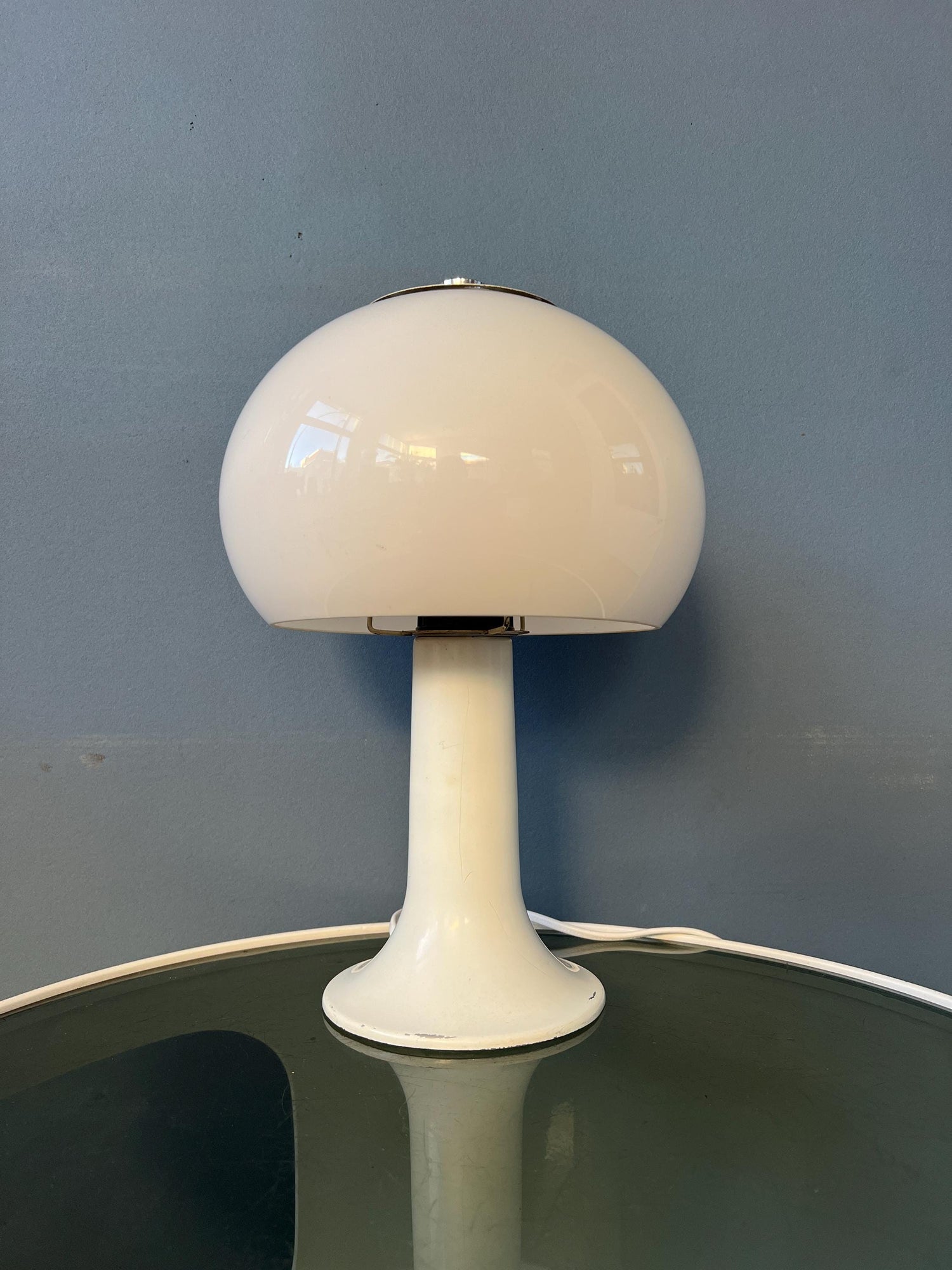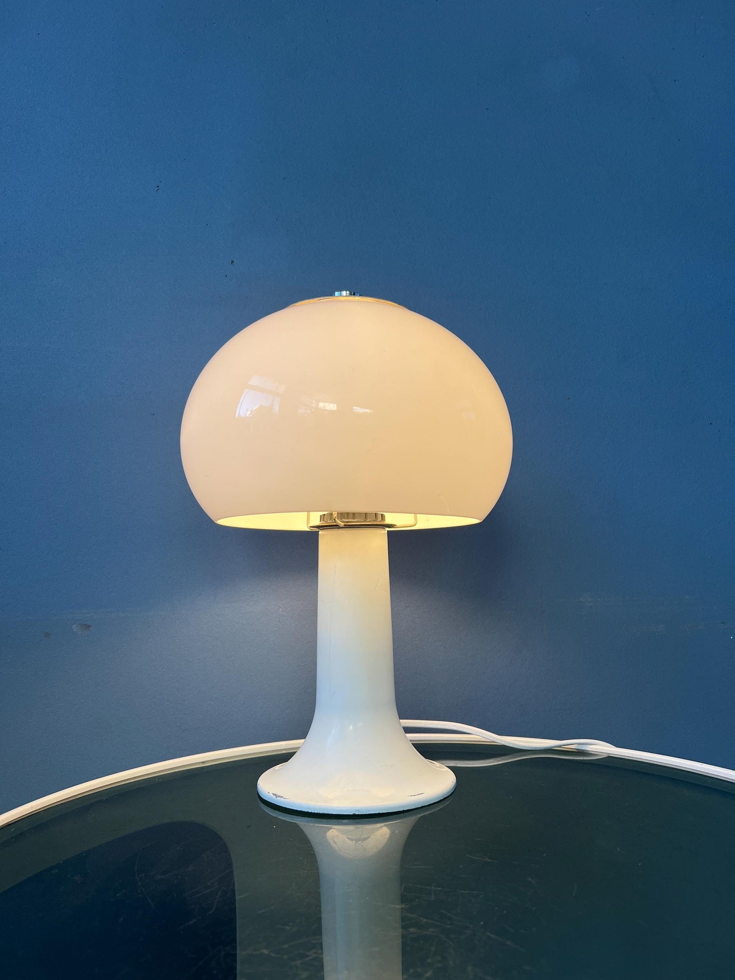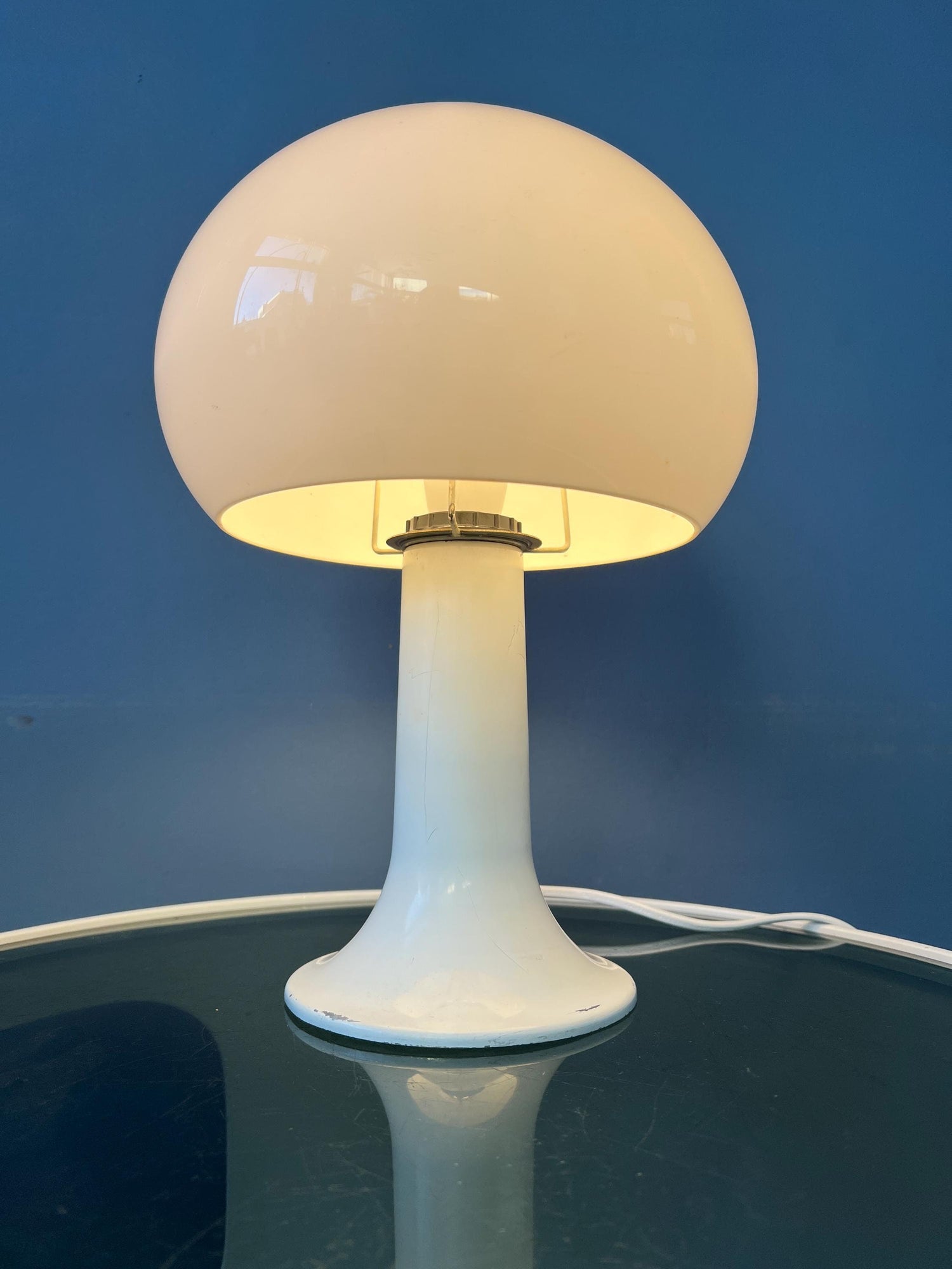 A cute classic mushroom table lamp by the Dutch brand Herda in white colour. The classy white mushroom shade produces a nice and warm light. The lamp requires one E27 (standard) lightbulb and currently has an EU-plug. Slight user-wear on the base, see last pictures.