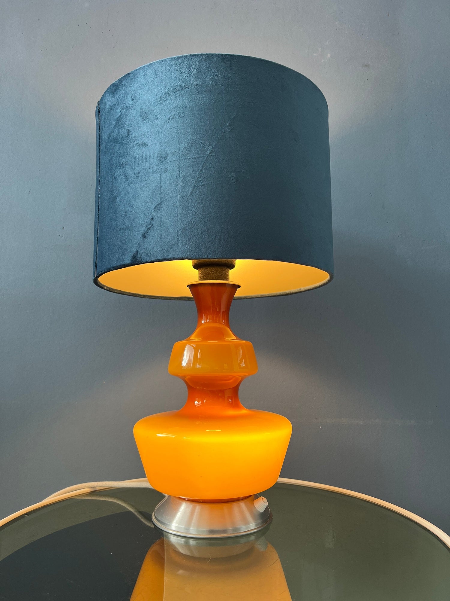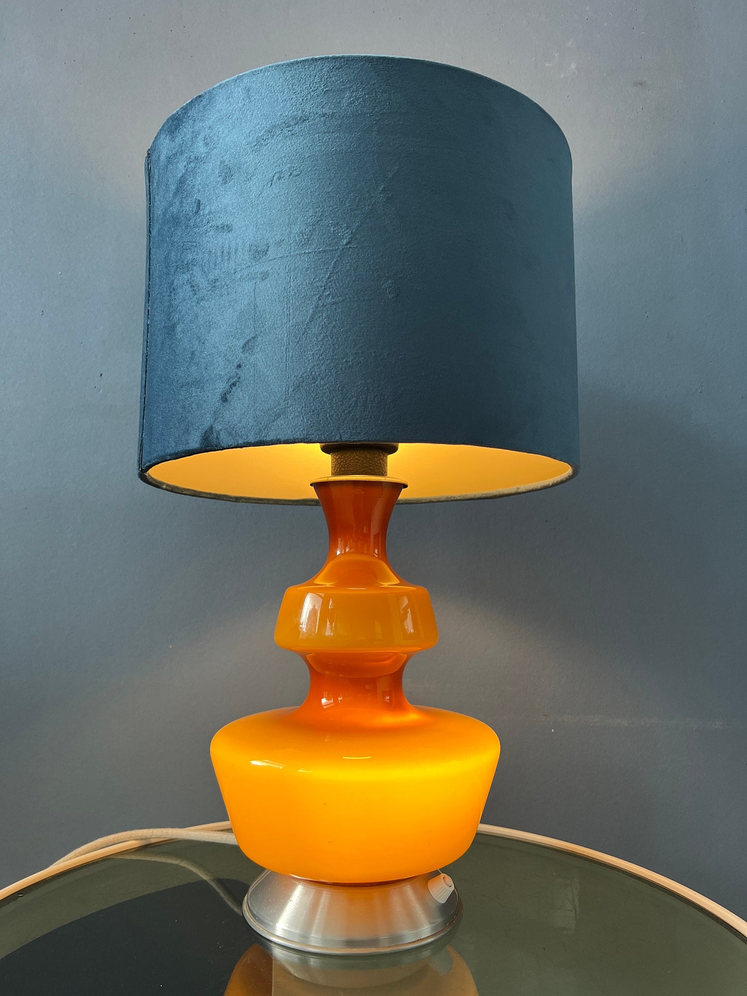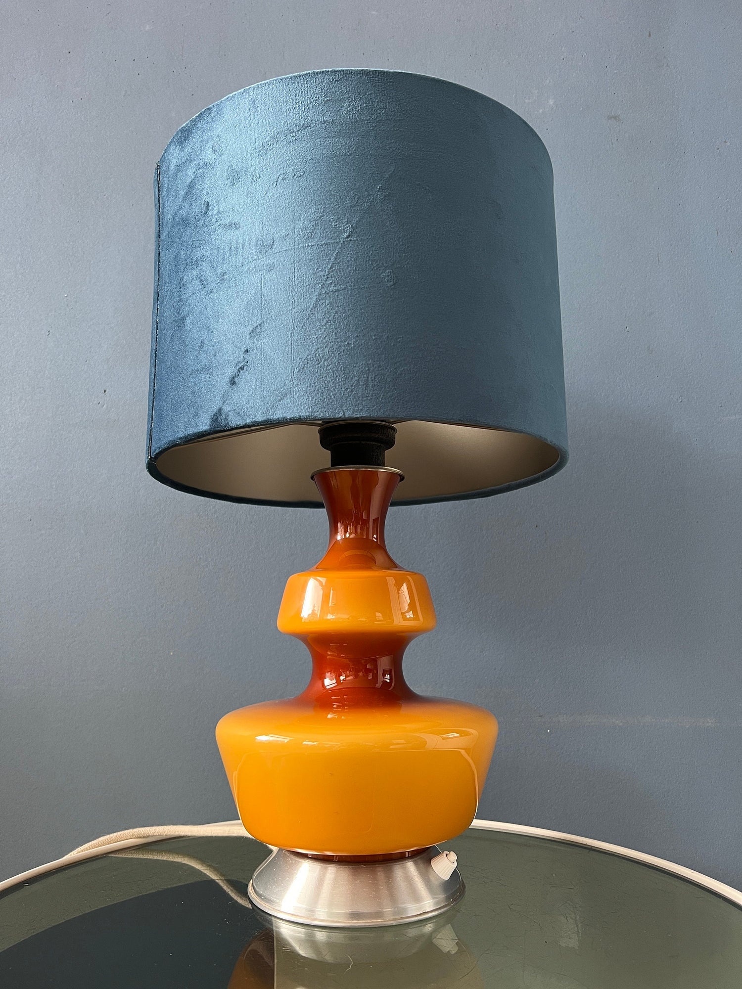 Often sought after mid century Holmegaard glass table lamp by Holmegaard. The lamp has both a light source above and in the base itself, creating an astonishing light effect. The velours blue shade is not original. The lamp requires one E27/26 lightbulb and currently has an EU-plug.