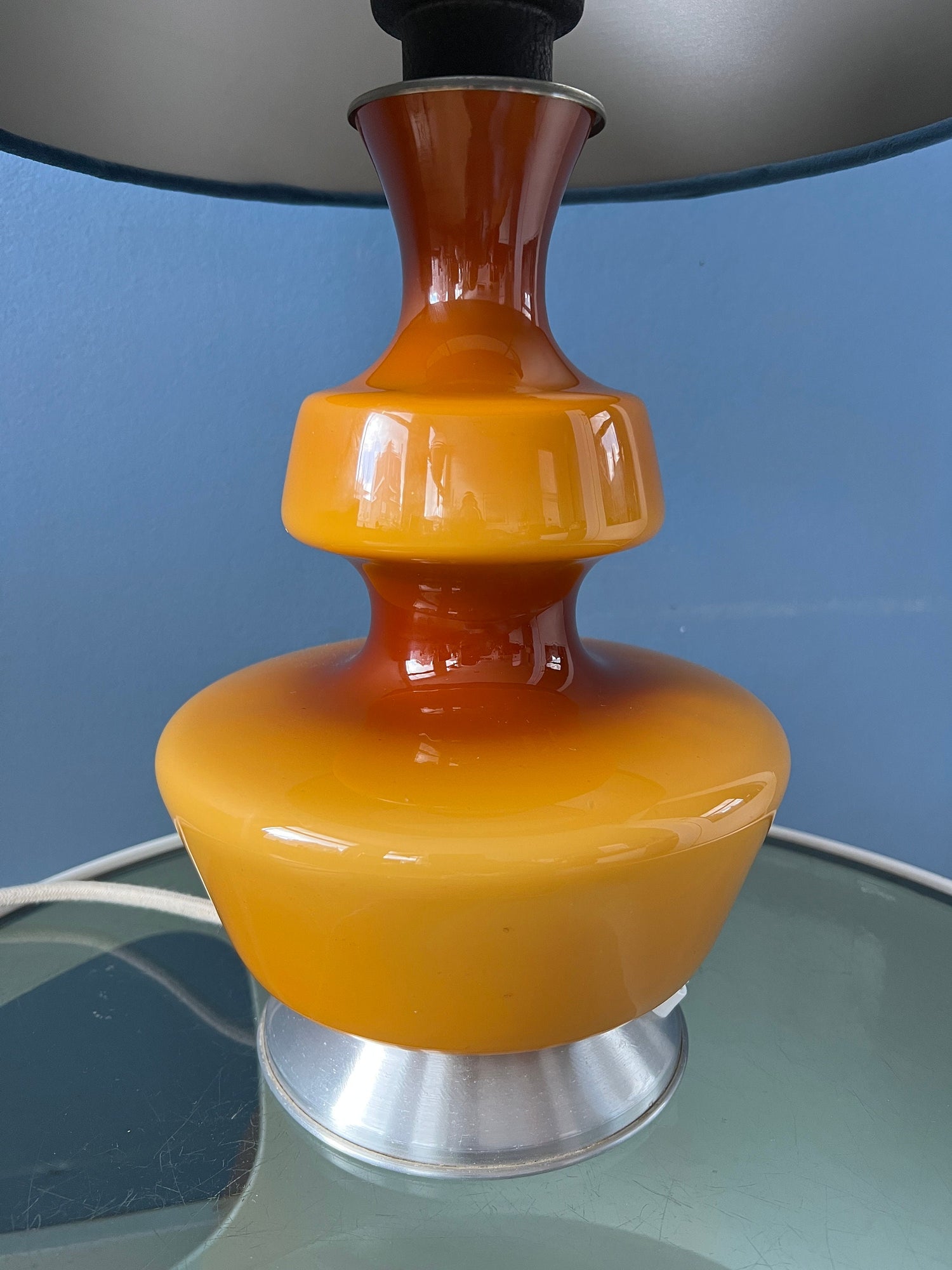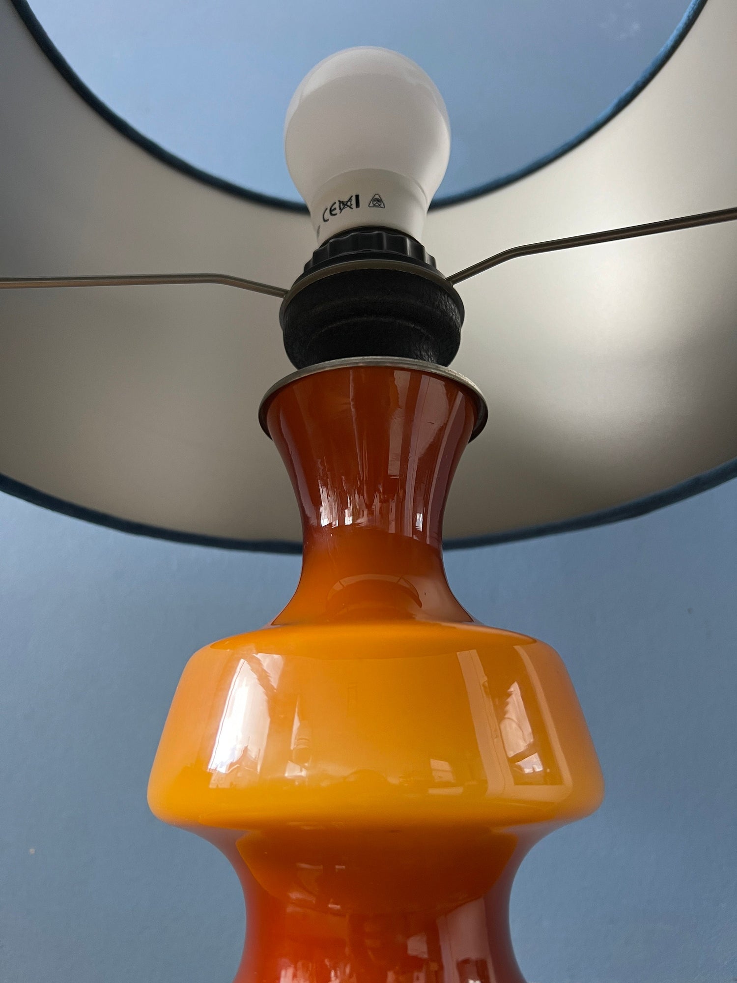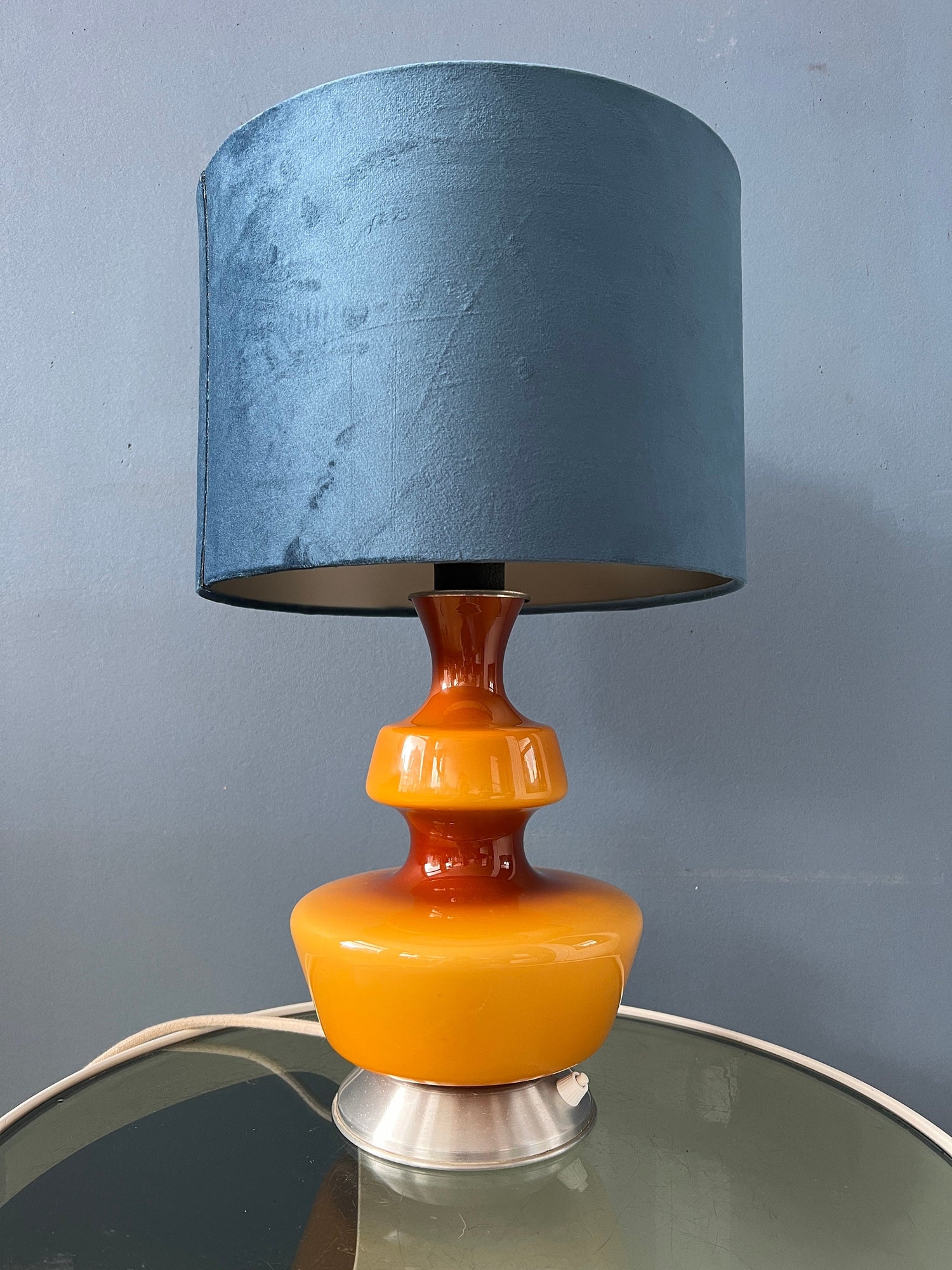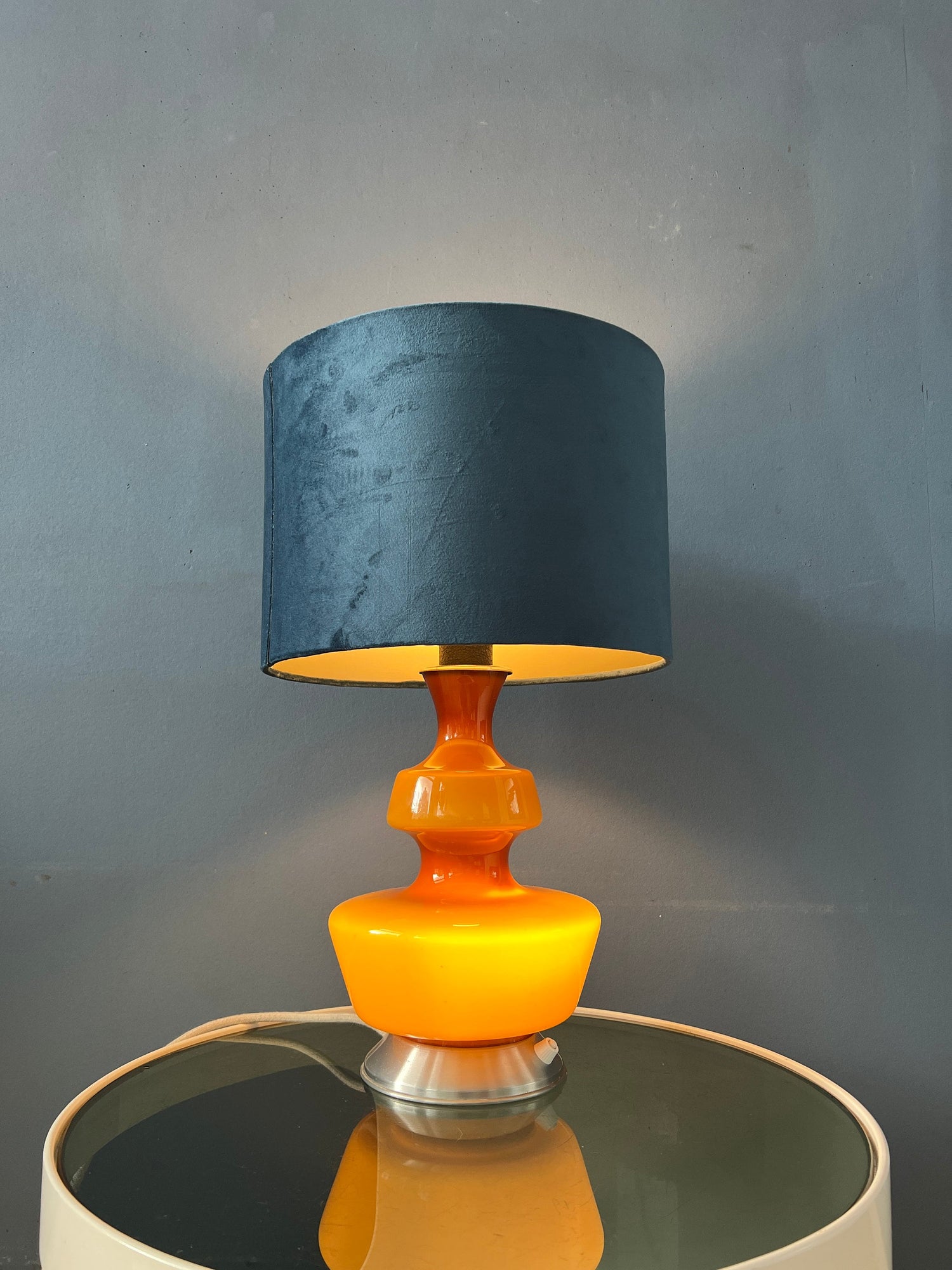 Often sought after mid century Holmegaard glass table lamp by Holmegaard. The lamp has both a light source above and in the base itself, creating an astonishing light effect. The velours blue shade is not original. The lamp requires one E27/26 lightbulb and currently has an EU-plug.