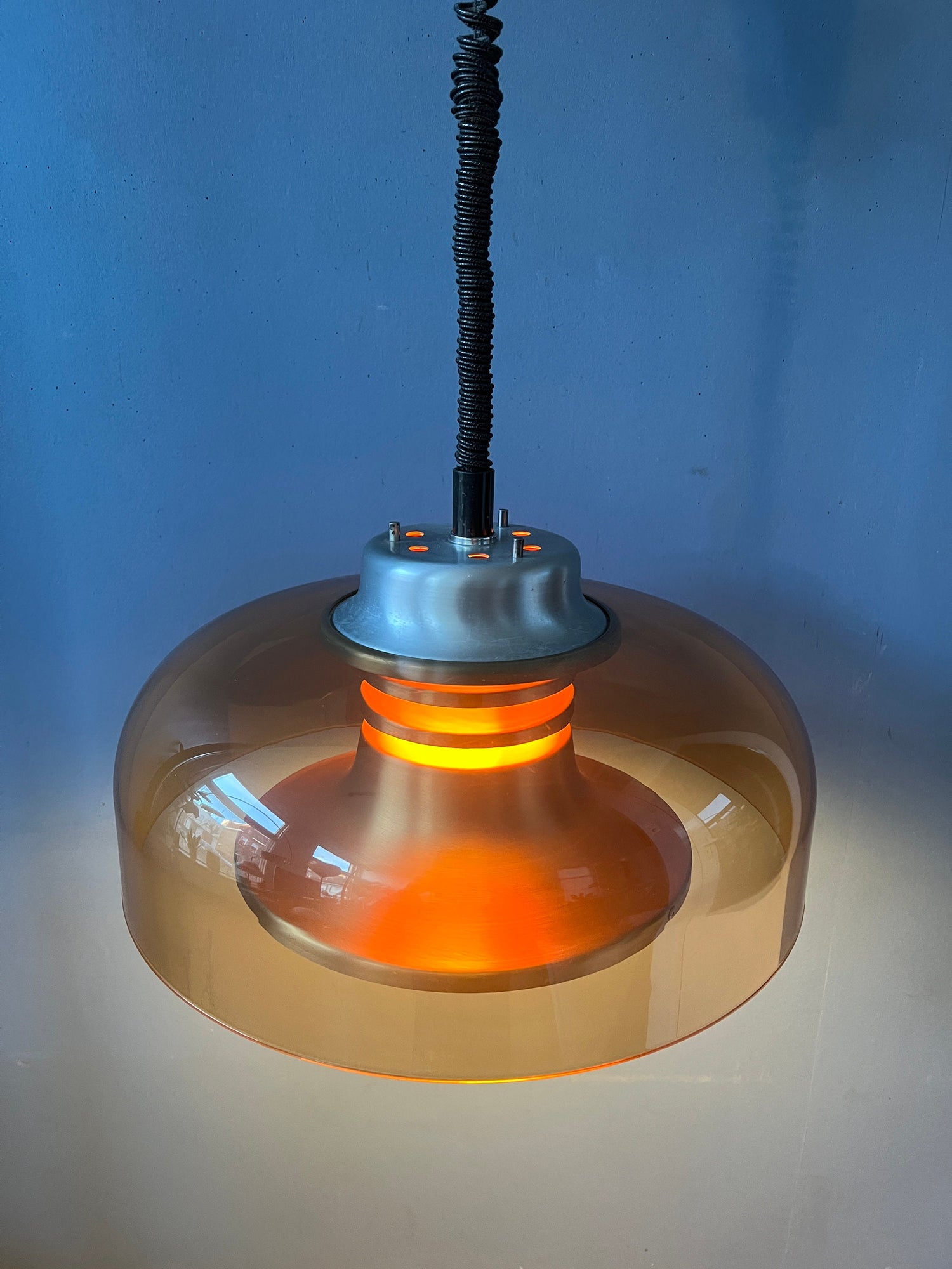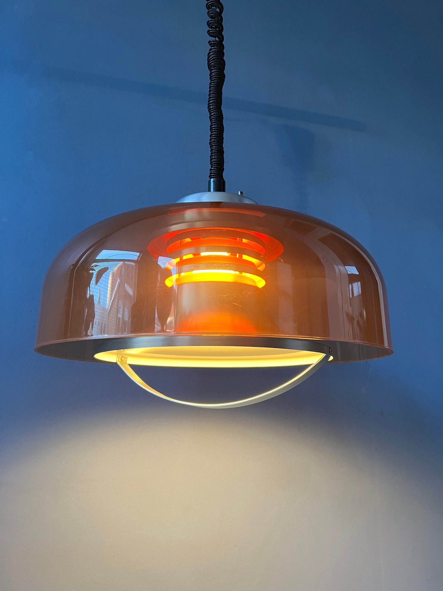 Space age pendant light by the Dutch brand Herda with beautiful orange glow. The lamp has an acrylic glass outer shade and an aluminium inner shade. The lamp requires one E27/26 lightbulb.