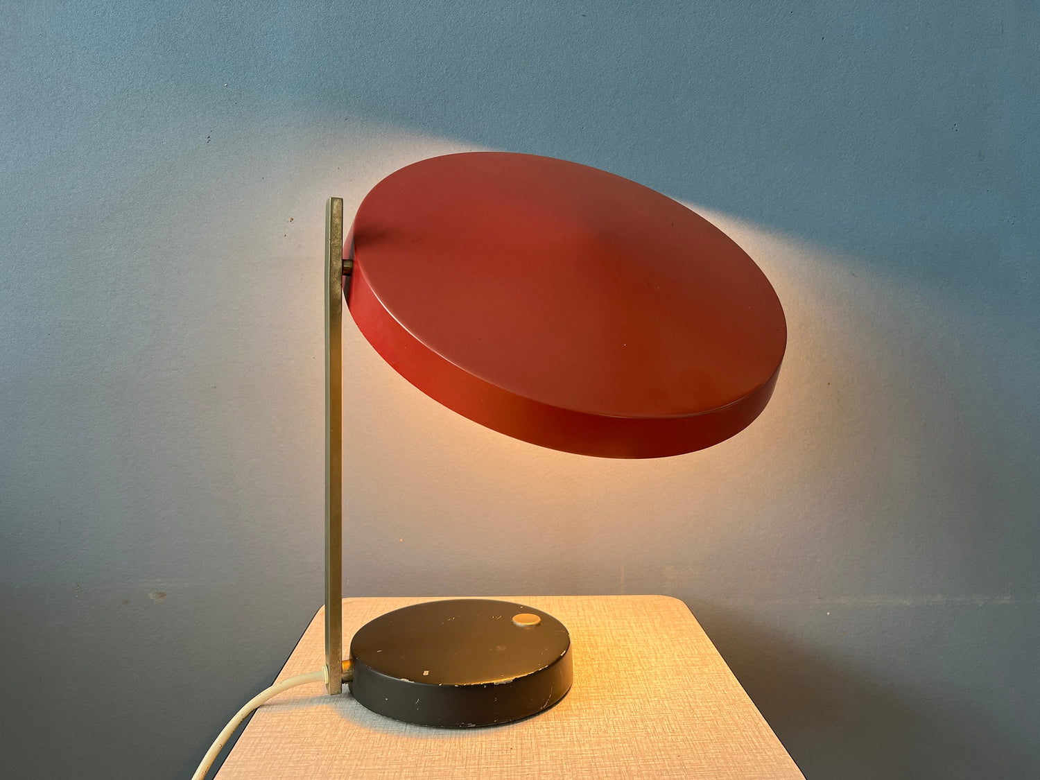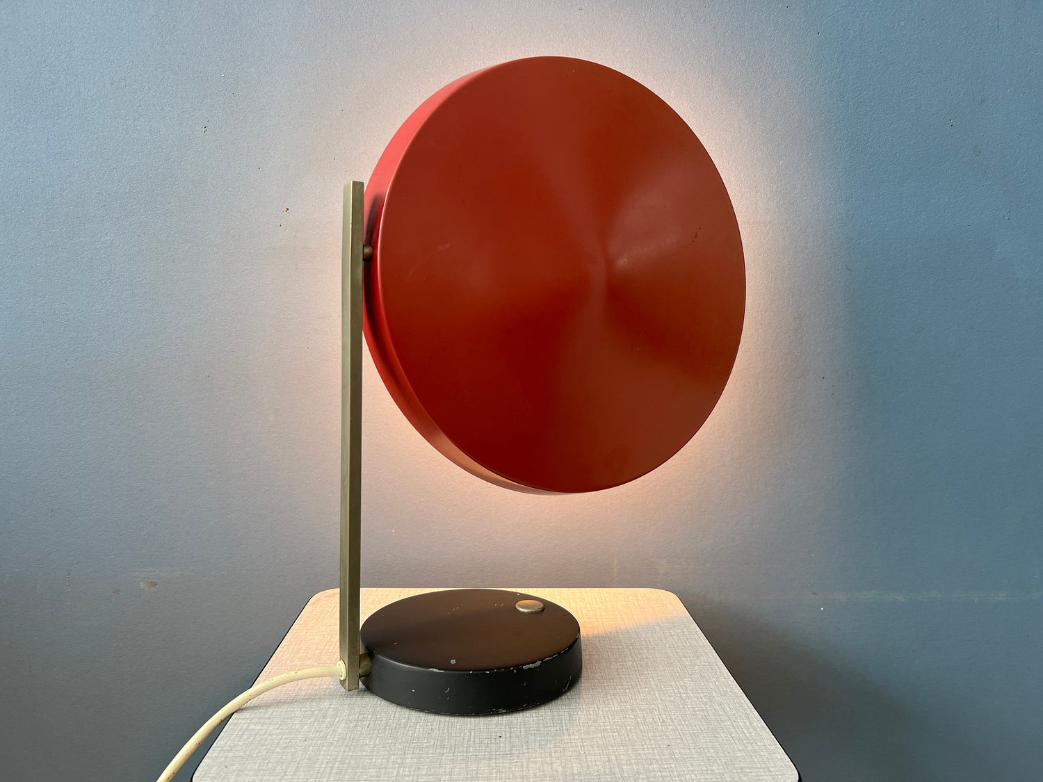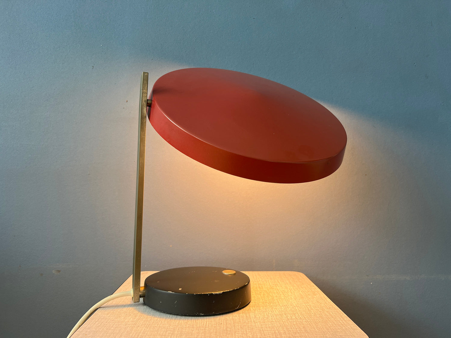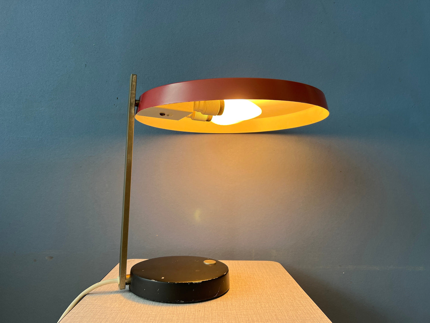 Vintage Egon Hillebrand 'Oslo' Table Lamp by Heinz Pfaender. The lamp has an unique design with a dark red UFO-like shade that can be turned in different directions. The lamp requires two E14 lightbulbs and currently has an EU-plug.