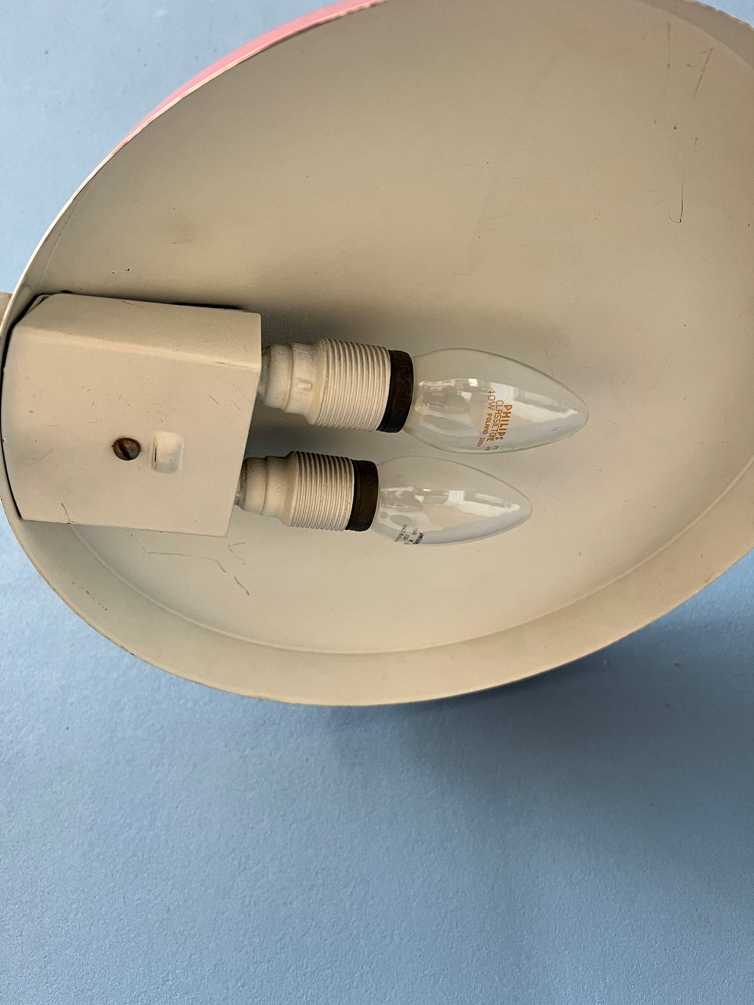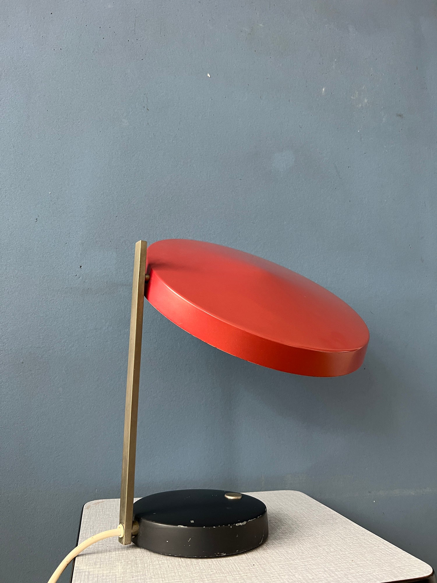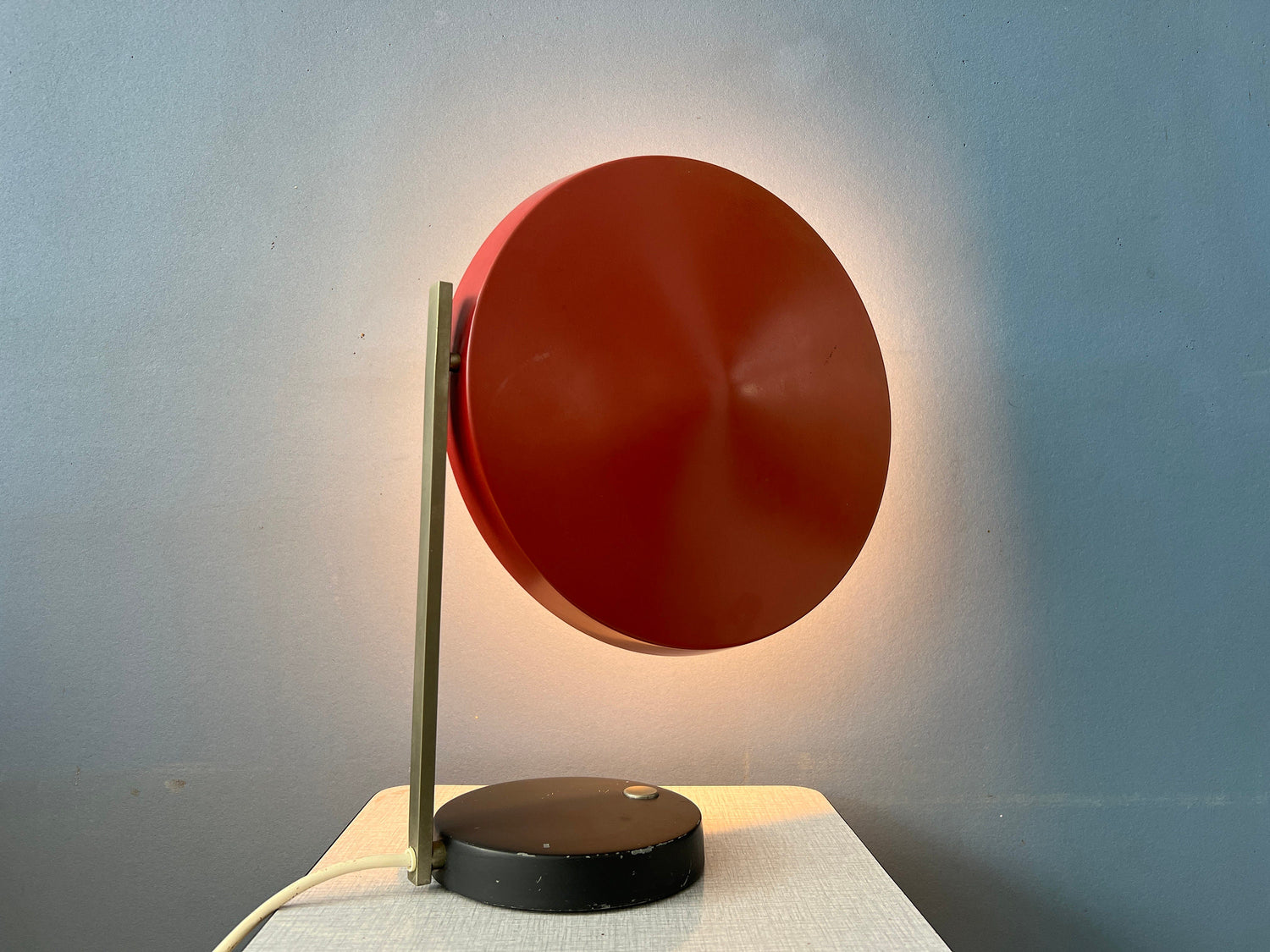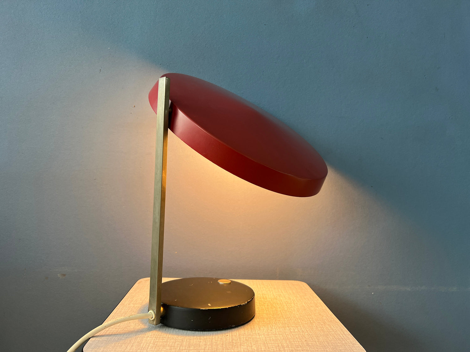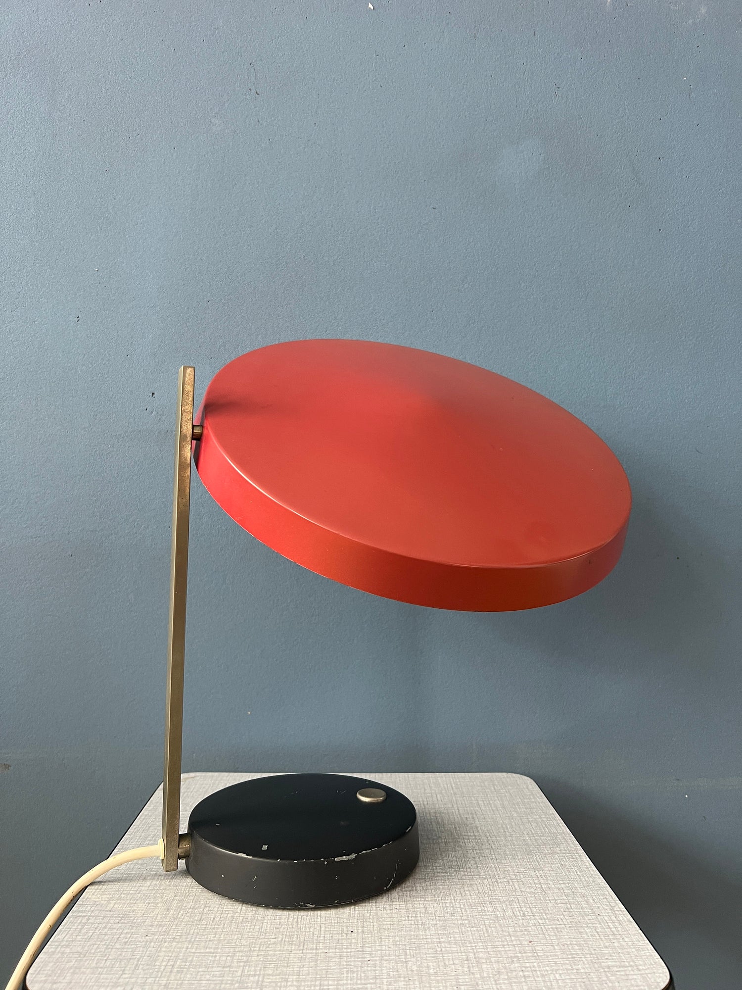 Vintage Egon Hillebrand 'Oslo' Table Lamp by Heinz Pfaender. The lamp has an unique design with a dark red UFO-like shade that can be turned in different directions. The lamp requires two E14 lightbulbs and currently has an EU-plug.