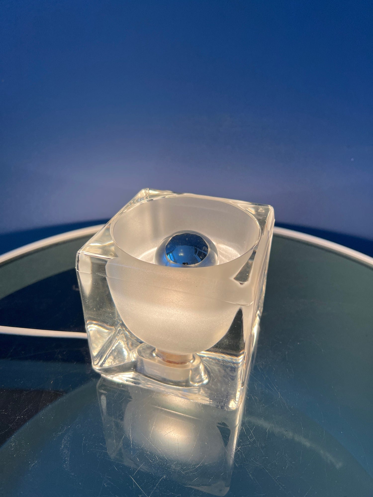Mid century 'Ice Cube' glass table lamp by Peill & Putzler. Due to the clear glass and mirror-bulb the lamp creates a magnificent light effect. The lamp currently has an EU-plug (usable outside EU with plug-converter), the bulb comes included.