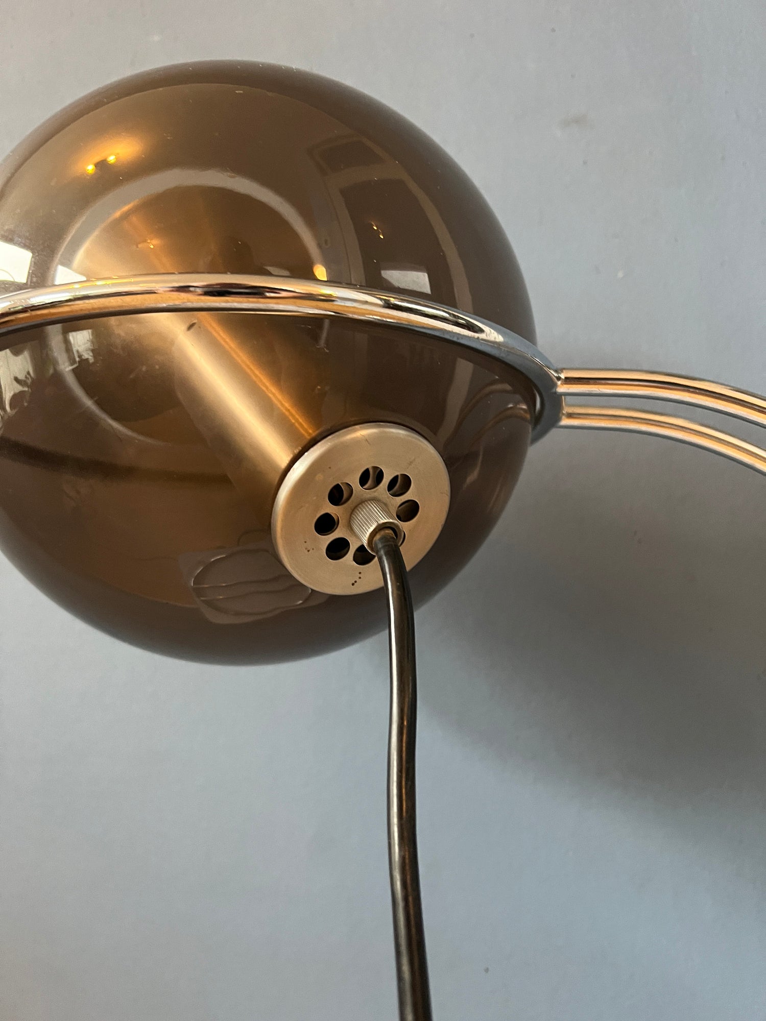 A very rare RAAK Globe table lamp by Frank Ligtelijn with glass eyeball shade. The shade can be placed in the metal ring holder in any direction desirable. The lamp requires one E27 (standard) lightbulb and currently has an EU-plug.